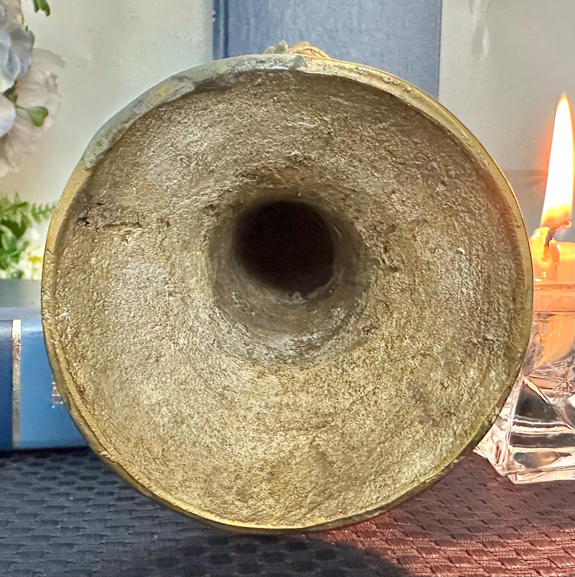 This piece is highly decorated with figures of Cobra snakes, men with Indian elephant style masks, men holding basket of food, small dogs and swirled type coins on the edges. The process to make these types of lamps is quite involved and very time consuming and a true art form. There are videos on the web that show the process and are interesting to watch.