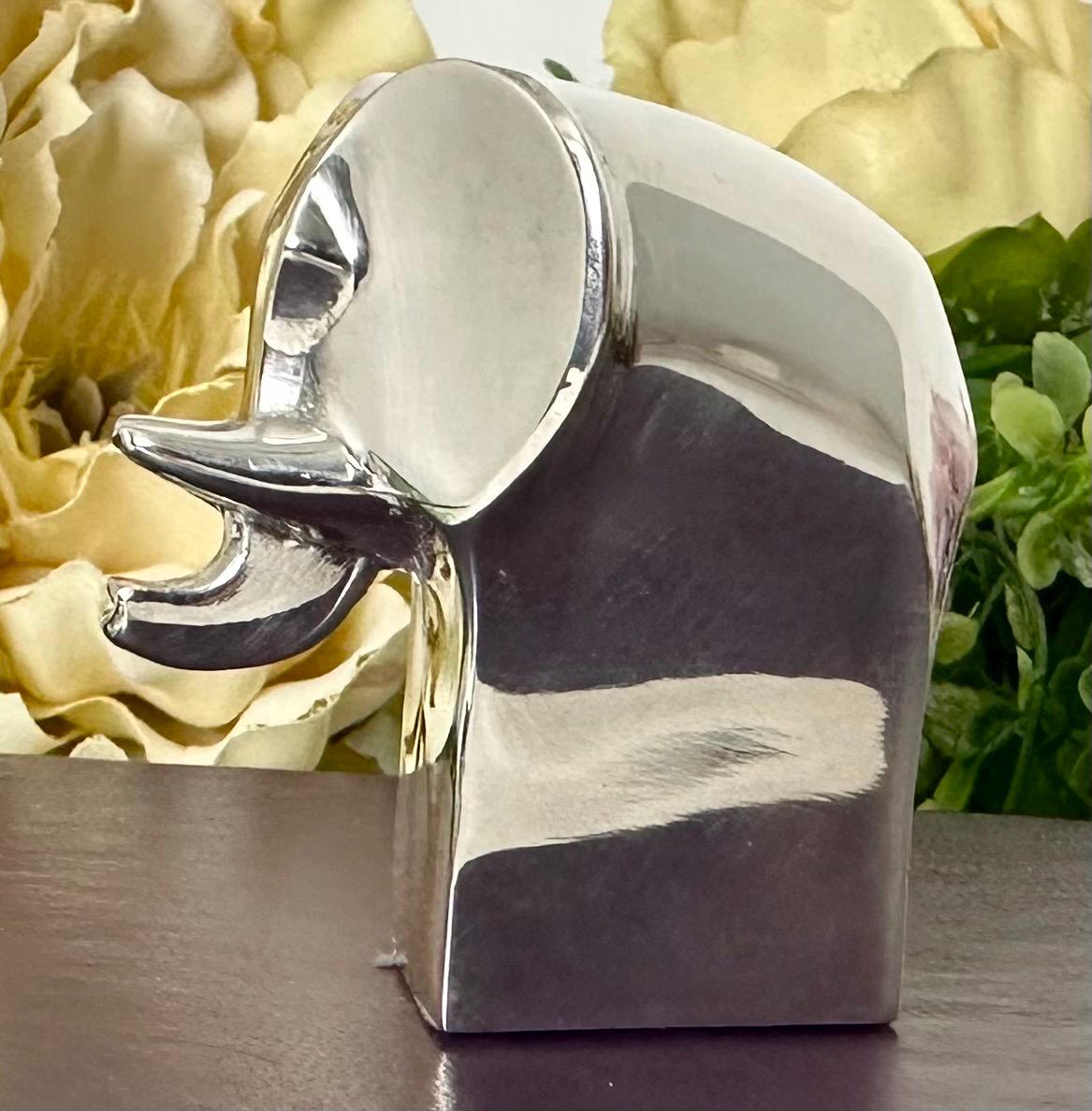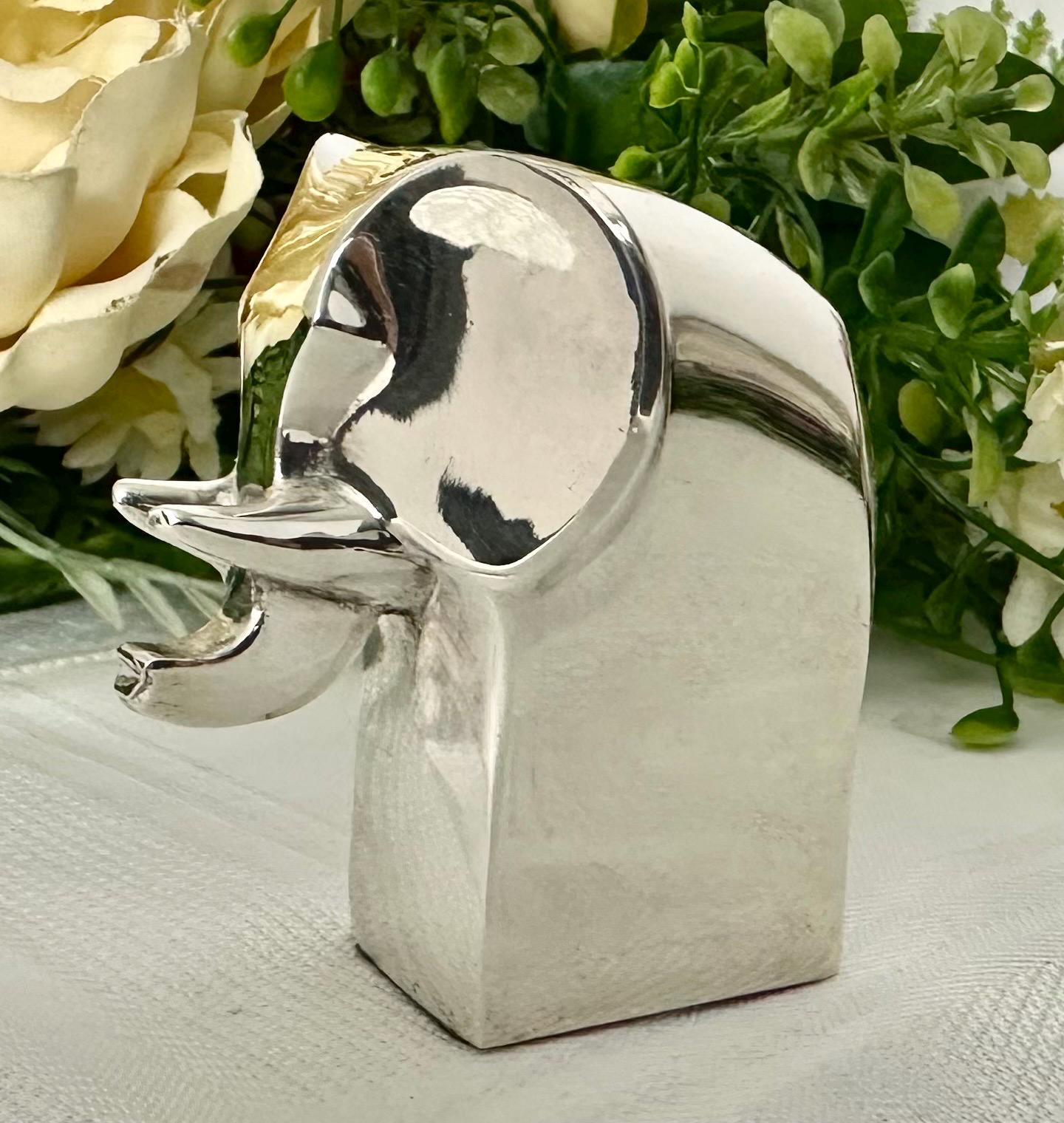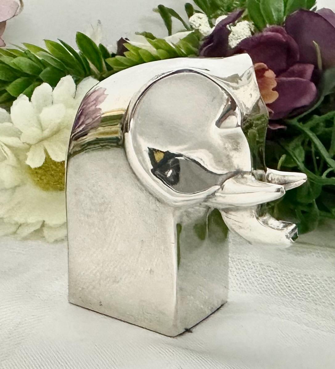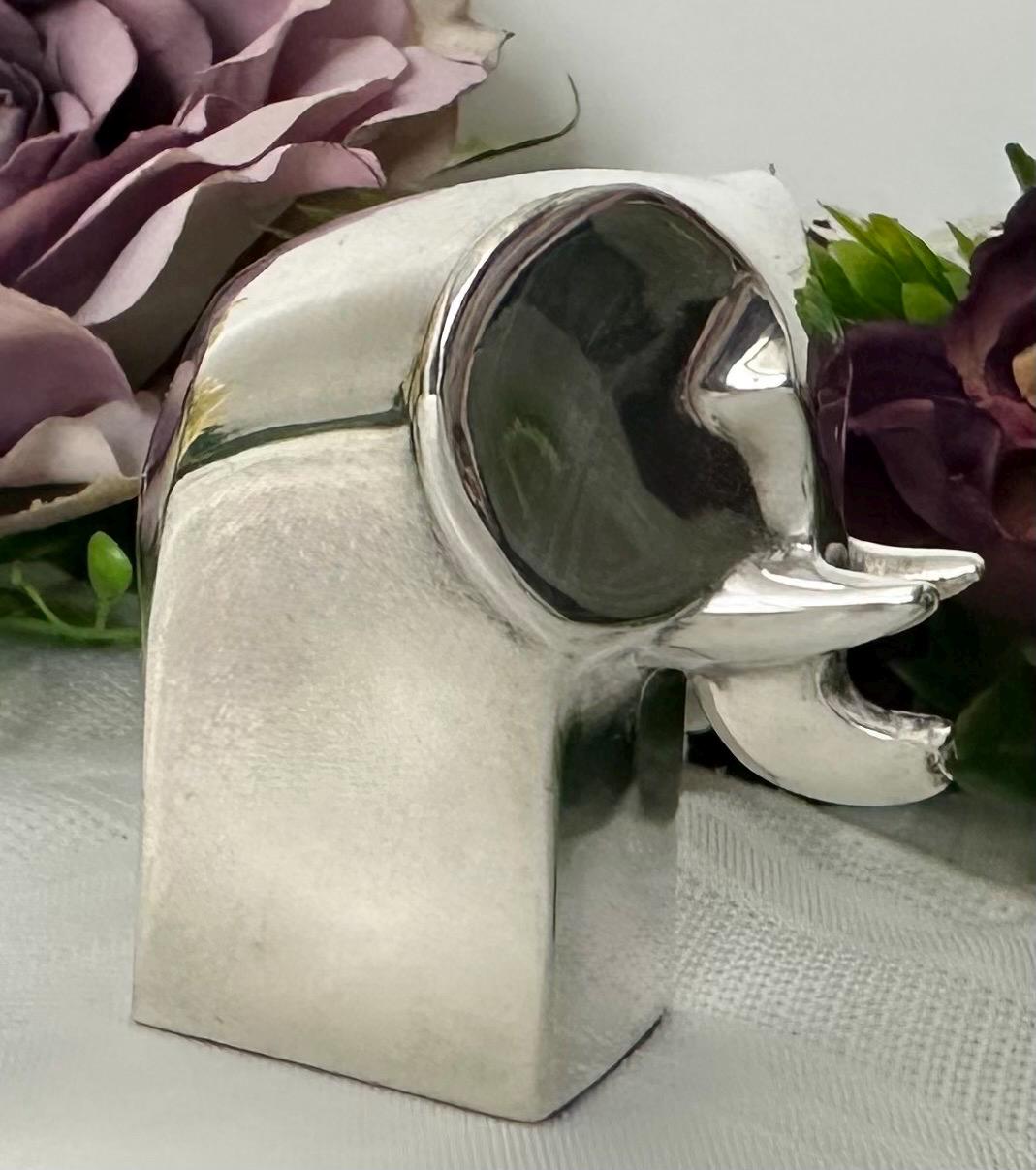 This is for a cute solid Gunnar Cyren Dansk Design Silver plated mini Elephant from Japan. It is such a cute and super shiny guy! He would work as a small paperweight or just absolutely any addition to an elephant lovers collection! It has a makers signed plate on the base of it and measures 2.25 inches tall x 1.5 inches wide and 2 1/8 inches deep. This sweet Elephant figurine was made in the 1980's.