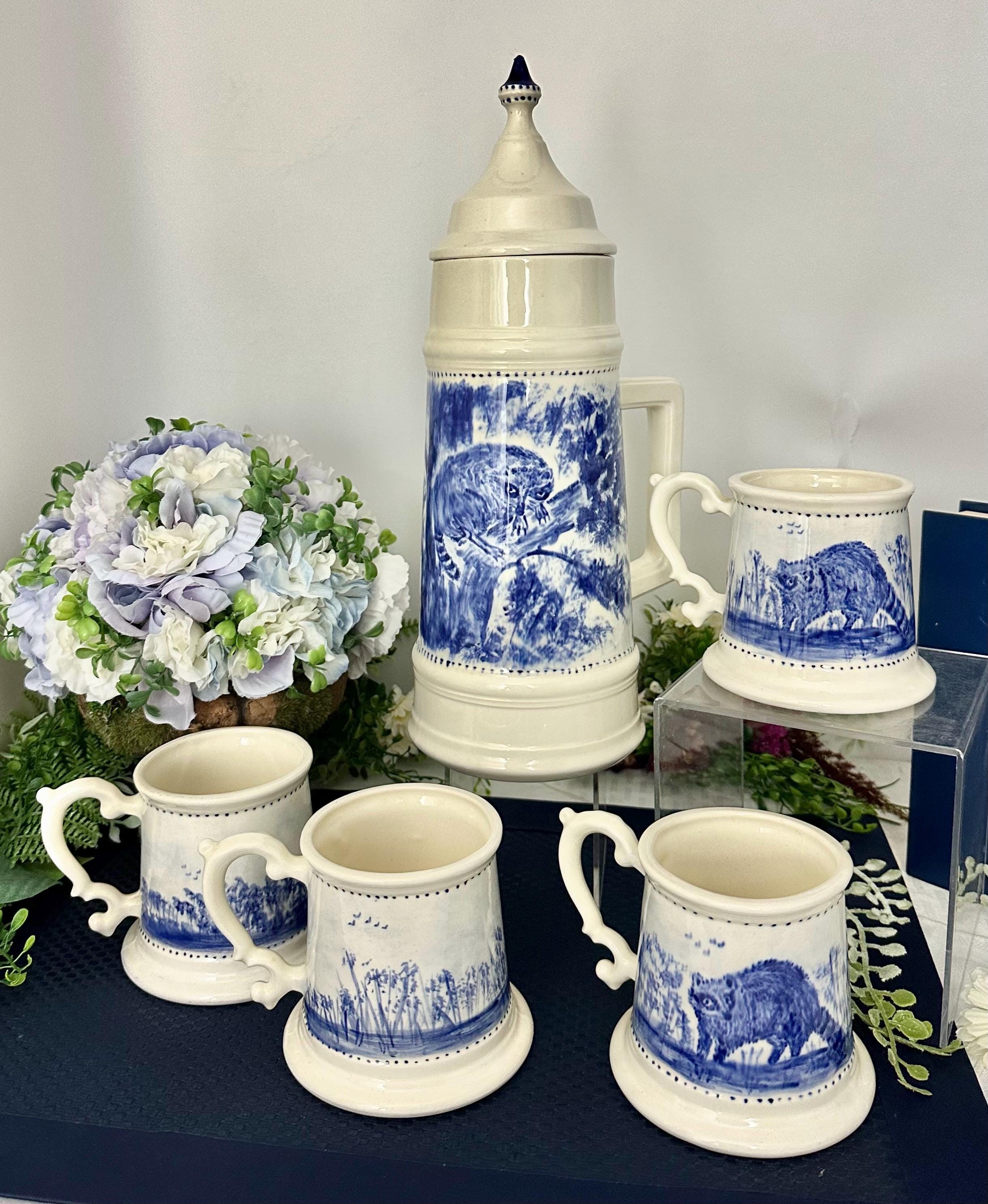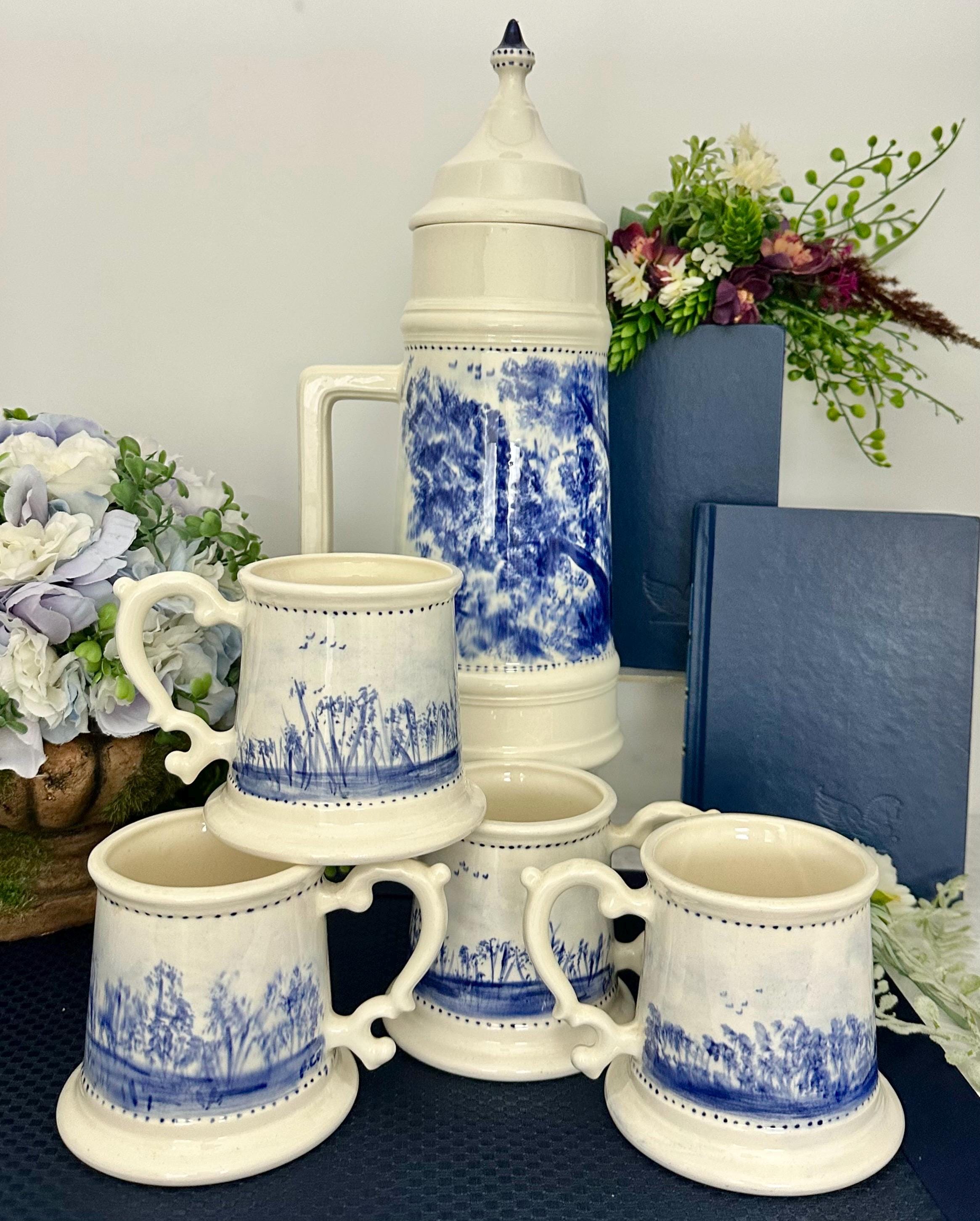 *** The pieces are in wonderful condition with one of the cups having a chip on the outside of one of the handles, that has been repaired. The handle of the "stein" has one small knick. There are no other issues that I have noted, which is a rare and amazing set that this is from the 1950's as was obviously taken care of and most likely display pieces.
