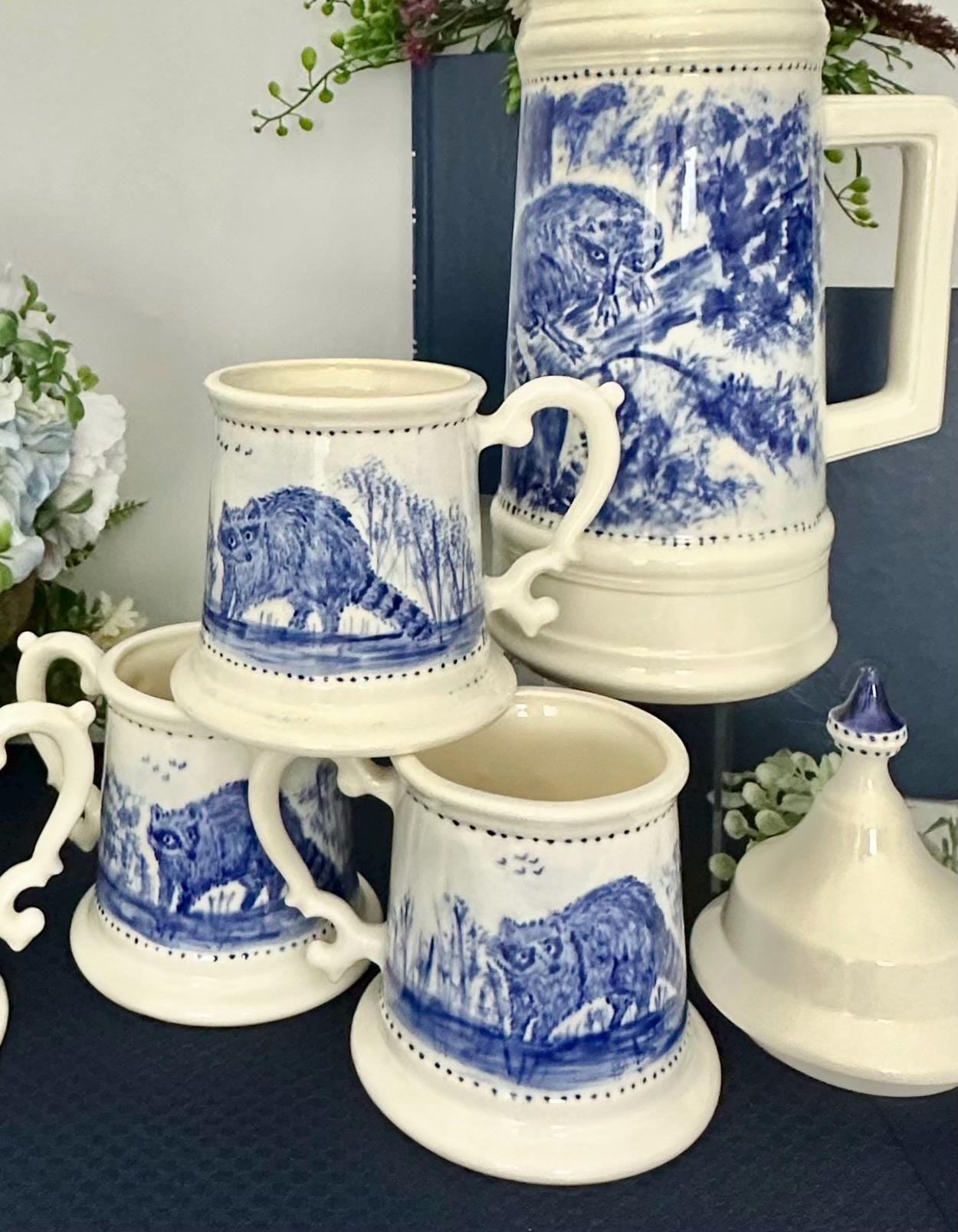 Each piece is hand painted on a cream ceramic base. Depicted in the pictures are raccoons and trees along with another raccoon in a nearby tree.