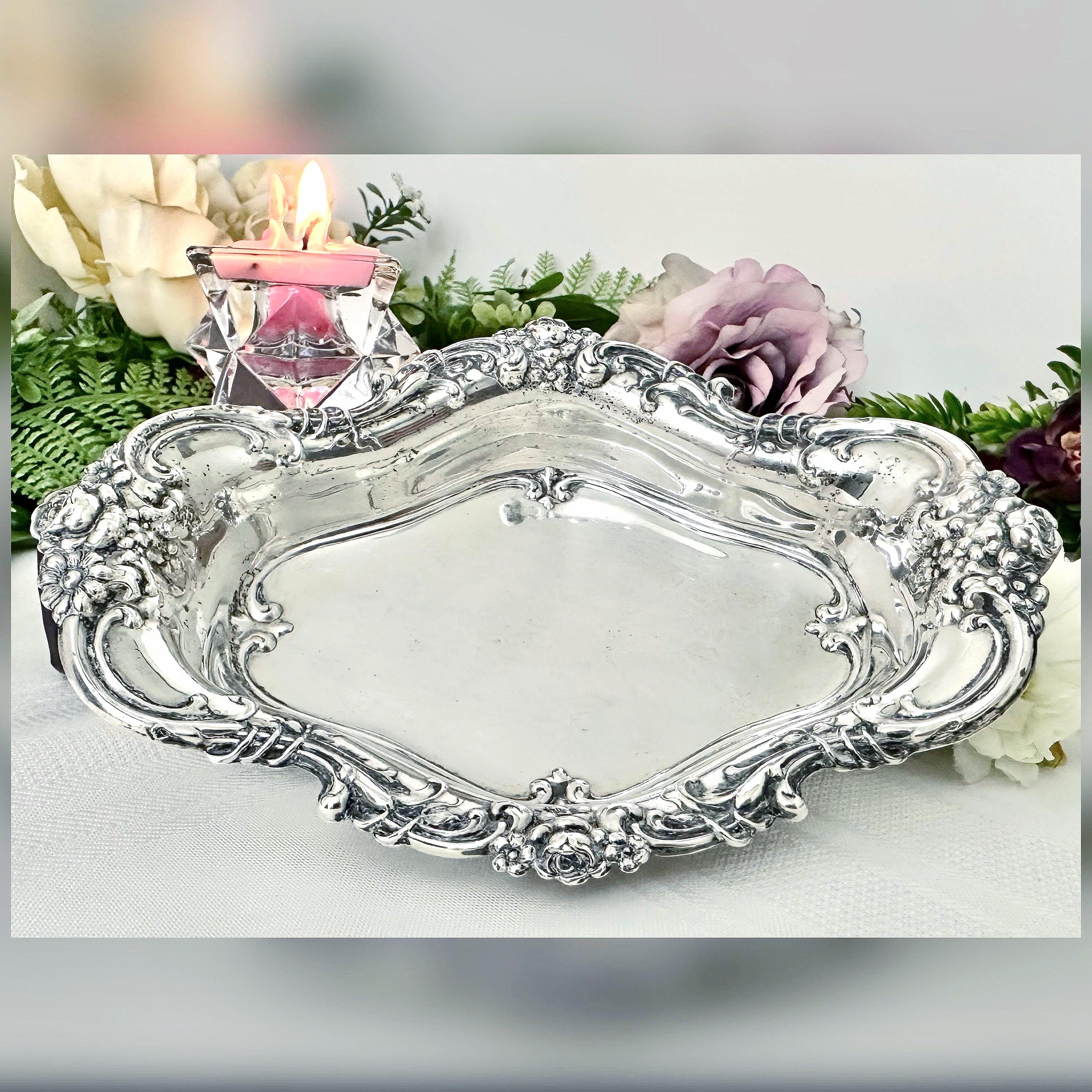 This is for a Wallace Royal Rose Sterling Silver Nut Bowl . This sterling dish is a vintage candy bowl, bon bon dish or nut bowl. The Wallace hollowware piece is crafted of sterling silver with a Victorian style and produced from 1962 to 1996.