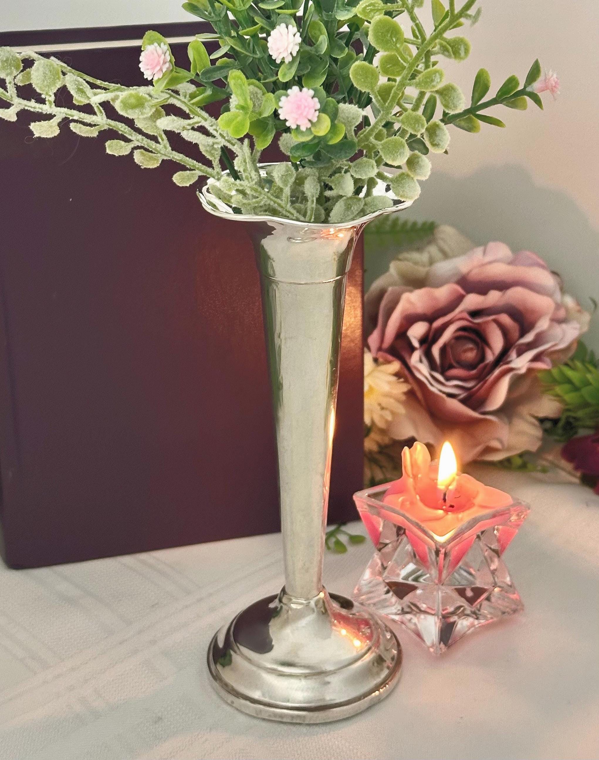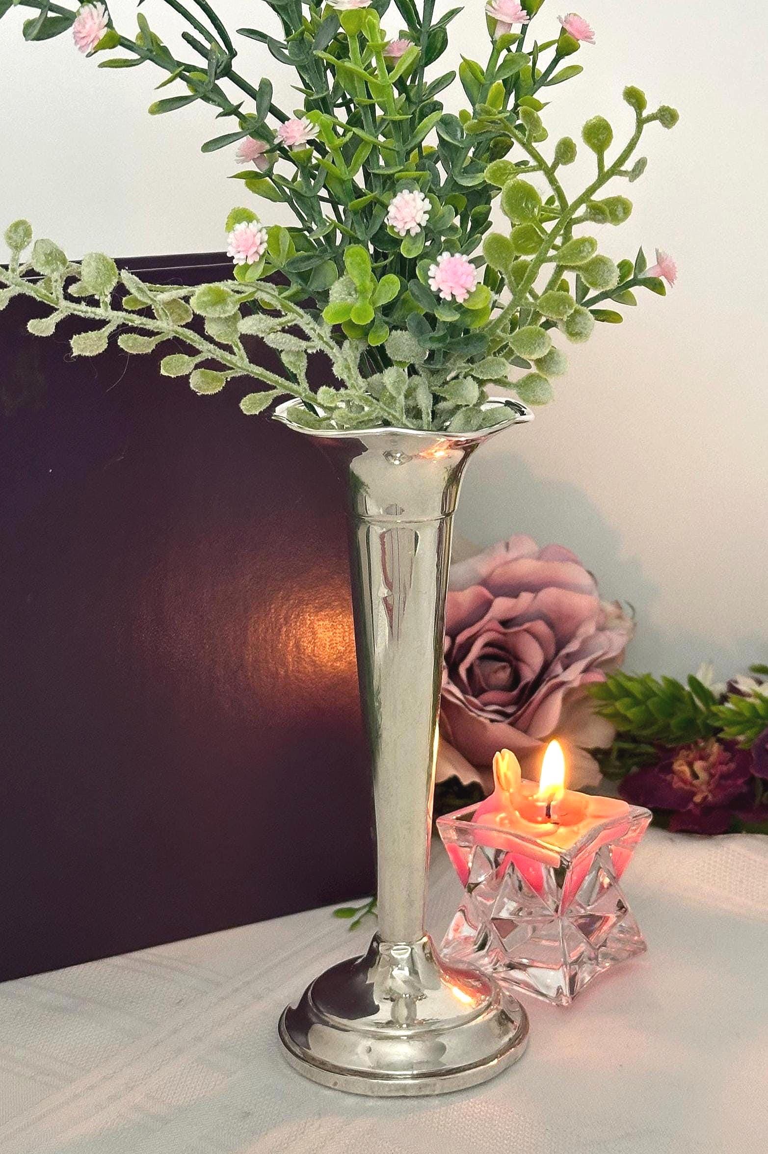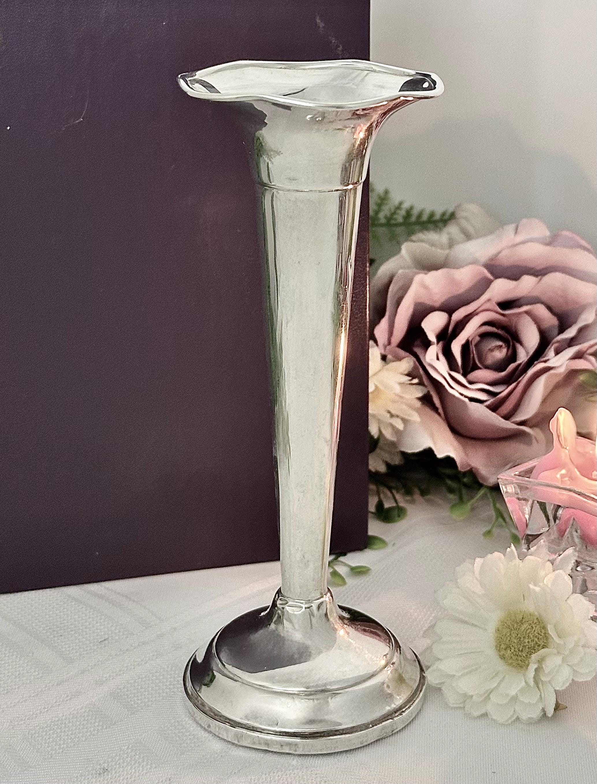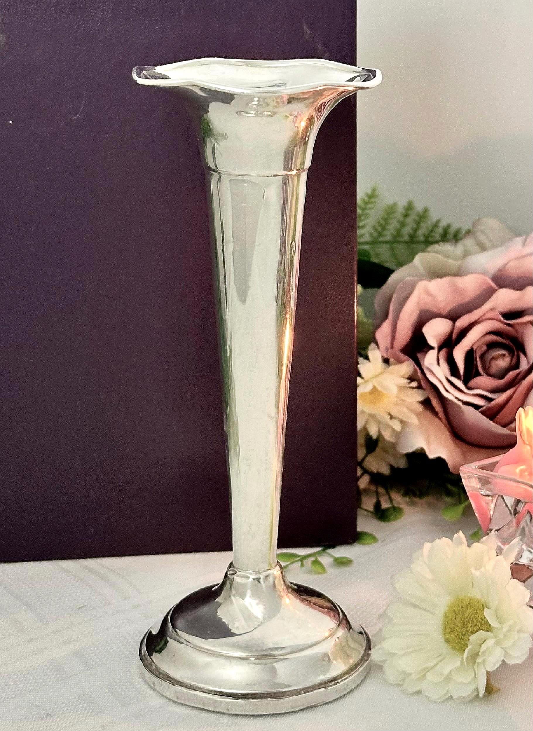 With a diameter of 2.5 inches and a height of 6.5 inches, this elegant floral trumpet bud vase weighs 128 grams, making it a beautiful piece for any antique collection or decorative display. There are small marks on the piece / crinkle at the foot as sterling silver is soft.