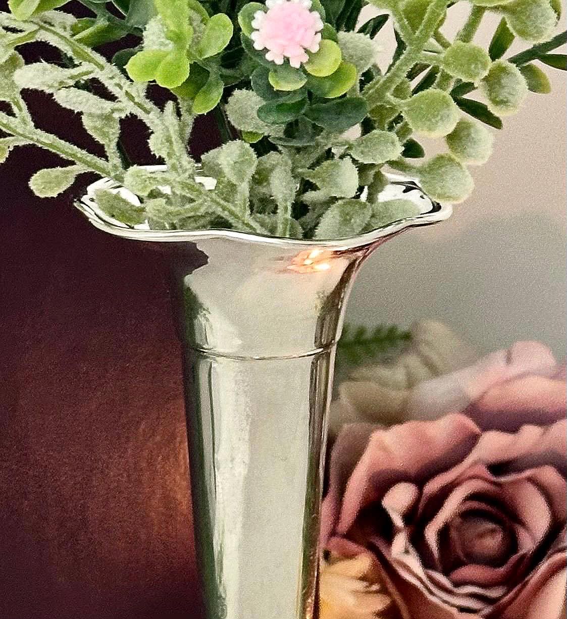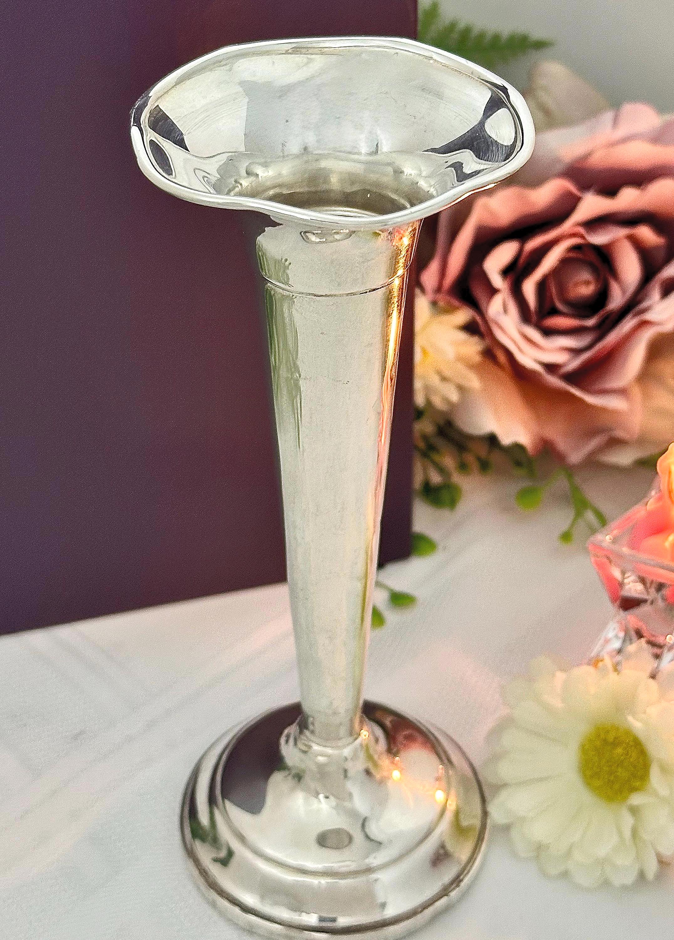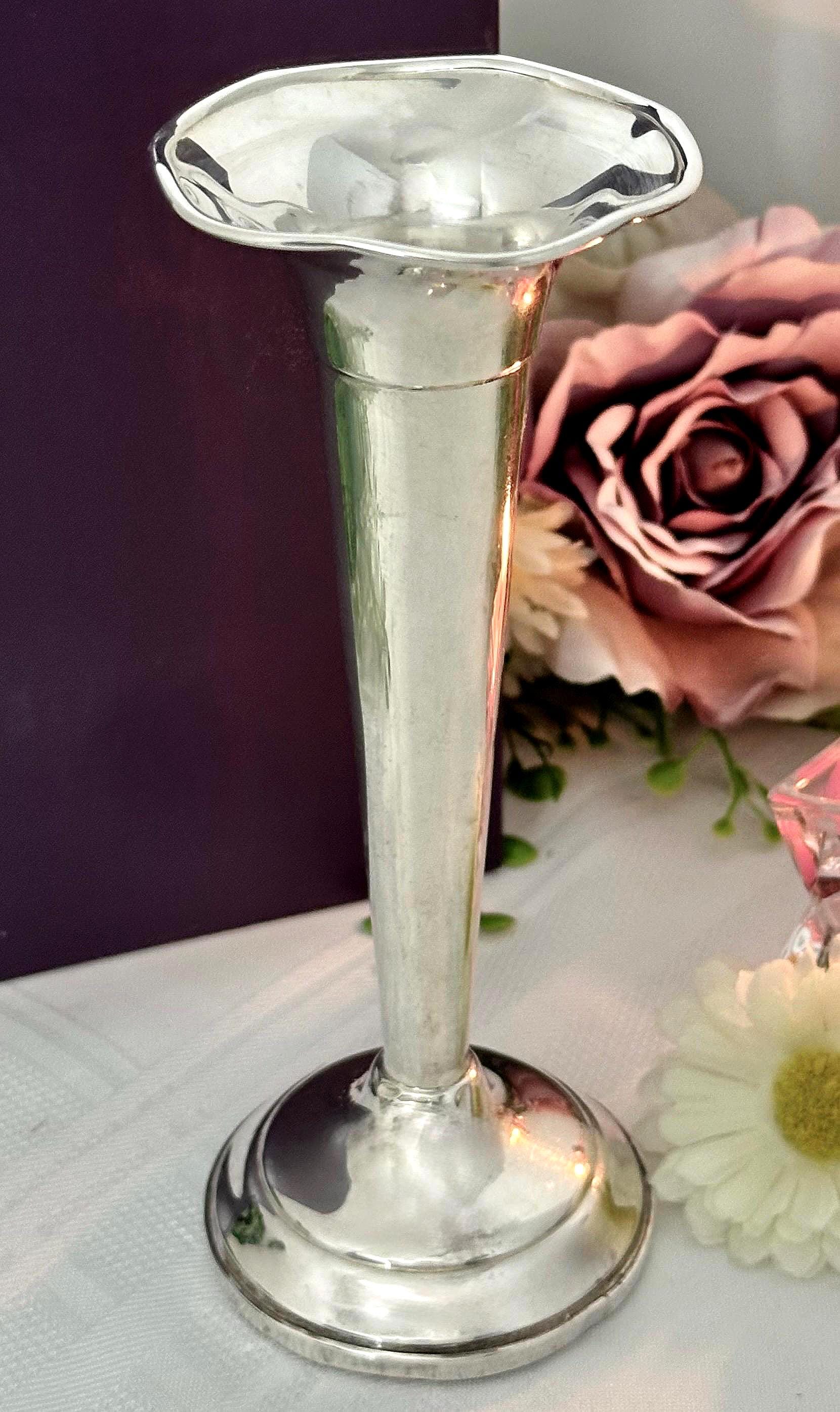 This is for a nice Vintage Sterling Silver Posey Vase by International Silver. The piece has a wavy rim and features a weighted base, making it sturdy and perfect for displaying flowers. The vase is crafted from sterling silver (.925) and has a Victorian style.