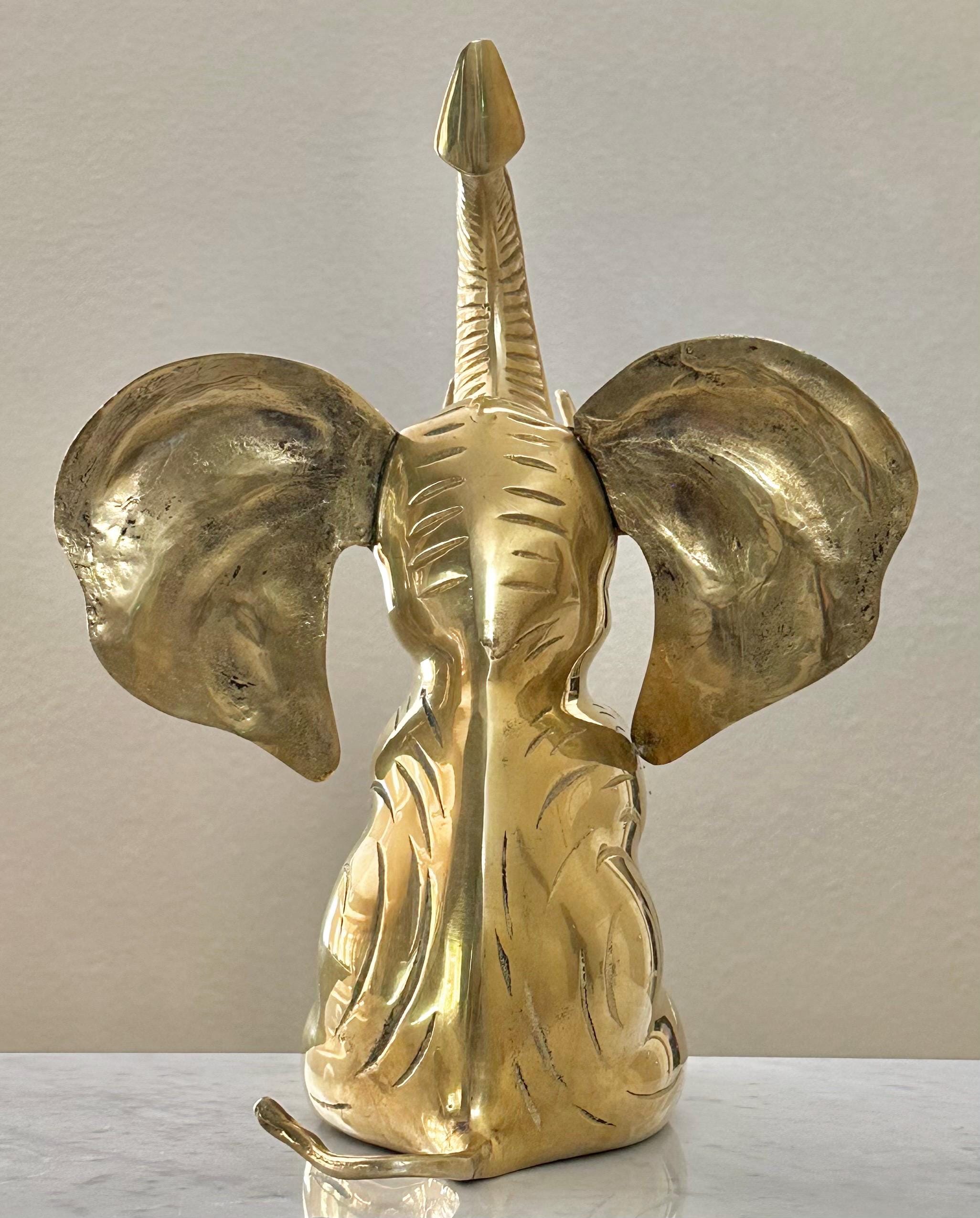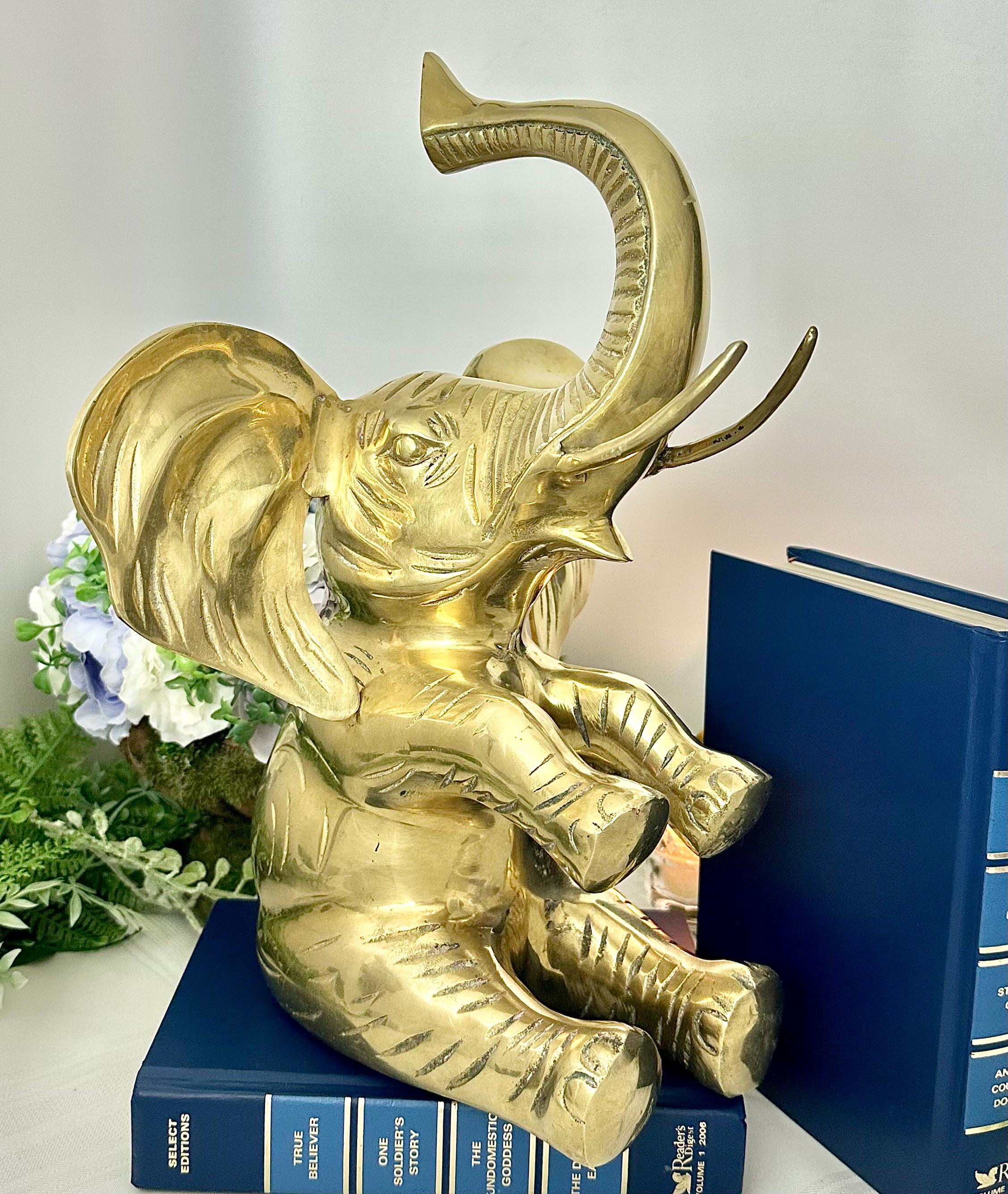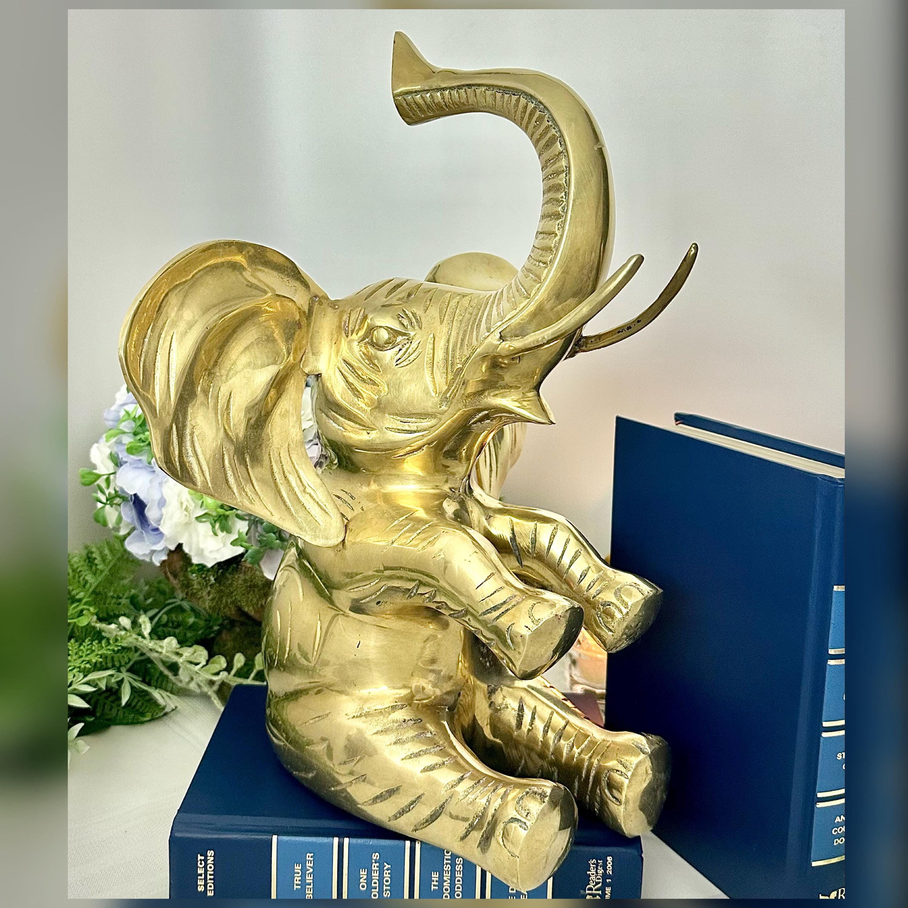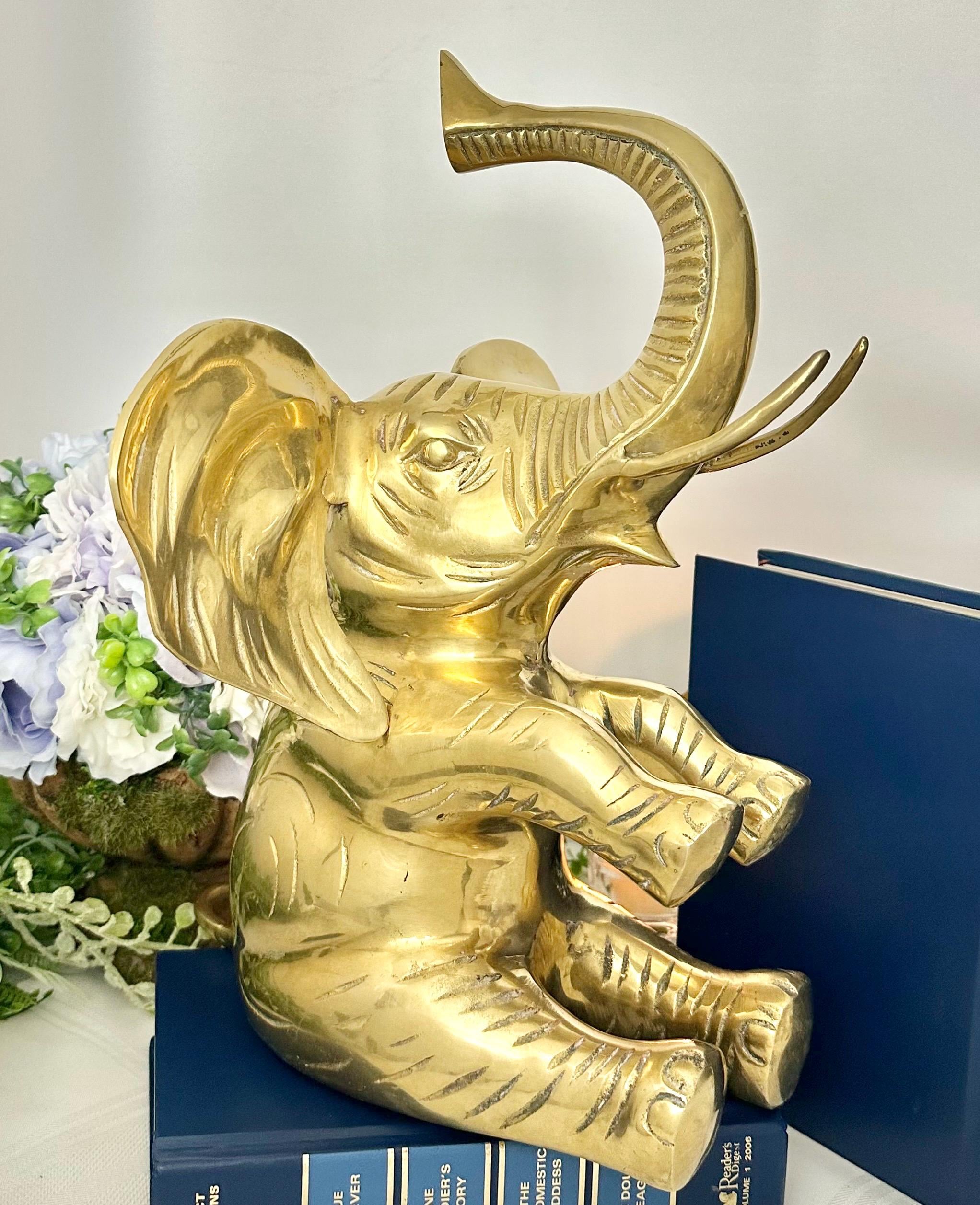 This vintage brass elephant figurine is a charming addition to any home decor. With its trunk up symbolizing good luck, this statue exudes positivity and style. The large sitting elephant design, measuring 10 inches in depth and 10 inches in width, showcases intricate details and craftsmanship.