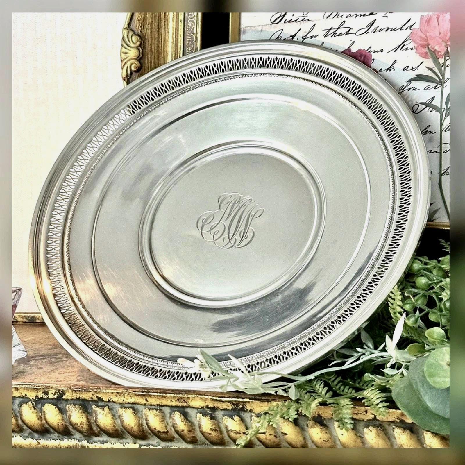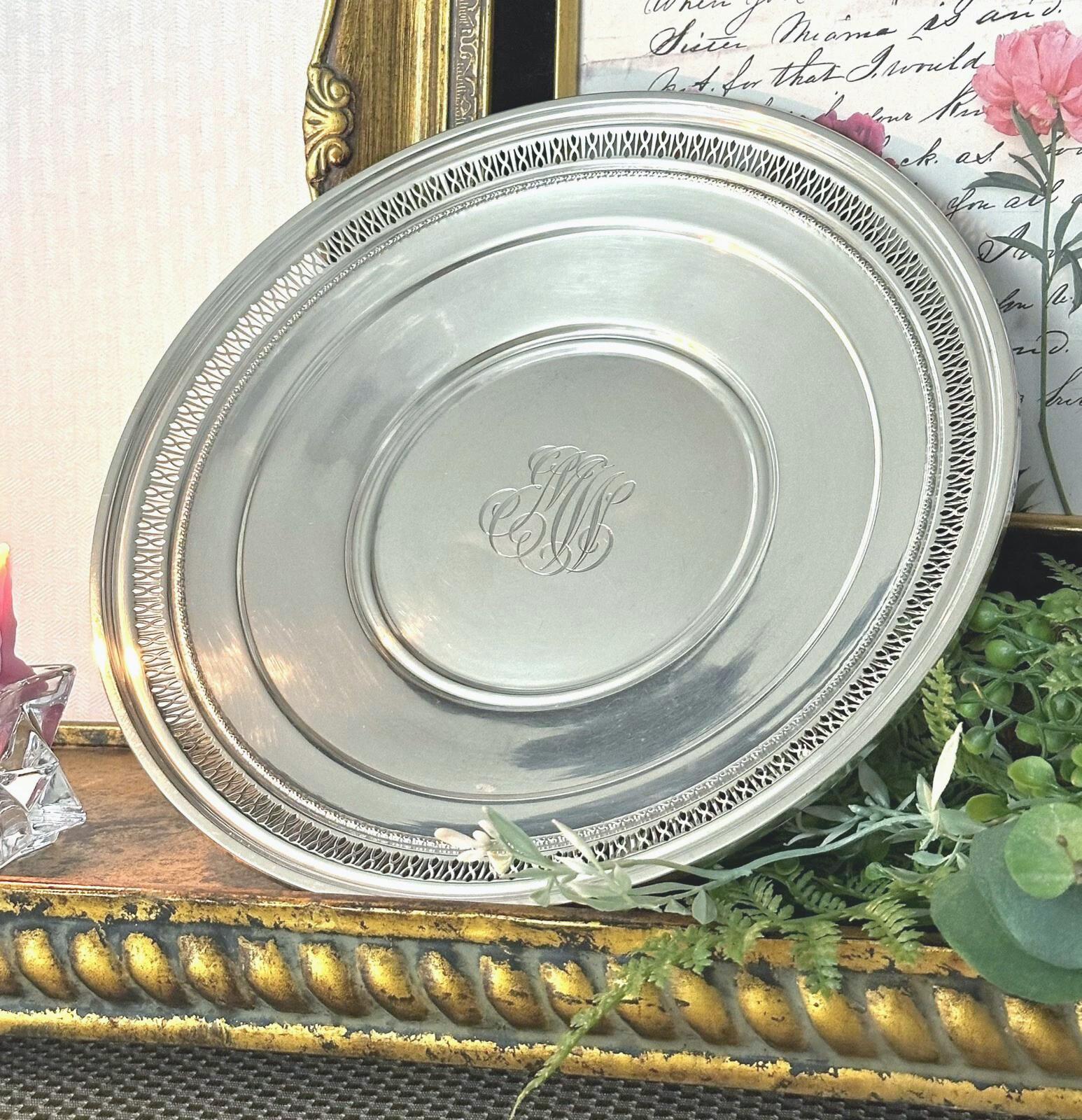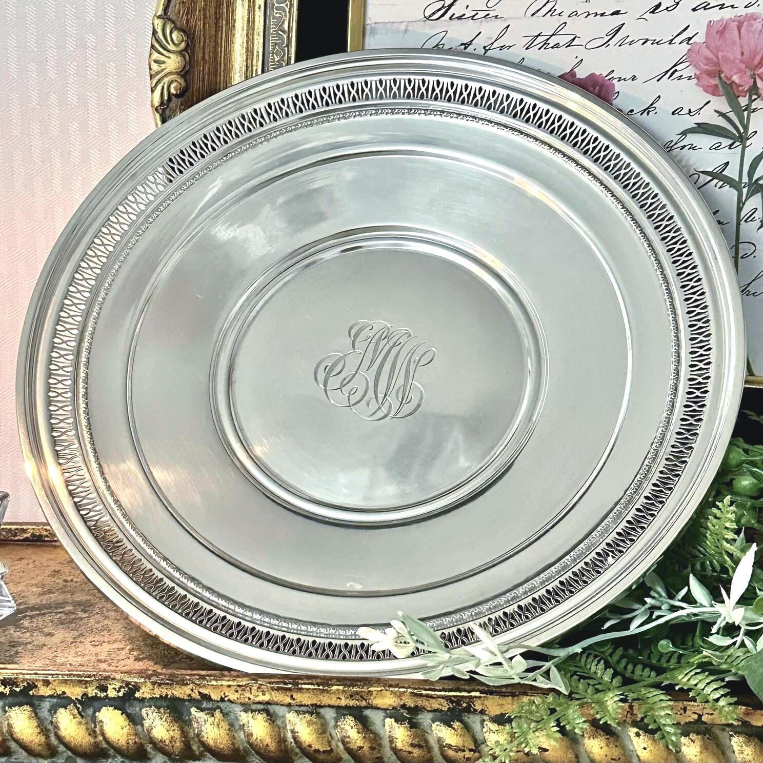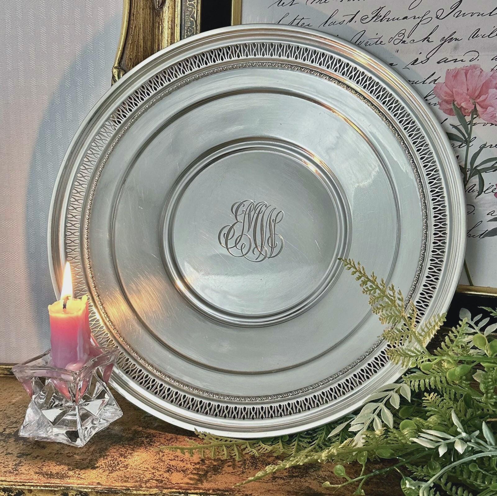 This is for a vintage Sterling Silver 925/1000 dish from Black Star & Frost. The dish has a monogram in the center with initials I believe to be EMW. The plate has a diameter of 10" and is marked sterling, makers name and H 7 Boat and _8. This is in good condition with minor surface scratches and a pierced rim. This is a good size for a centerpiece with candles to a vase placed on it and to be enjoyed for years to come.