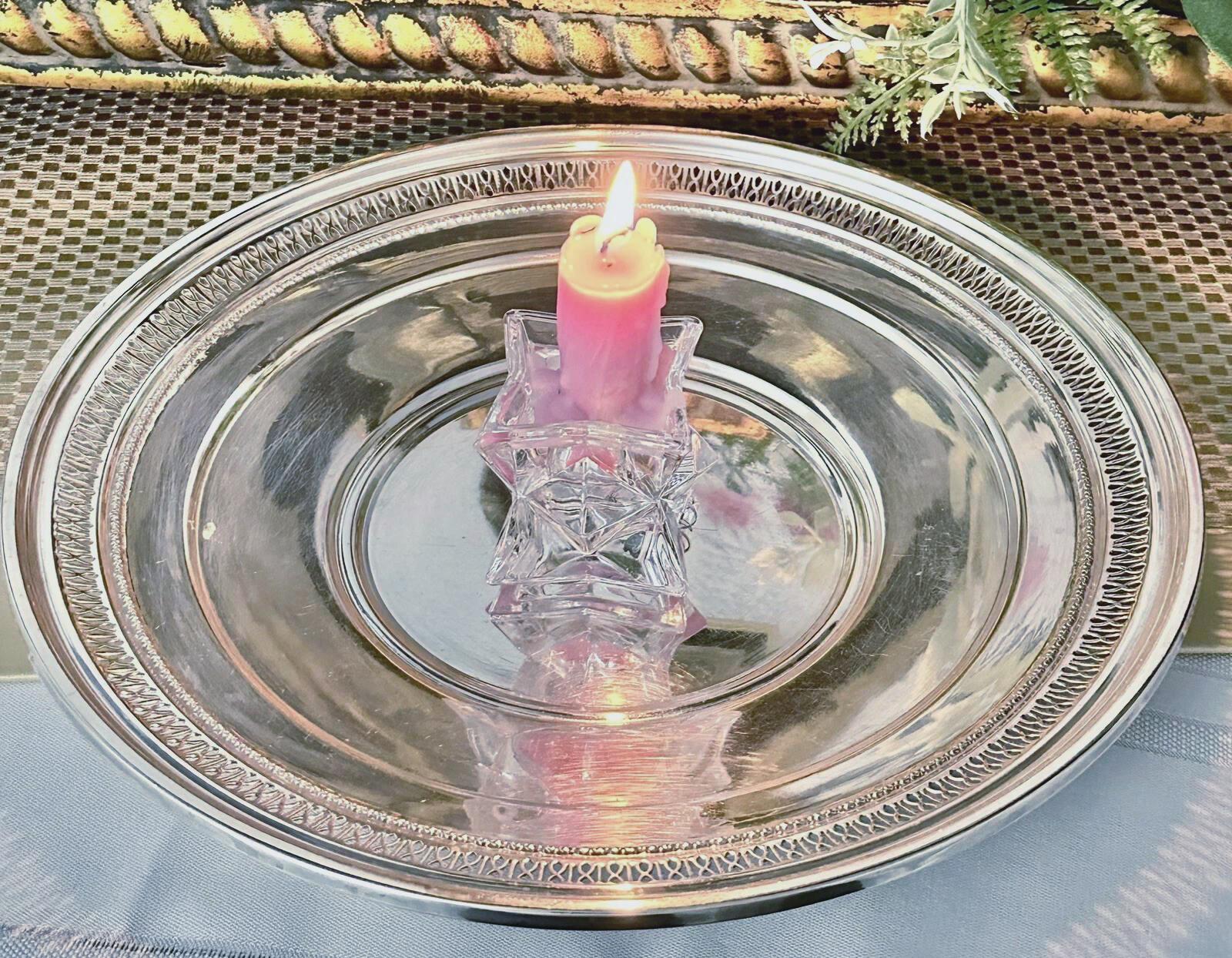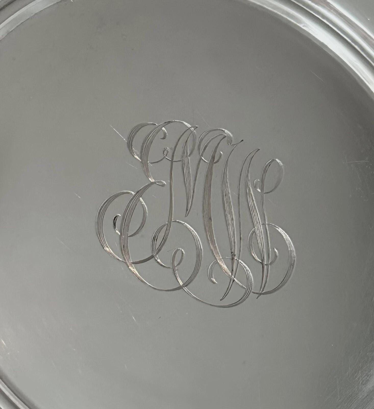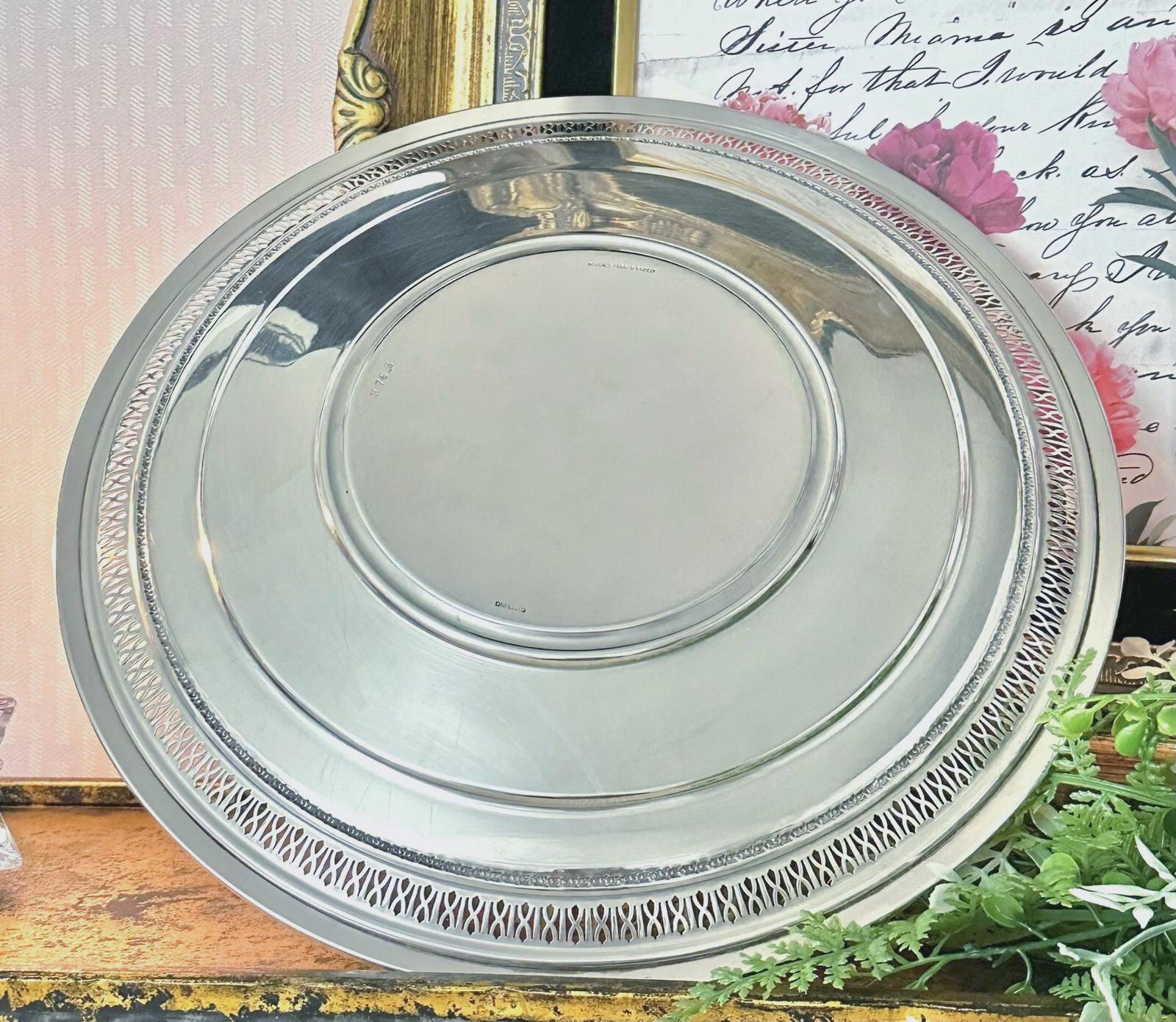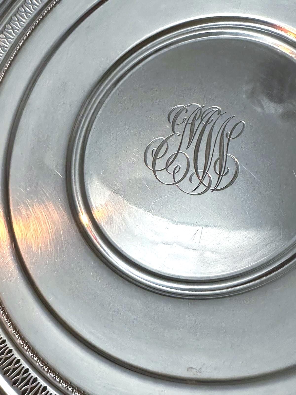 This is for a vintage Sterling Silver 925/1000 dish from Black Star & Frost. The dish has a monogram in the center with initials I believe to be EMW. The plate has a diameter of 10" and is marked sterling, makers name and H 7 Boat and _8. This is in good condition with minor surface scratches and a pierced rim. This is a good size for a centerpiece with candles to a vase placed on it and to be enjoyed for years to come.