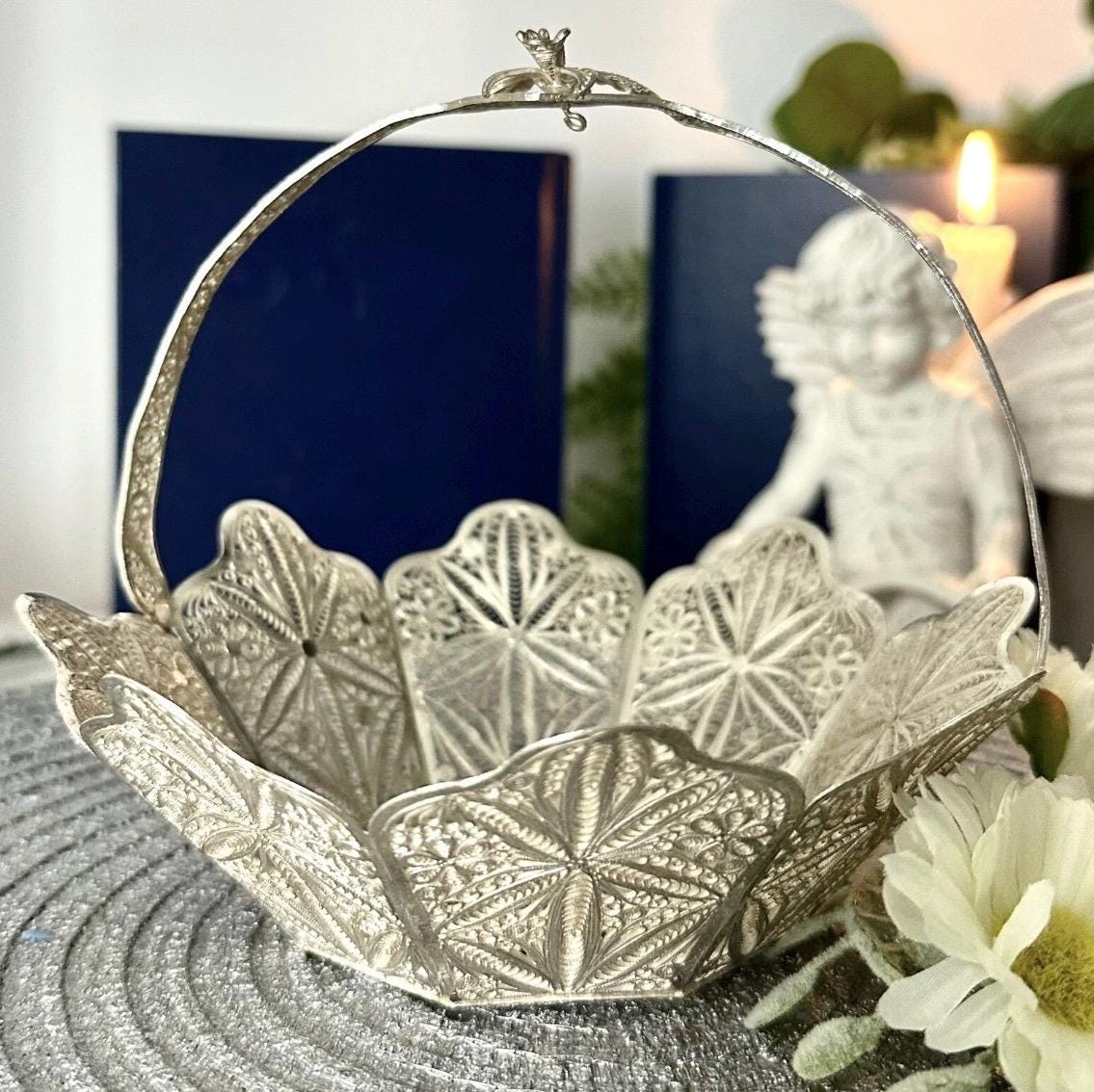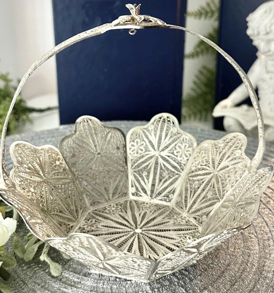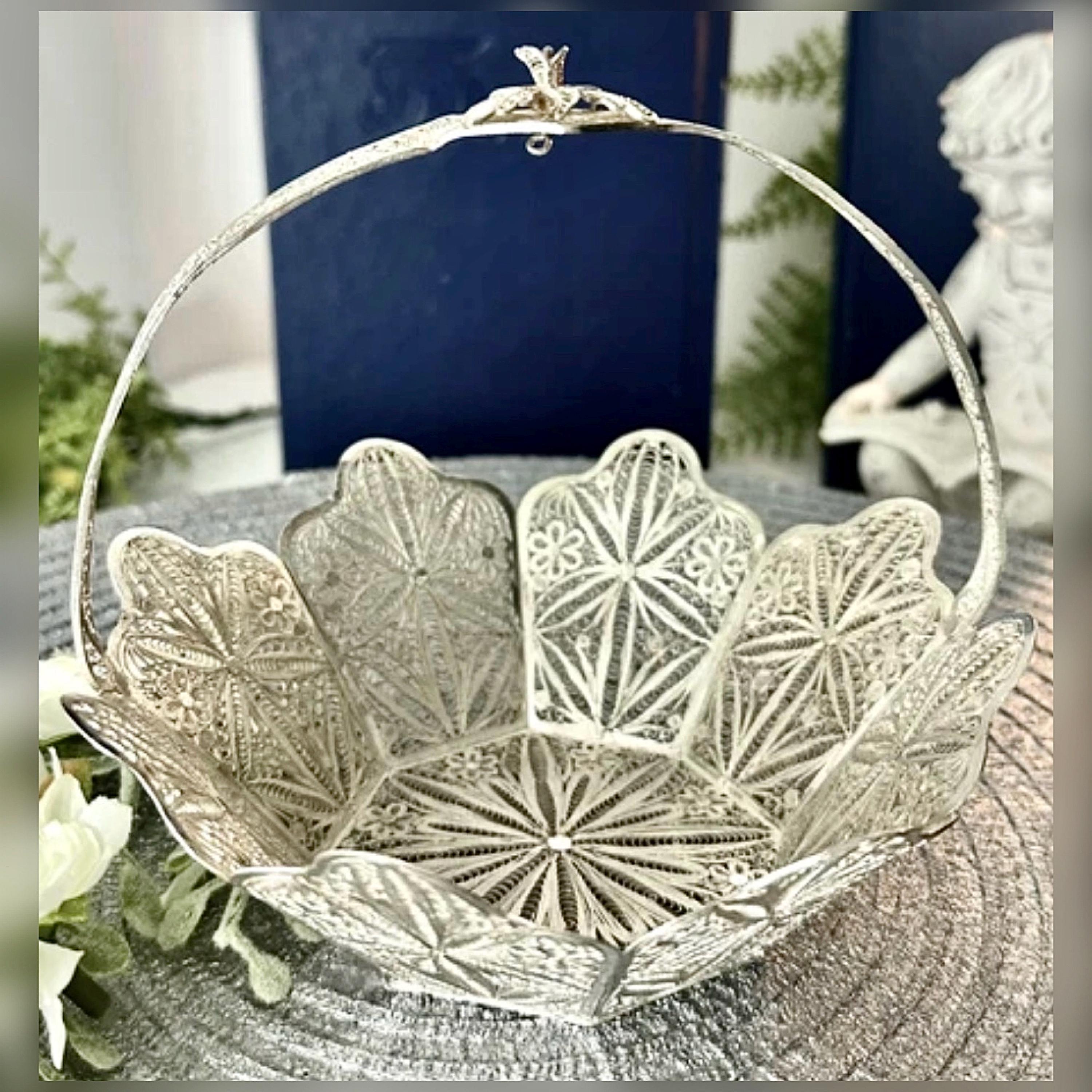 This is for a vintage Silver Handcrafted Peruvian Filigree basket. This cute handled silver Filigree basket has many uses from holding small soaps, silver Candy basket, to artificial flower.