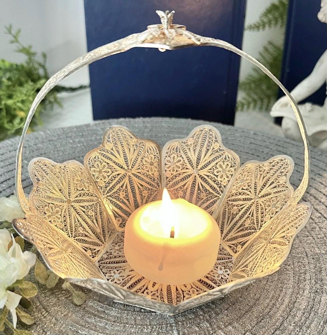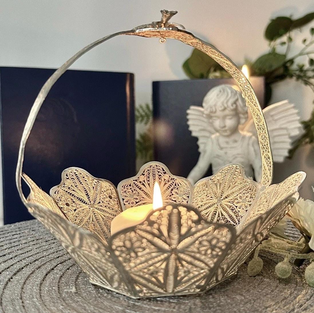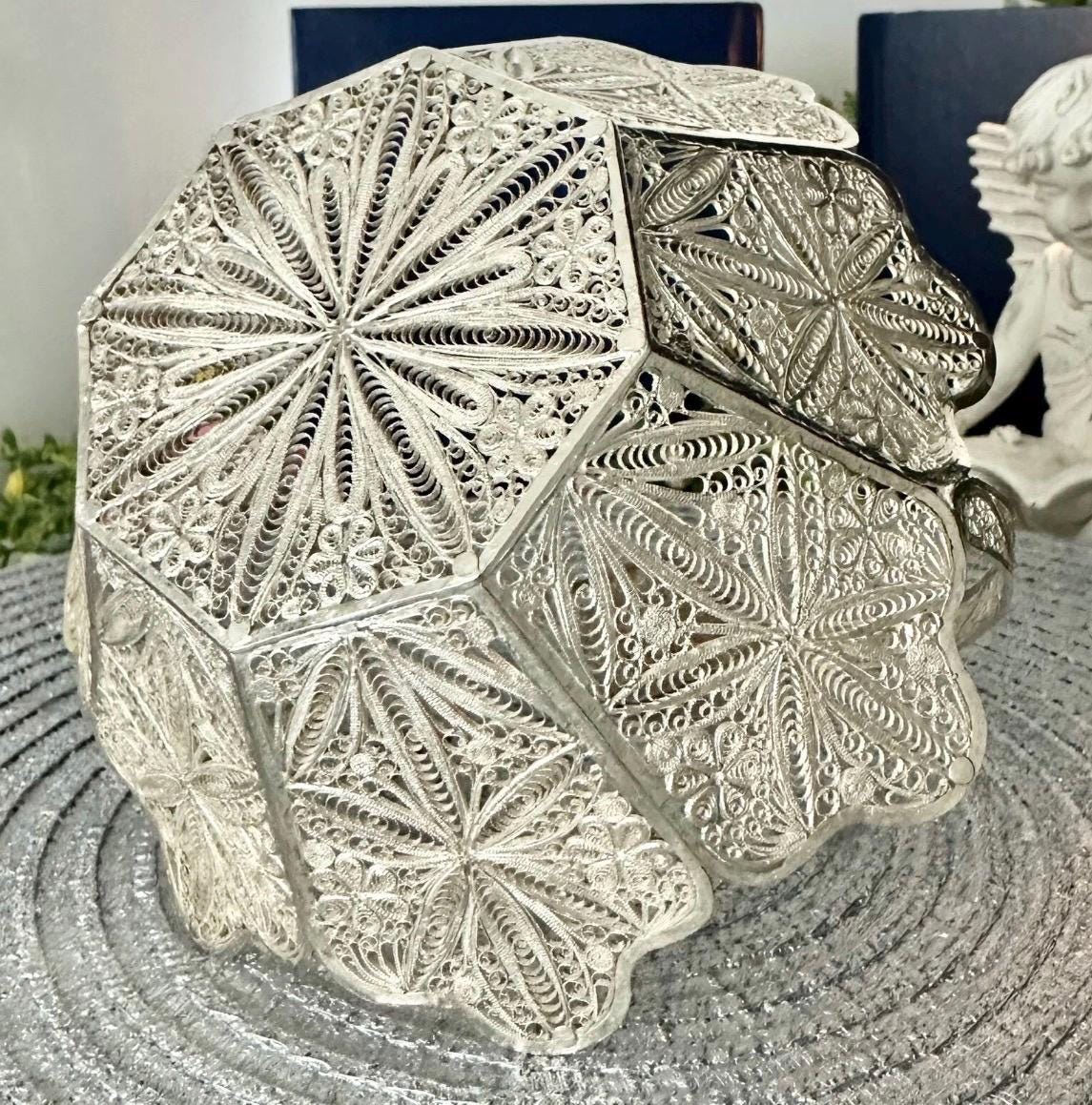 This is for a vintage Silver Handcrafted Peruvian Filigree basket. This cute handled silver Filigree basket has many uses from holding small soaps, silver Candy basket, to artificial flower.
