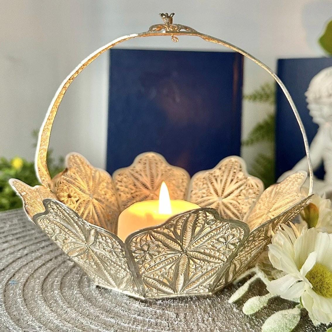 The delicate hand work is crafted in the shape of flower petals with a small orchid on the handle. The piece measures 5 inches tall with a diameter of approximately 5.5 - 6 inches.