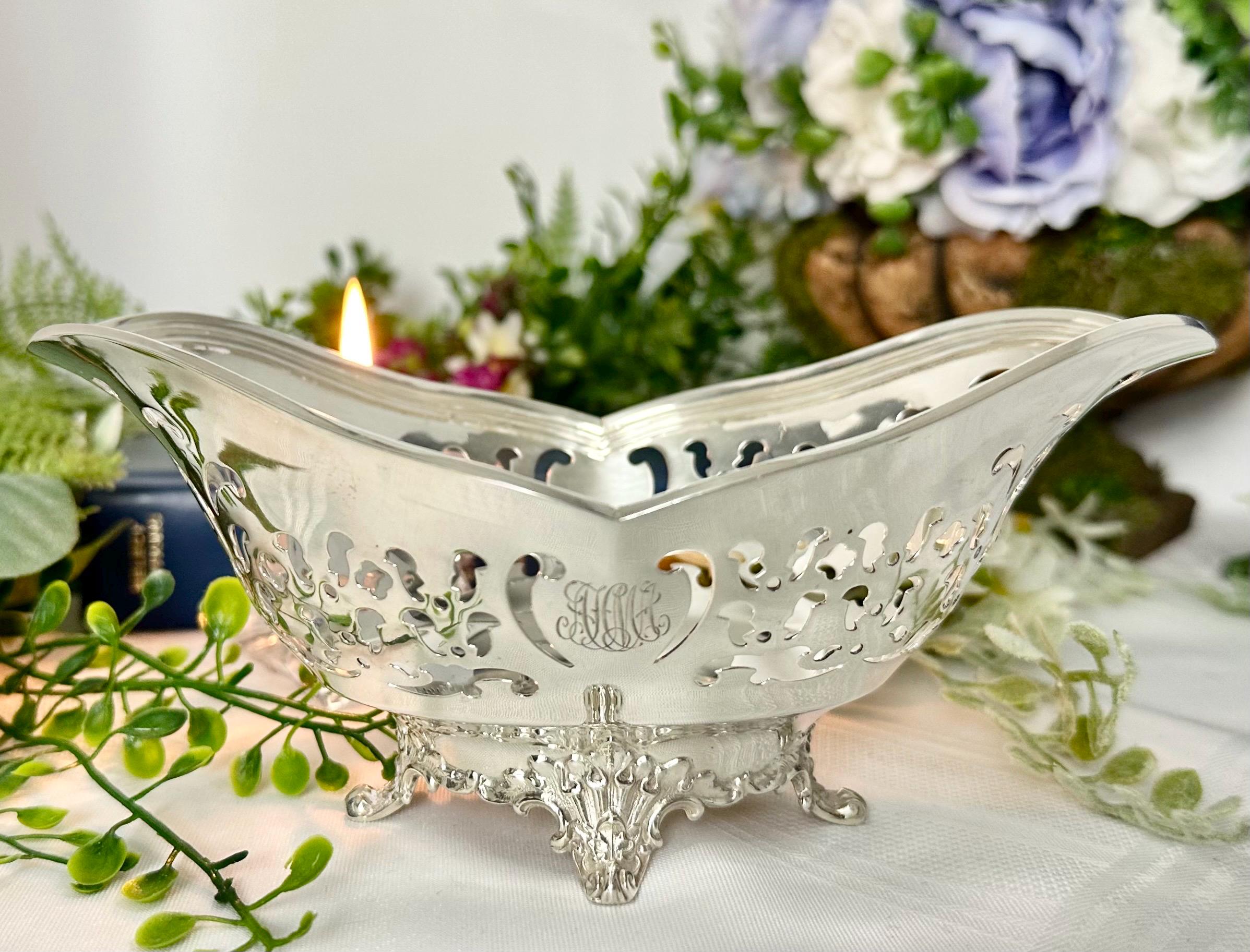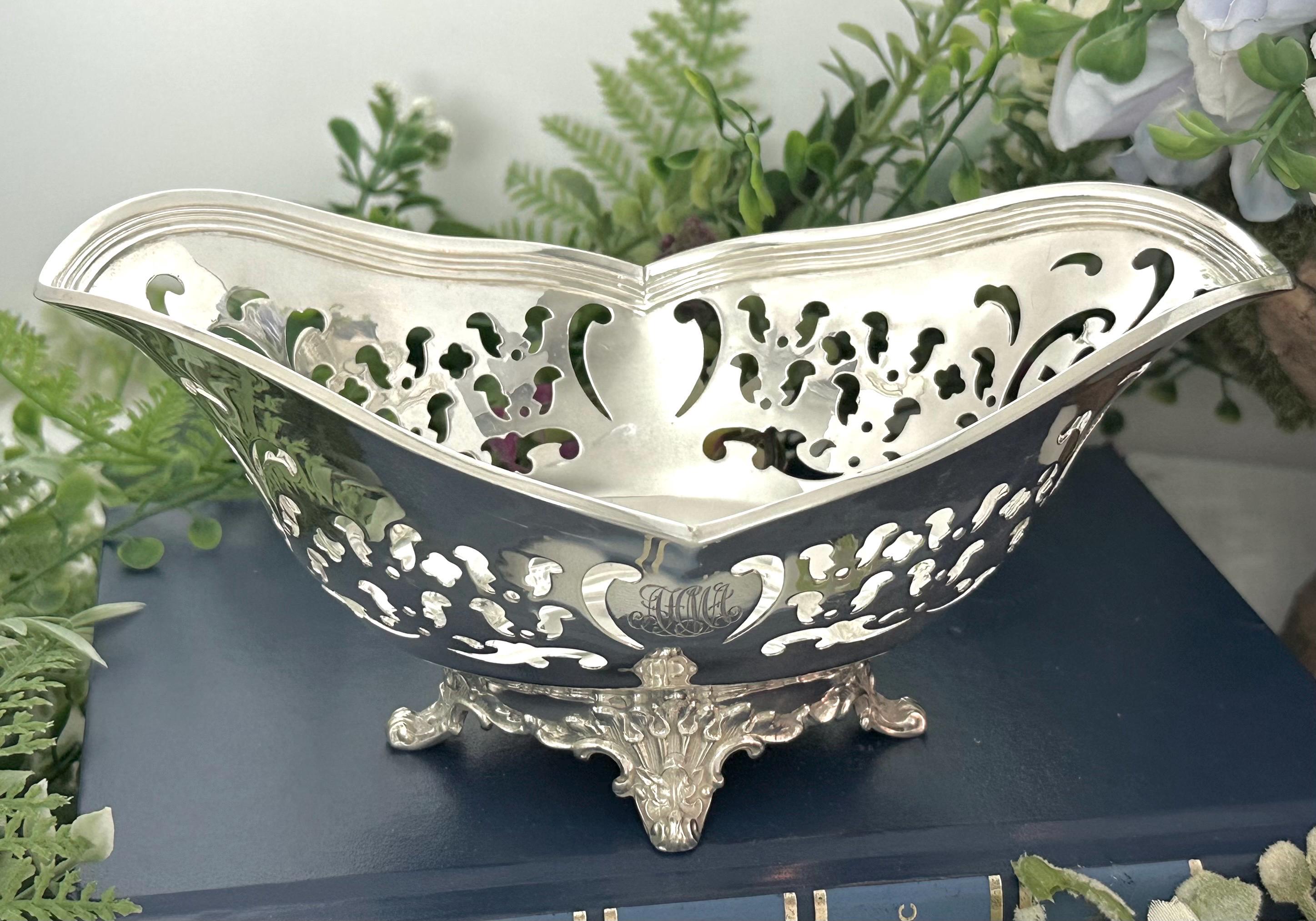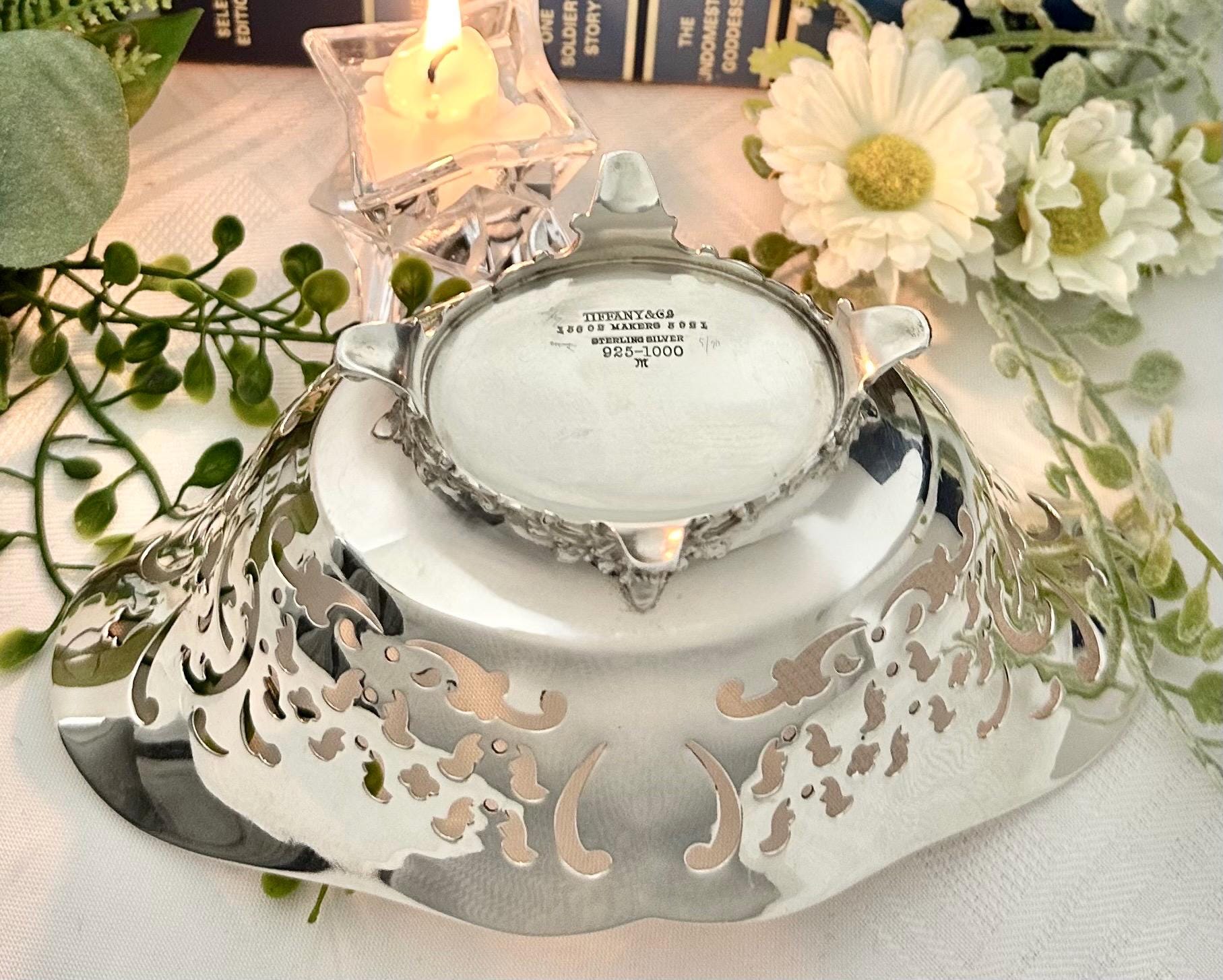This is for a lovely uniquely shaped Sterling Silver bowl by Tiffany and Co. It has pierced decorated sides and sits on a decorated foot. The piece is polished and also is monogramed on one side with highly decorative calligraphy letters.