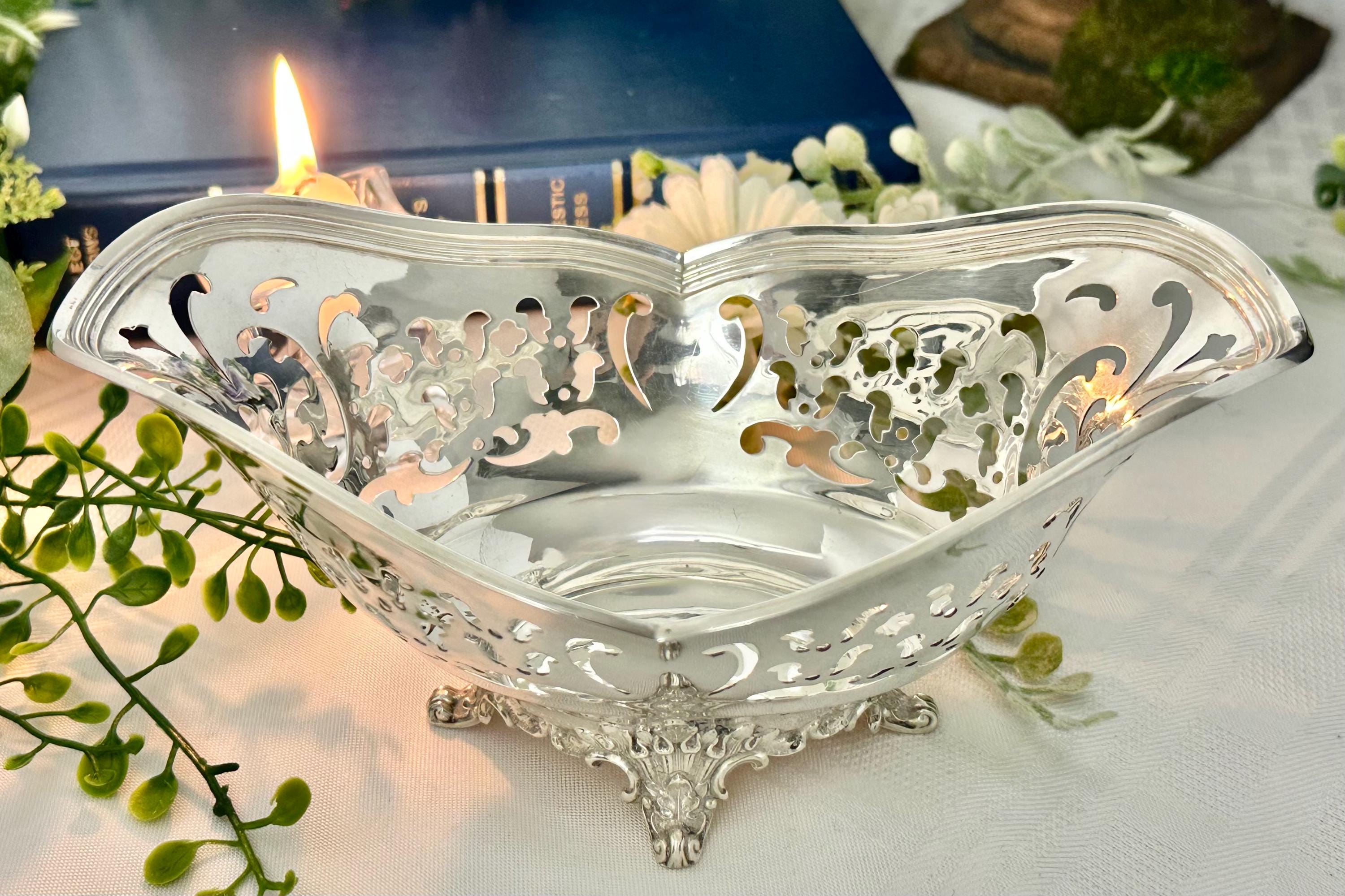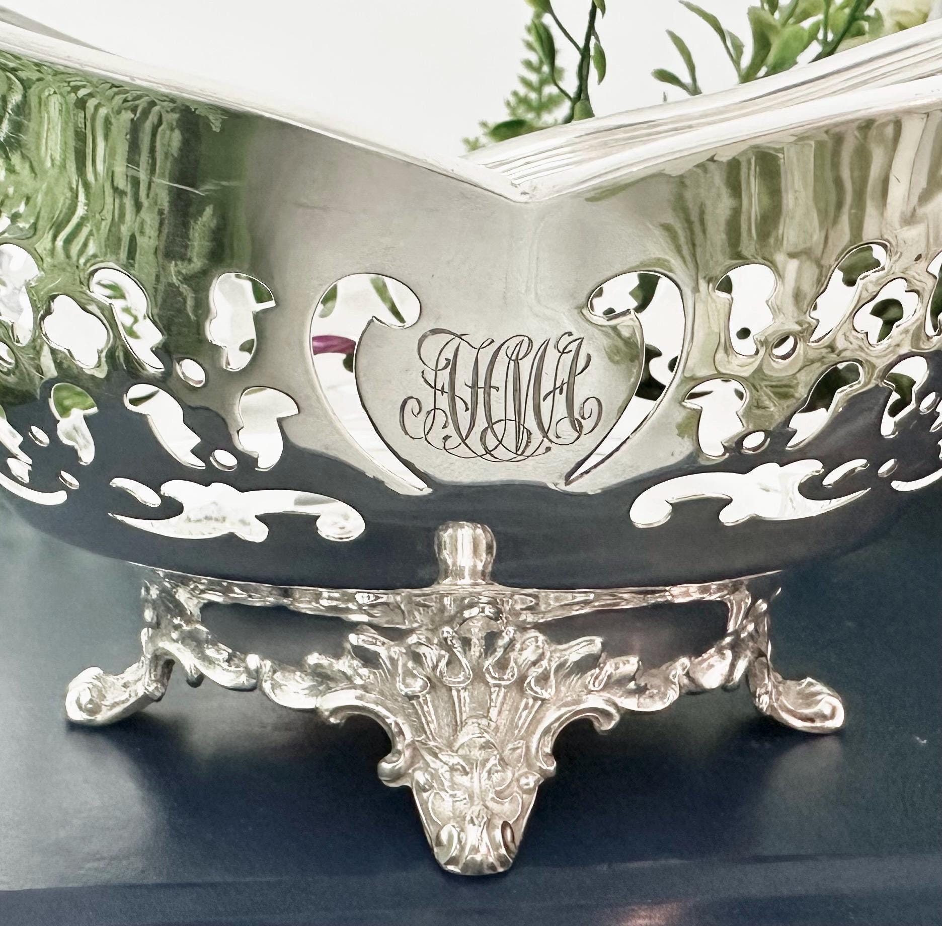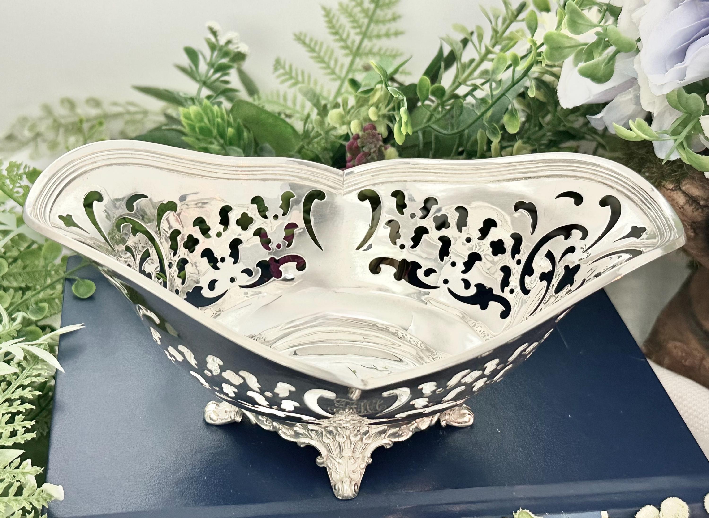 This is for a lovely uniquely shaped Sterling Silver bowl by Tiffany and Co. It has pierced decorated sides and sits on a decorated foot. The piece is polished and also is monogramed on one side with highly decorative calligraphy letters.