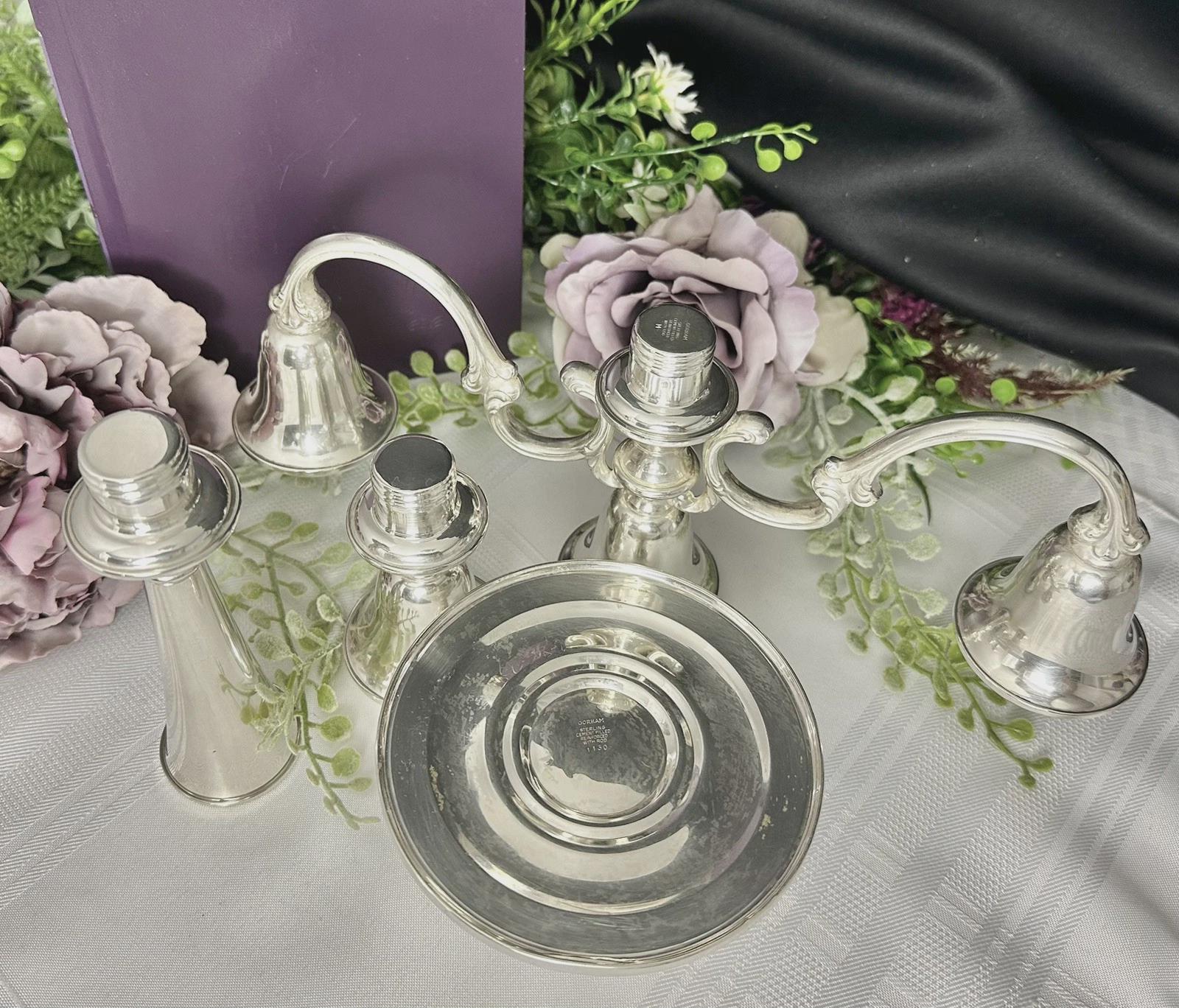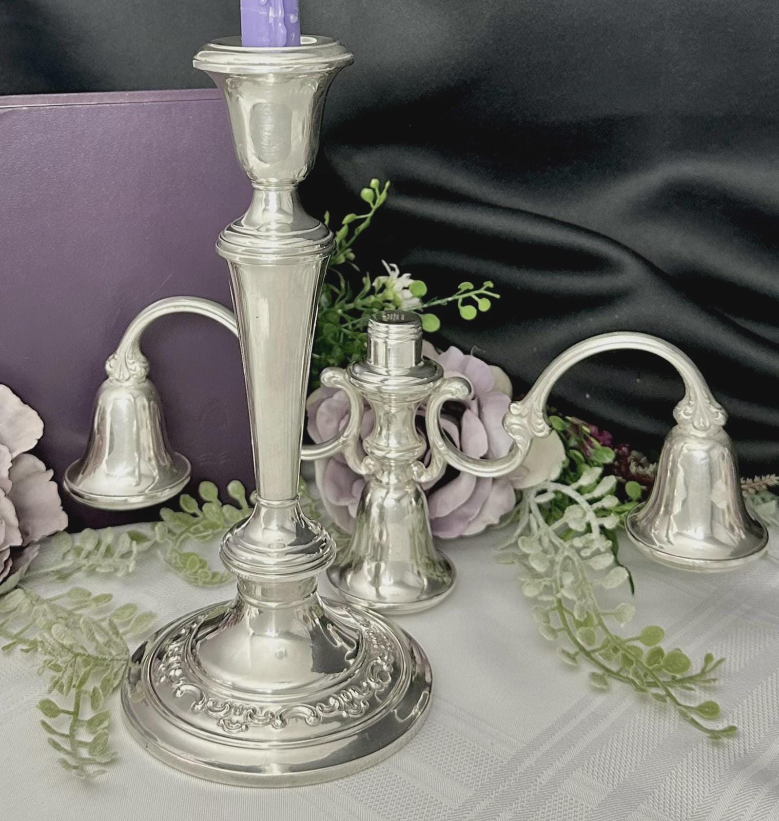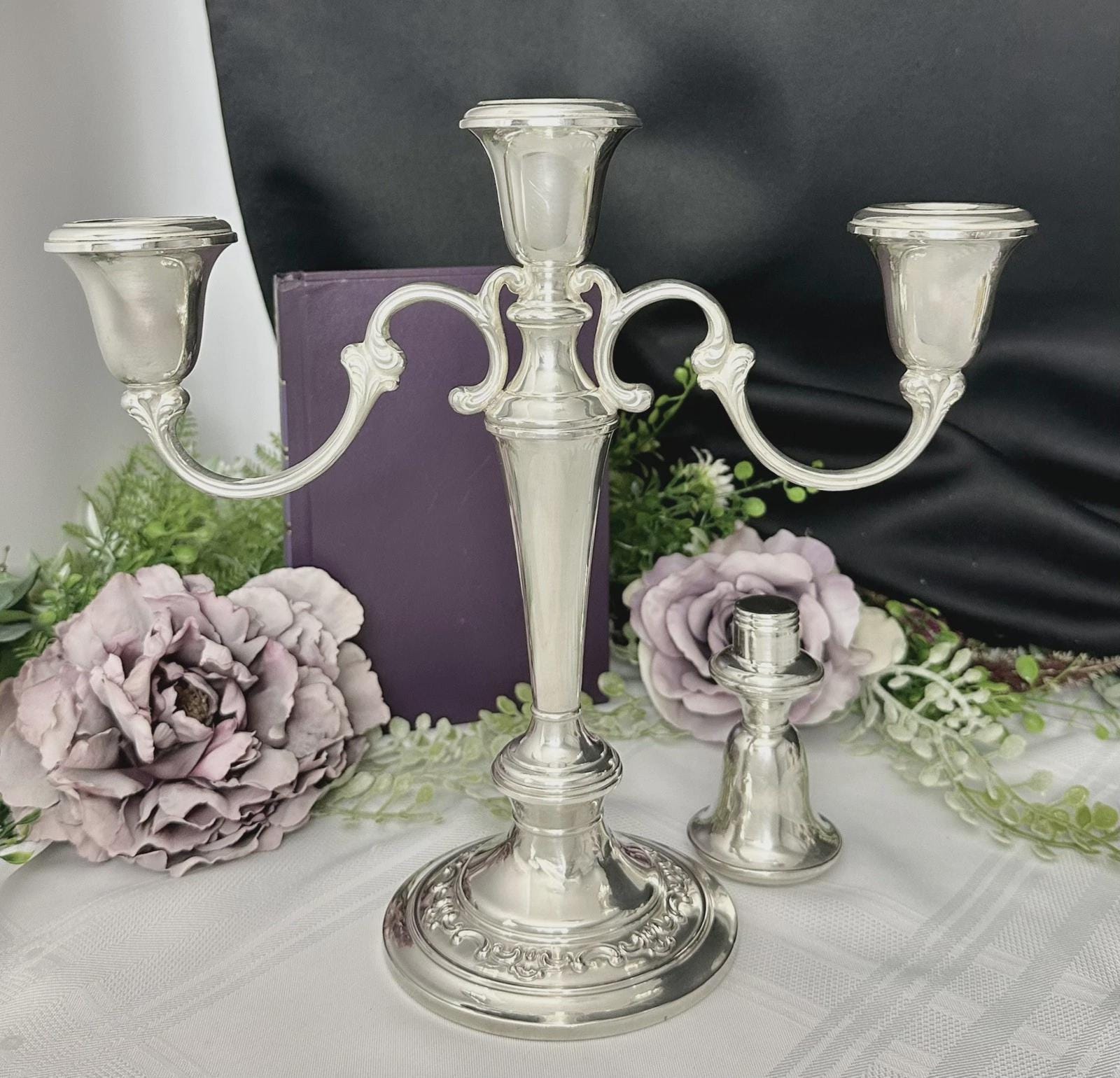 Made in the United States by renowned brand Gorham, this vintage silver candelabra exudes sophistication and timeless style for adding ambiance to any space. The piece with all 4 pieces used stands at the tallest height and holds 3 dinner taper candles. It can also be configured to hold one candle.