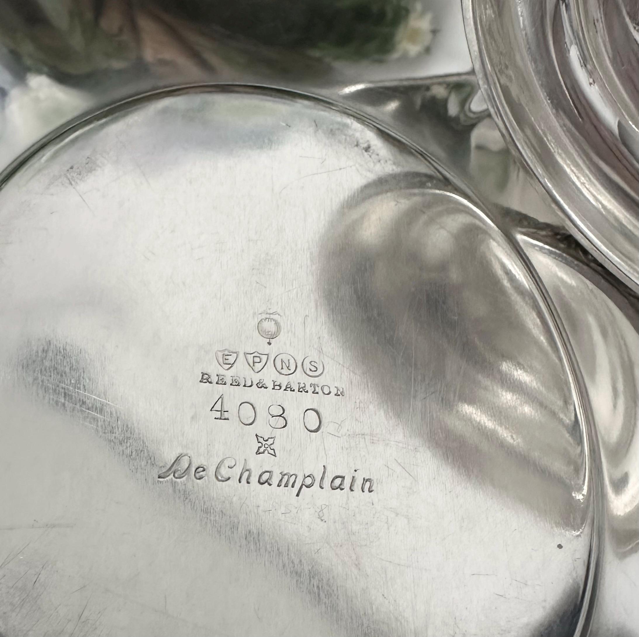 This is for a vintage Reed and Barton Silver Plated Gravy Boat with matchingTray in the De Champlain pattern. The piece is marked on the base with EPNS, Reed & Barton, 4080 and pattern name.