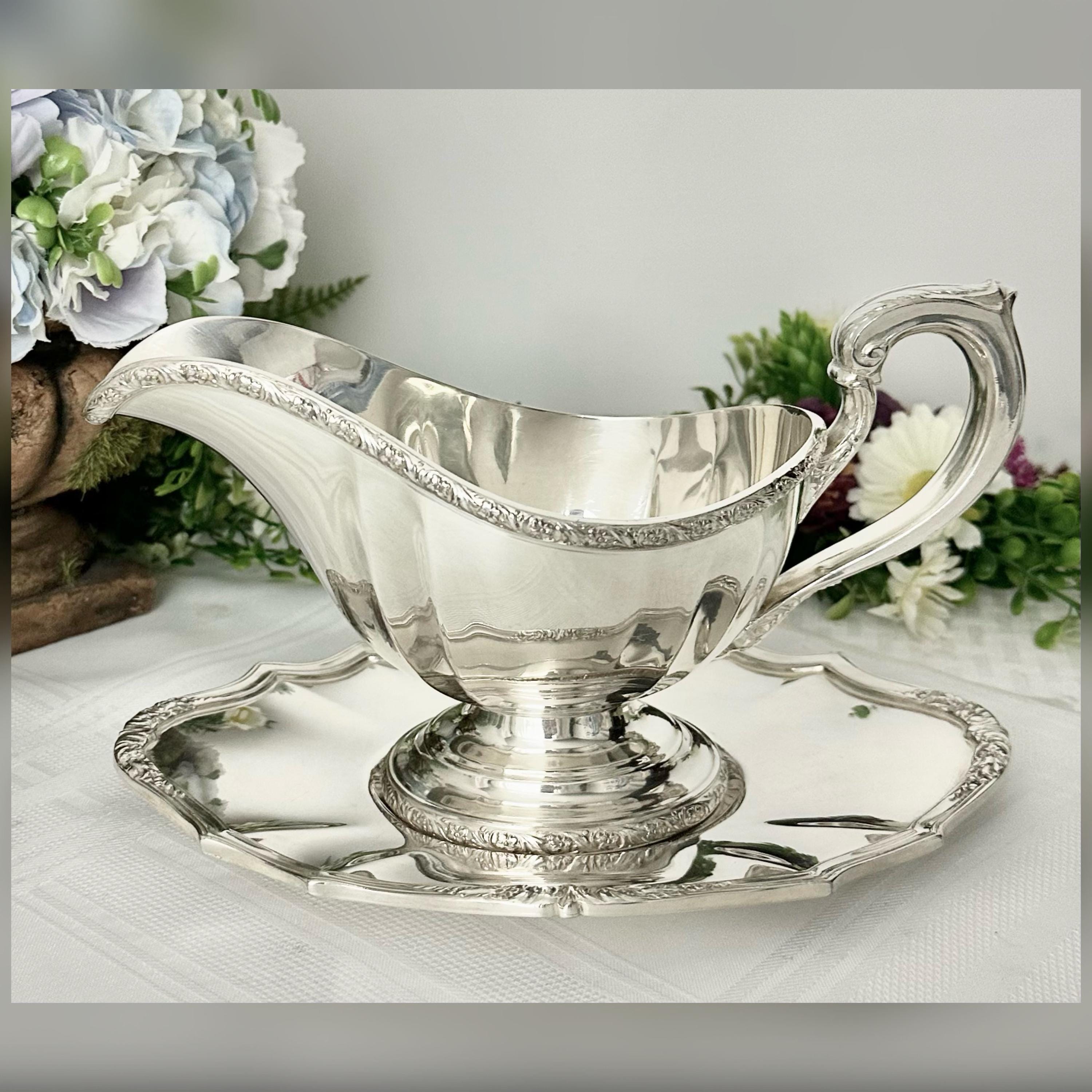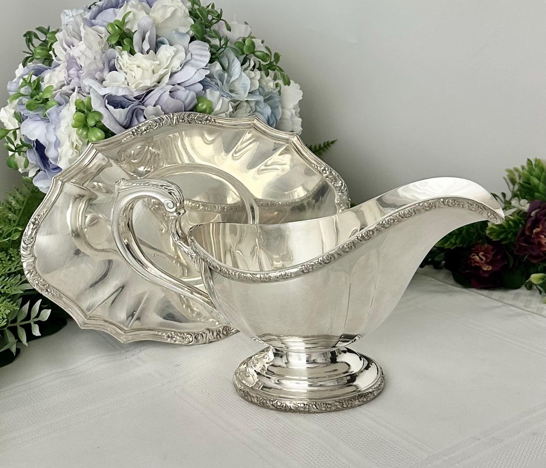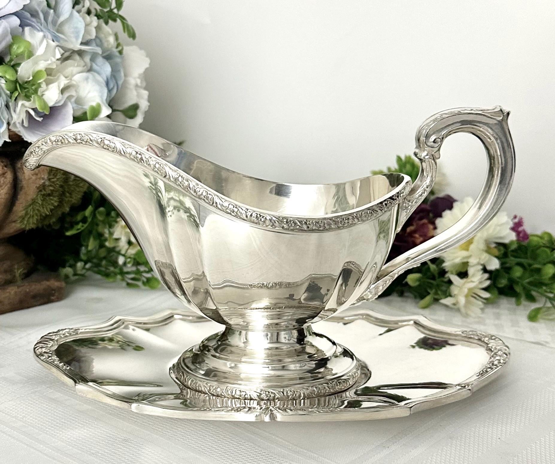 Made from silverplate, this elegant piece adds a touch of sophistication to any table setting. The intricate design of the De Champlain pattern adds a timeless charm to this gravy boat and tray, making it a beautiful addition to any antique collection or special dining occasion.