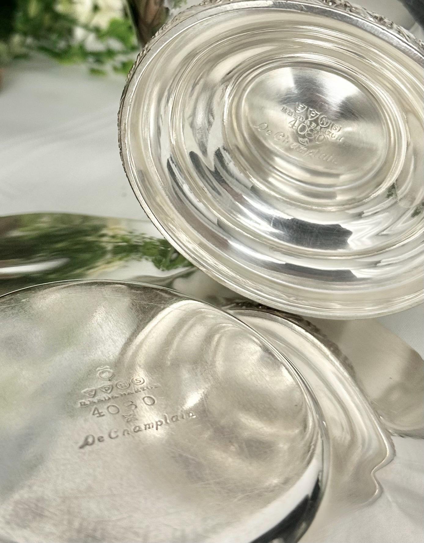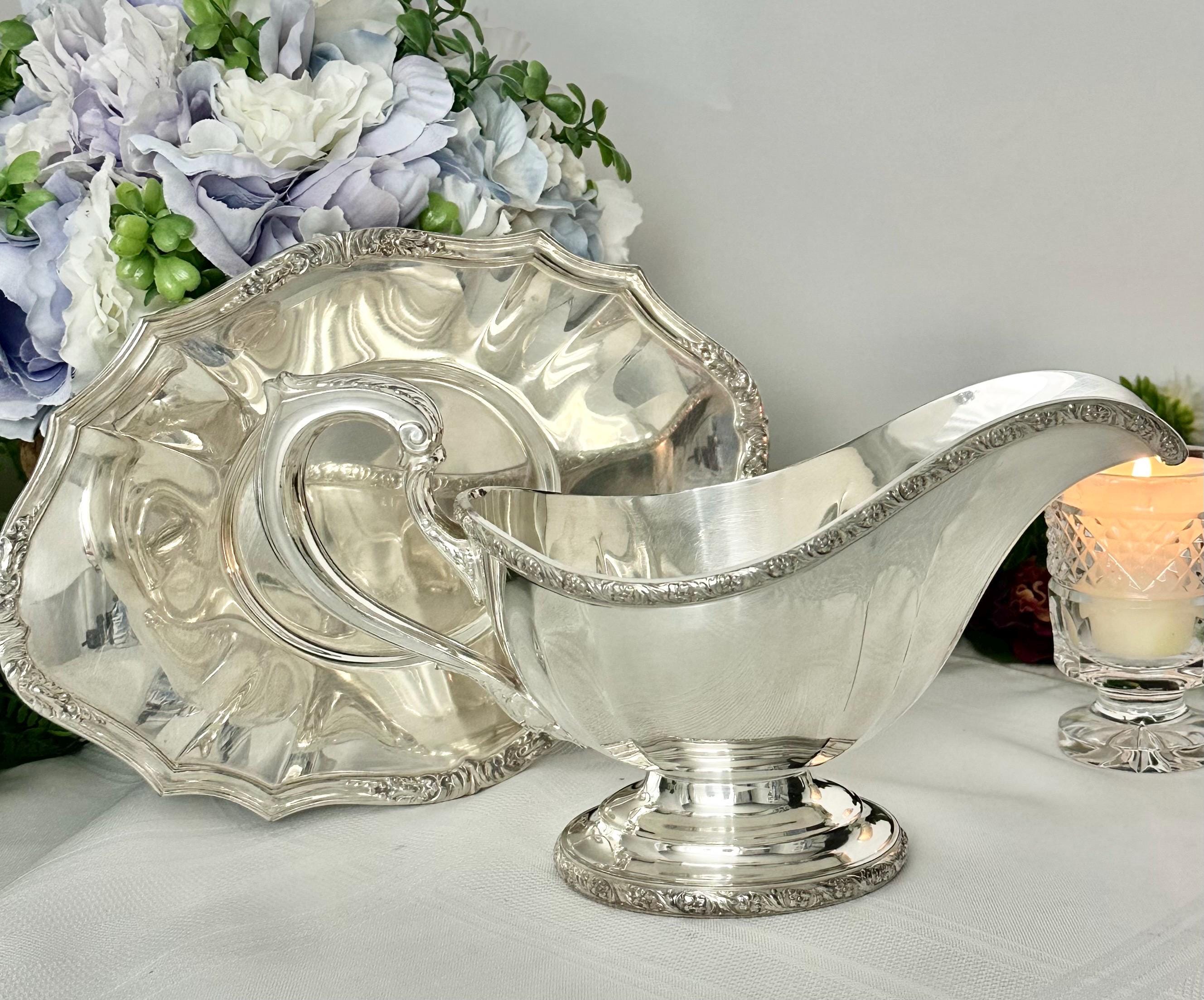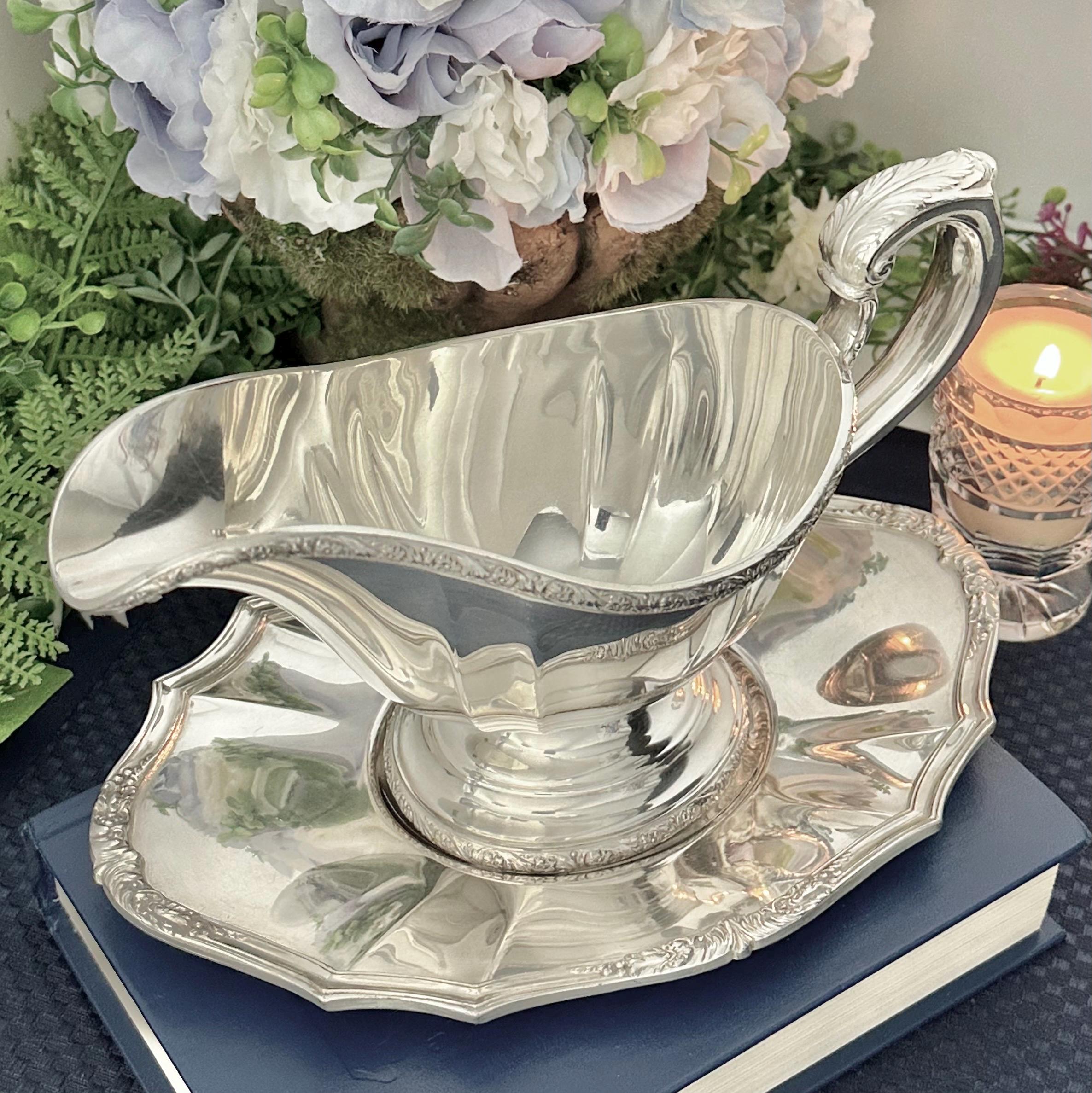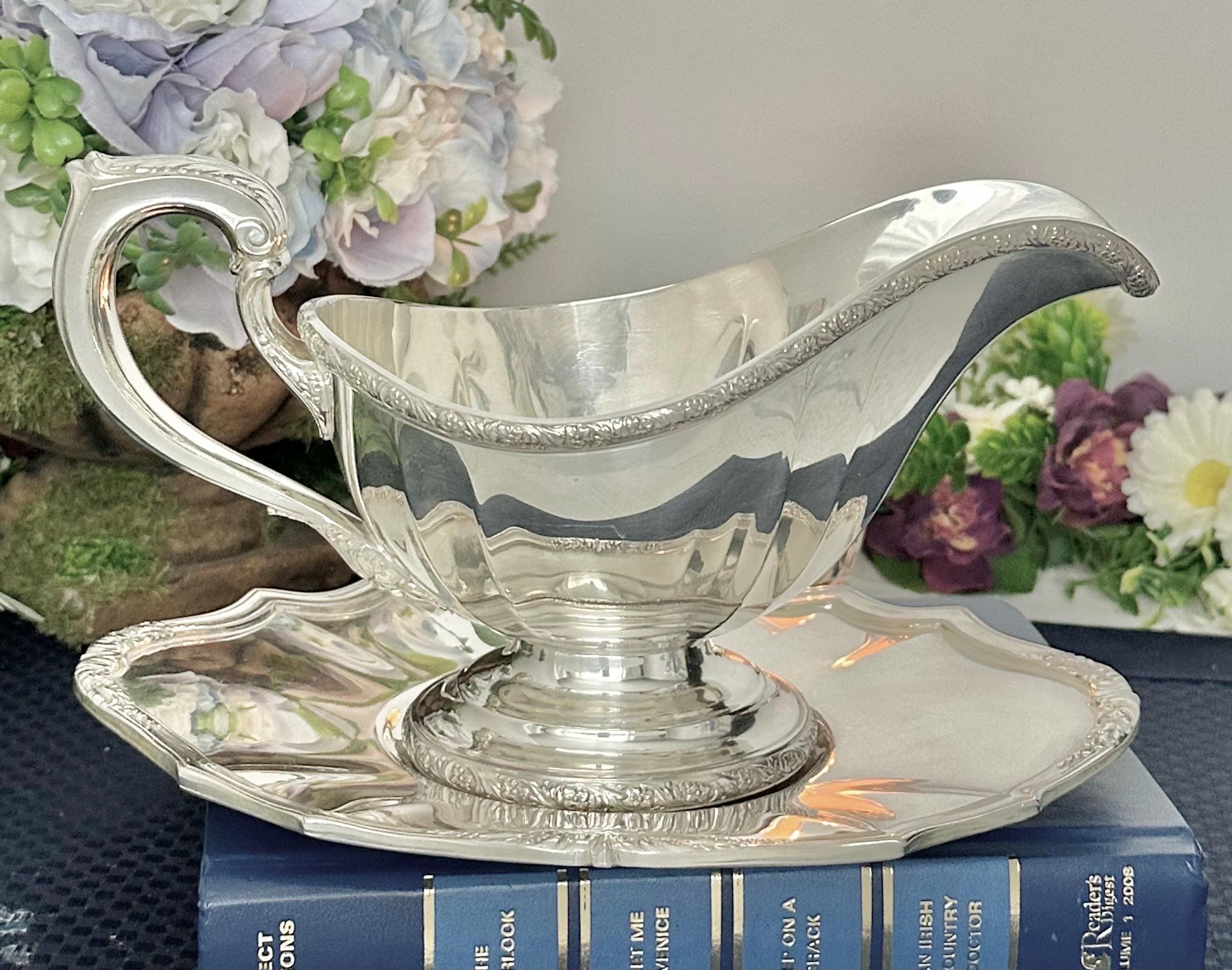 Made from silverplate, this elegant piece adds a touch of sophistication to any table setting. The intricate design of the De Champlain pattern adds a timeless charm to this gravy boat and tray, making it a beautiful addition to any antique collection or special dining occasion.