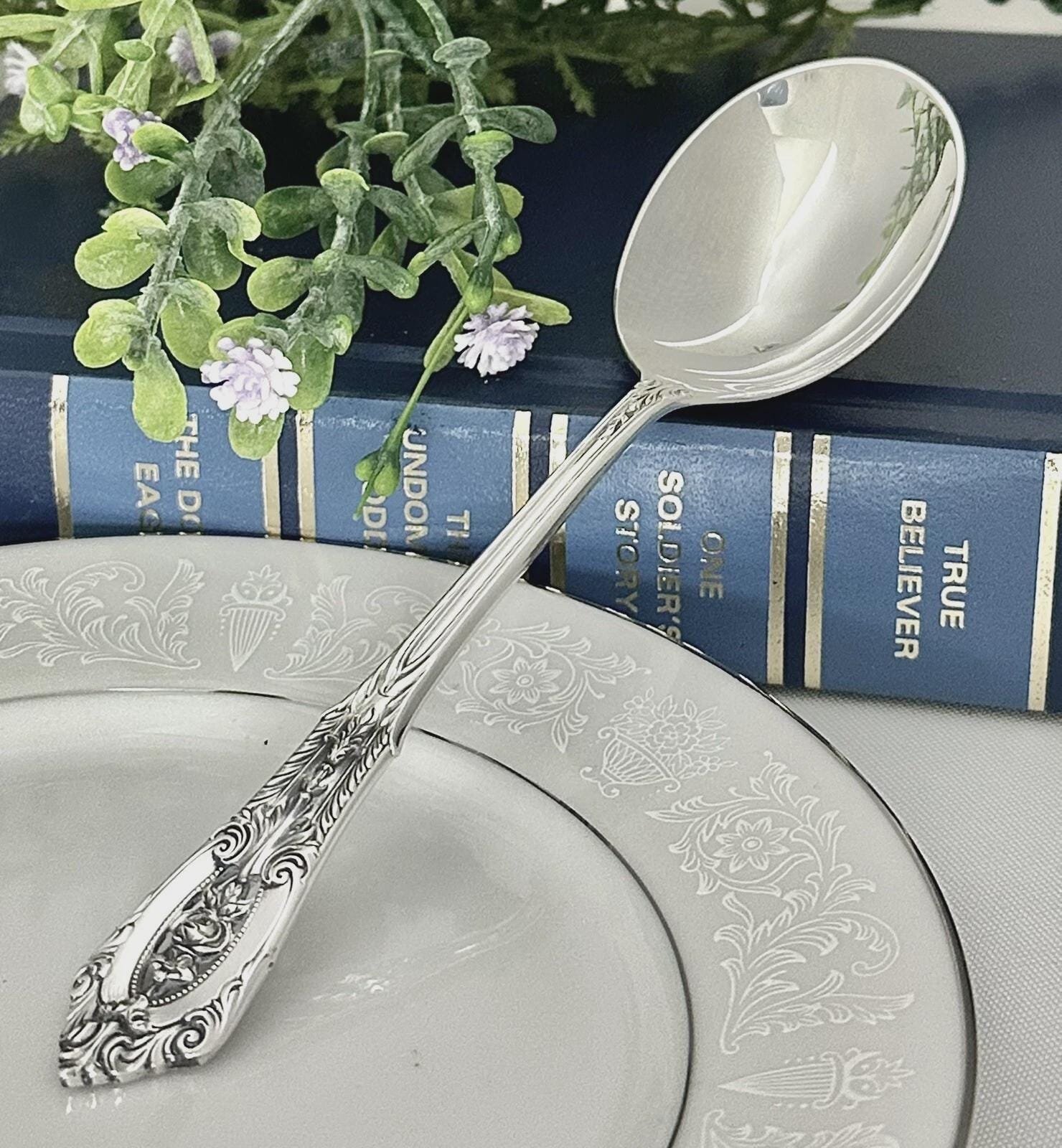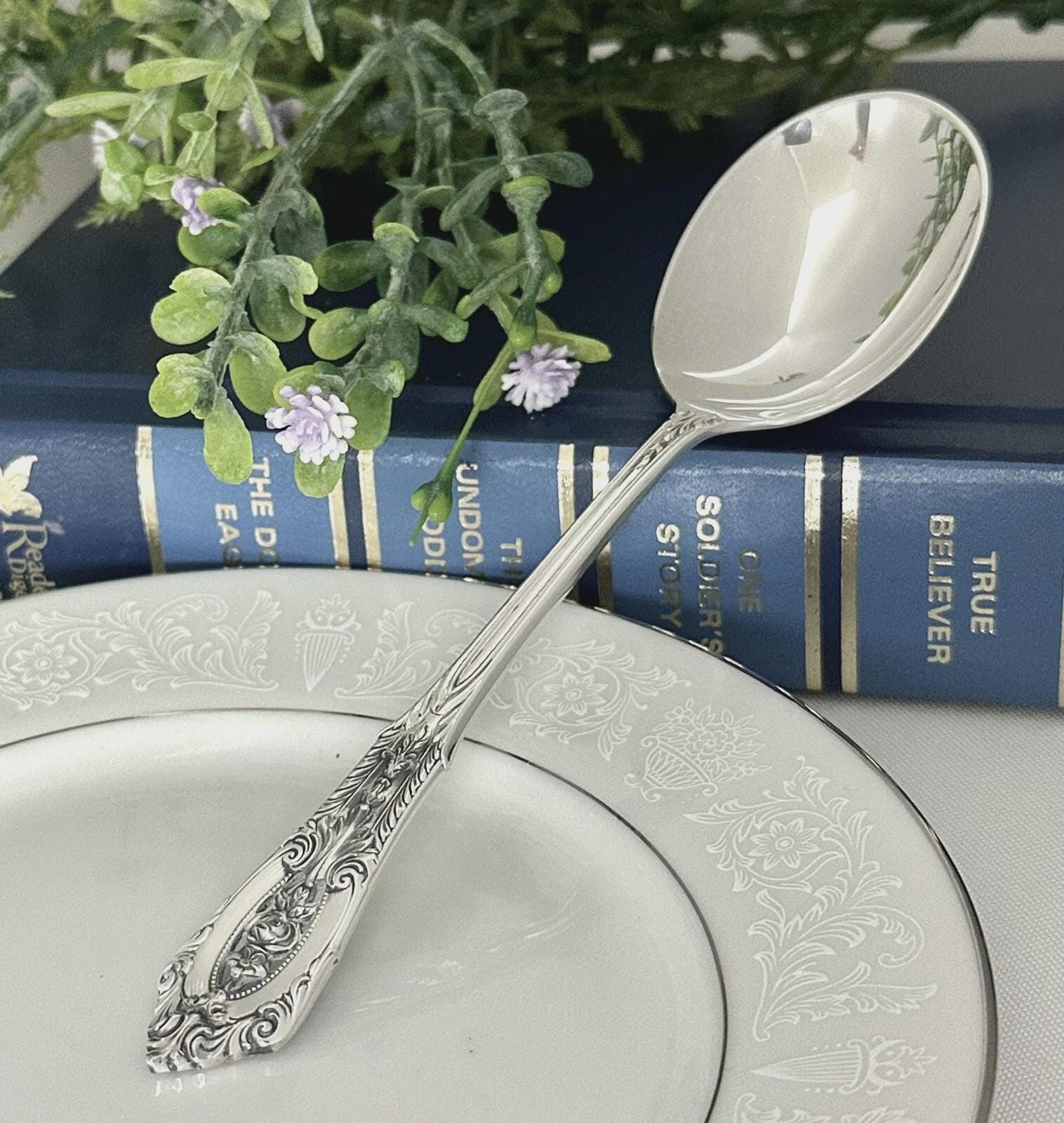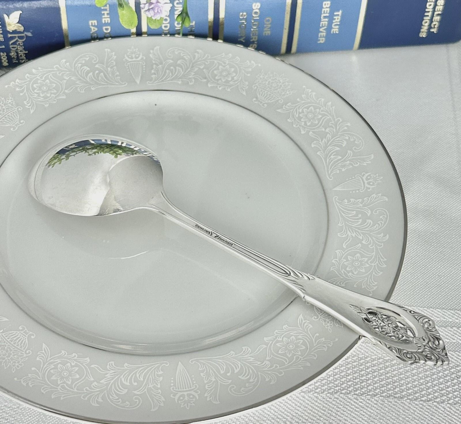 This is for 1 vintage Soup / Round Bowl Spoon in the Rose Point pattern from Wallace. This was produced in 1934 and has NO monogram.