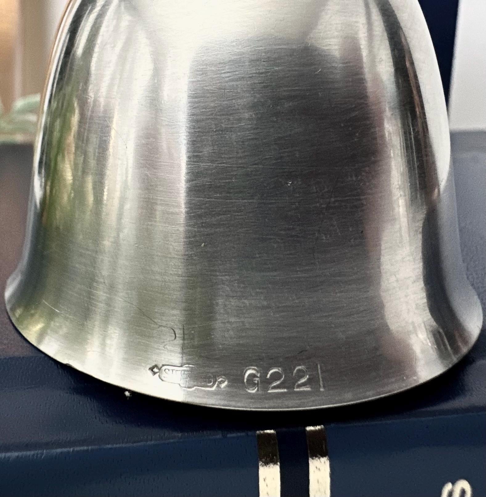 This piece is monogrammed F.D.G. on the larger side. It is marked with a very small "sterling" and G221.
