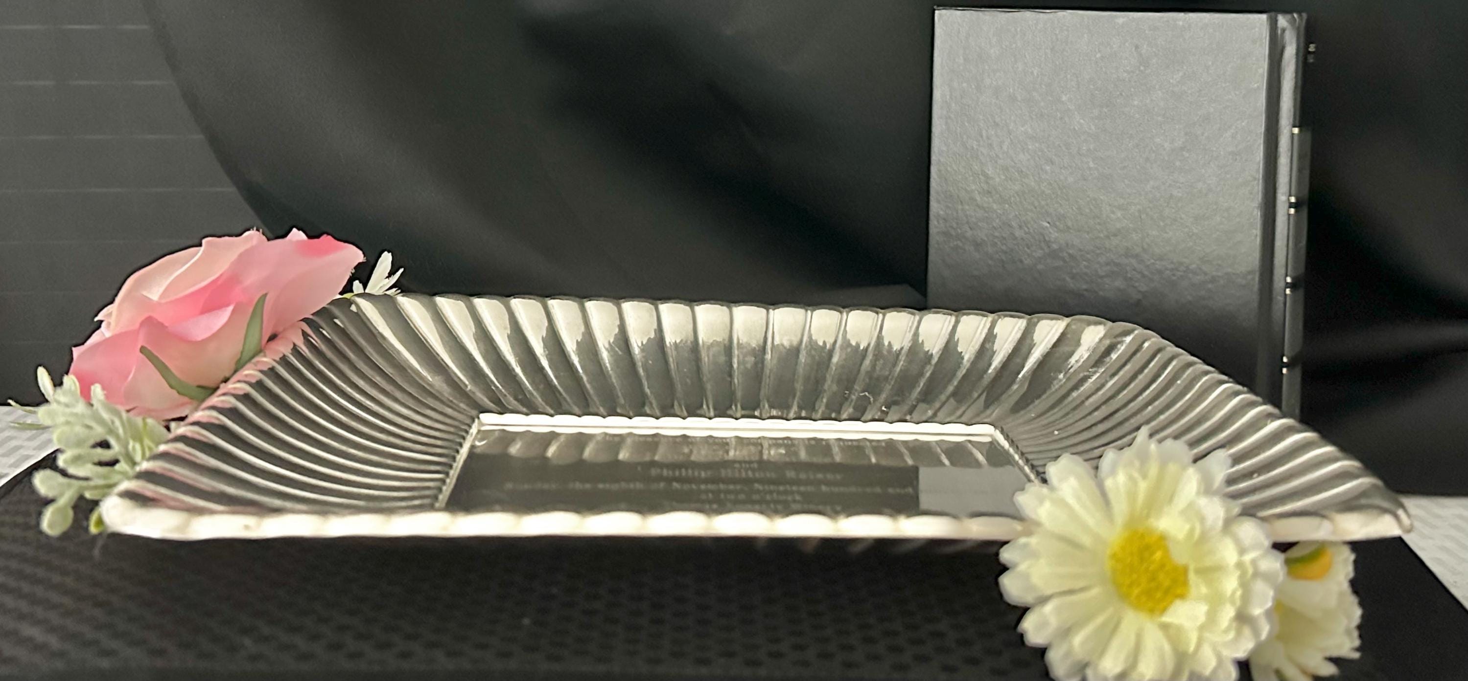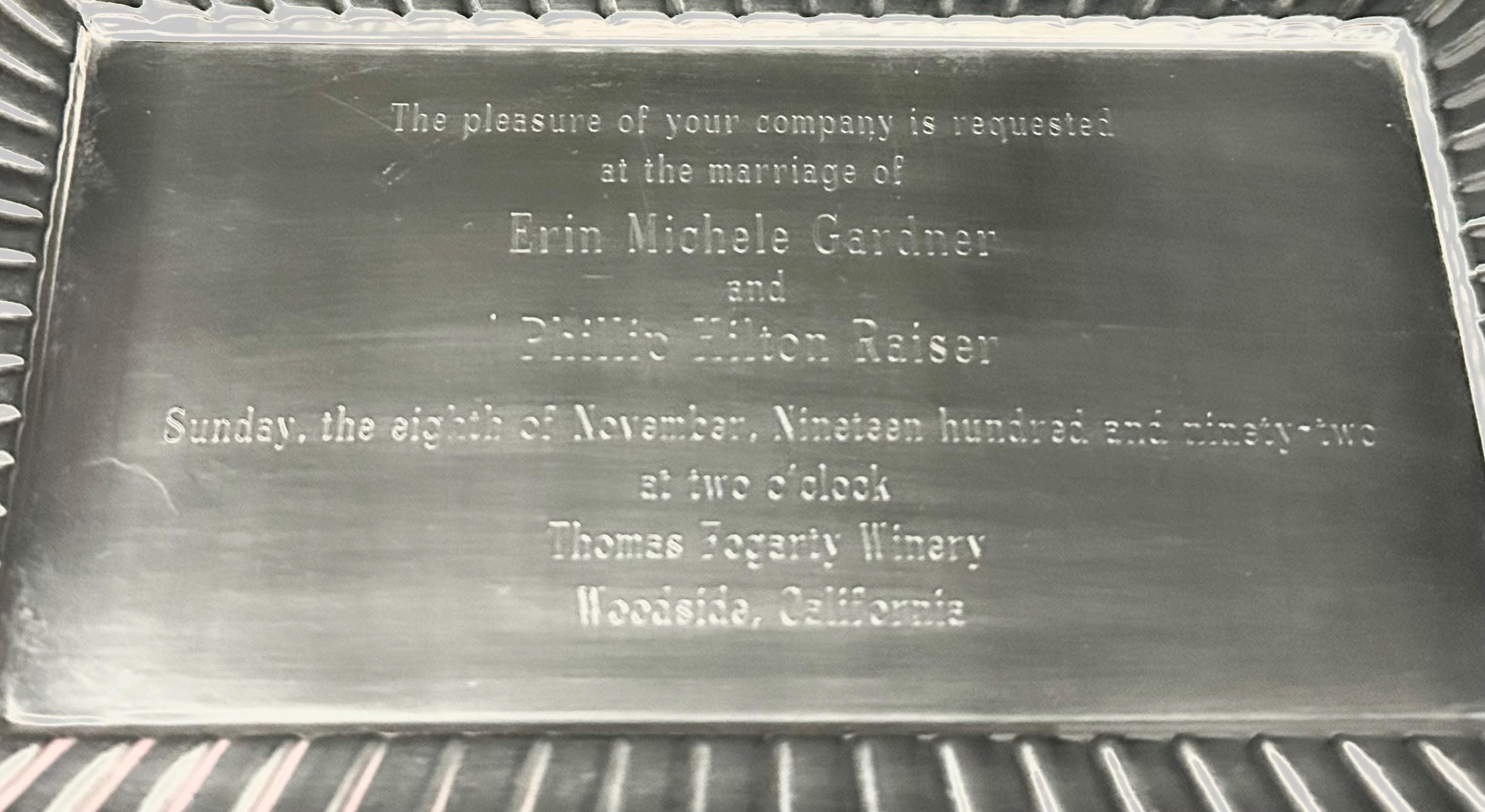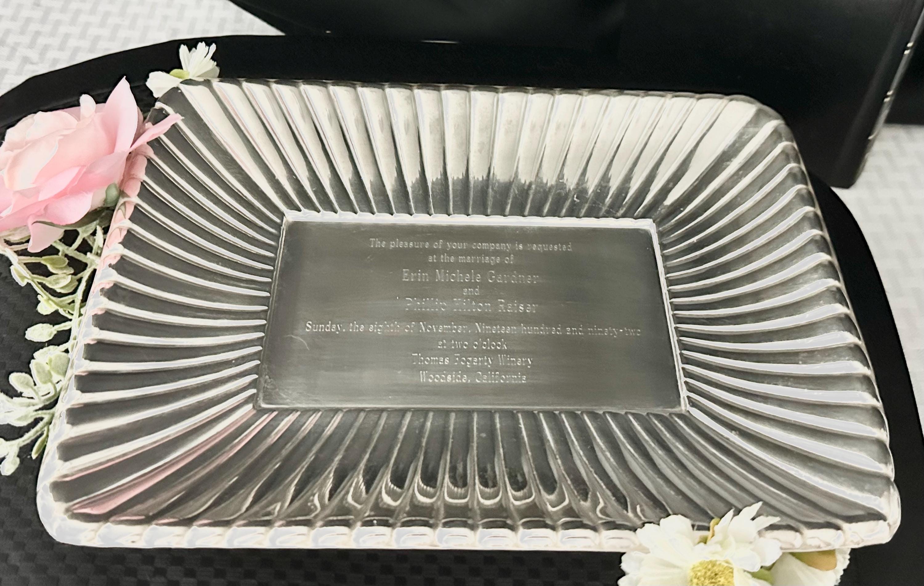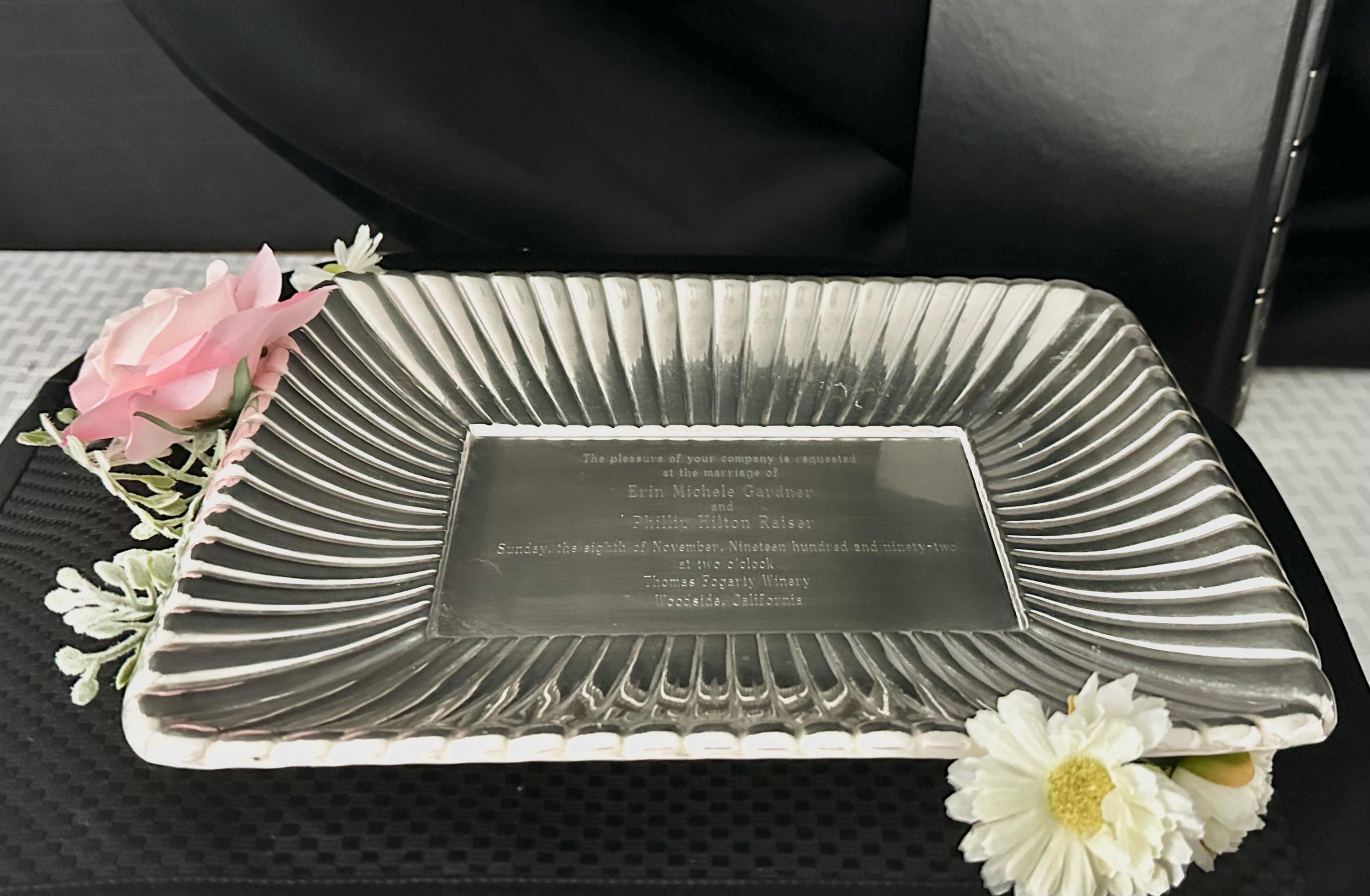 This is for a vintage Sterling silver Sandwich Plate. Elevate your hosting elegance with the Reed & Barton Georgian-style sterling silver tray that exudes classic charm. The tray is etched with a wedding invitation, refer to pictures for wording. This wonderful tray was Crafted in 1941.