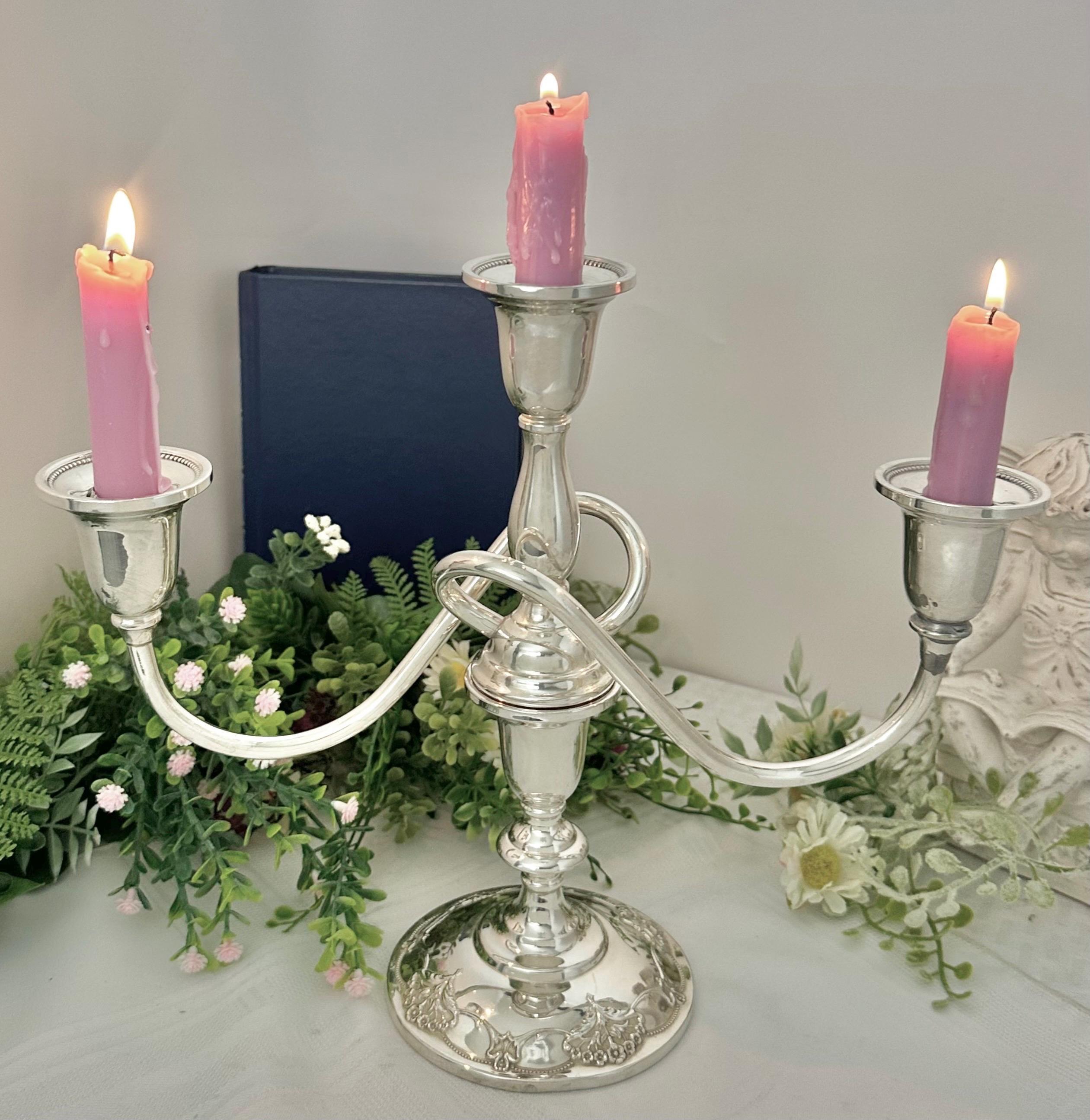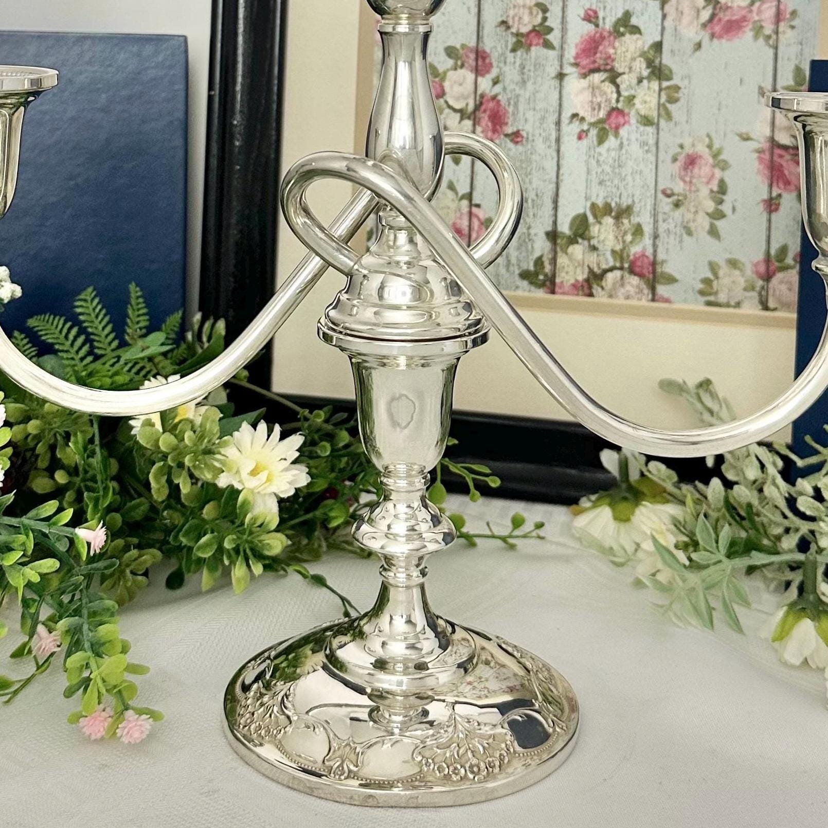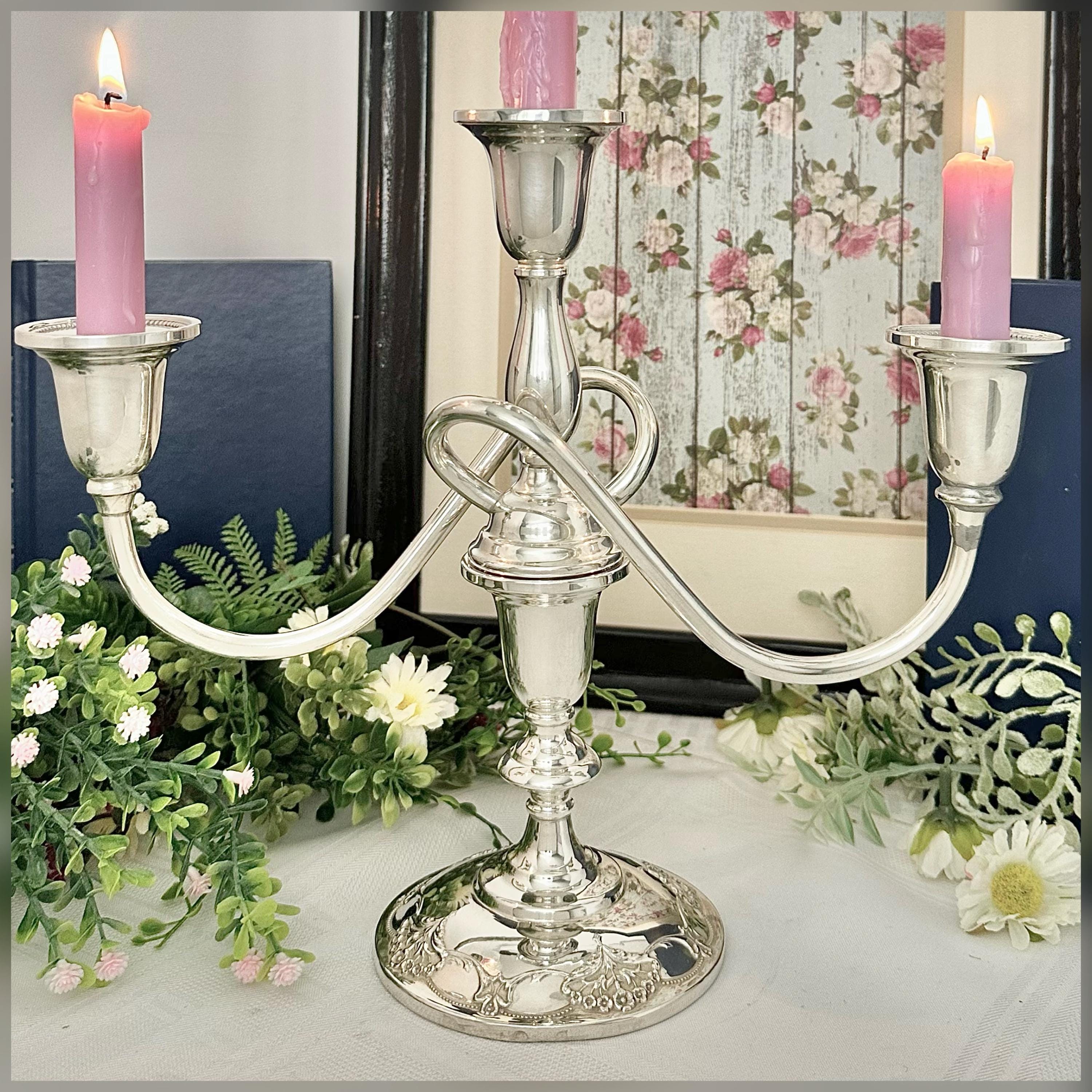 **This is discounted as there is a repair on one of the candle cups, looks as if soldiered together with silver, not a glue. It does not distract from the beauty of the vintage candelabra at all, and is still in wonderful Vintage condition. Please look at the picture with the pen pointed at the repaired spot.