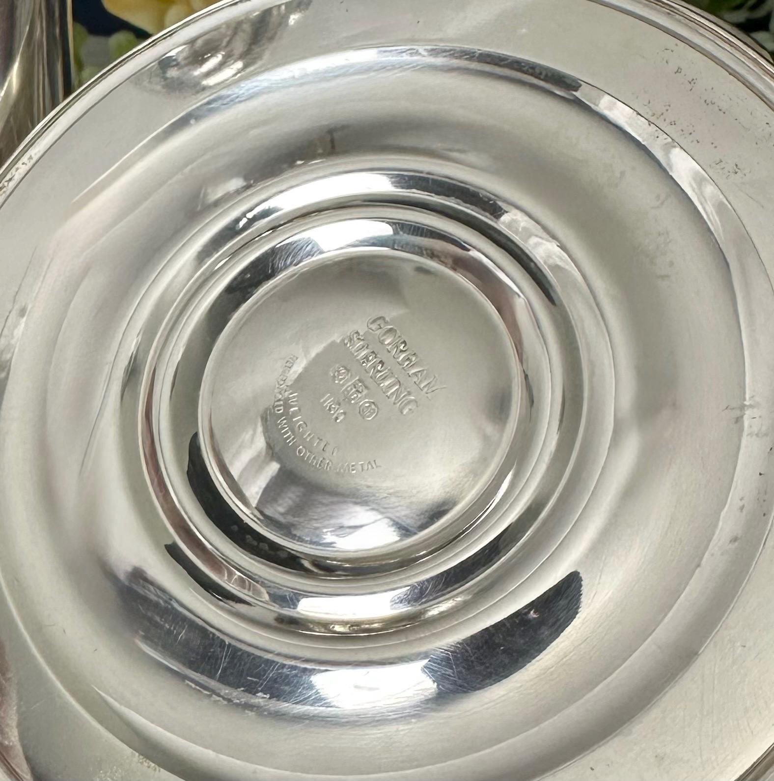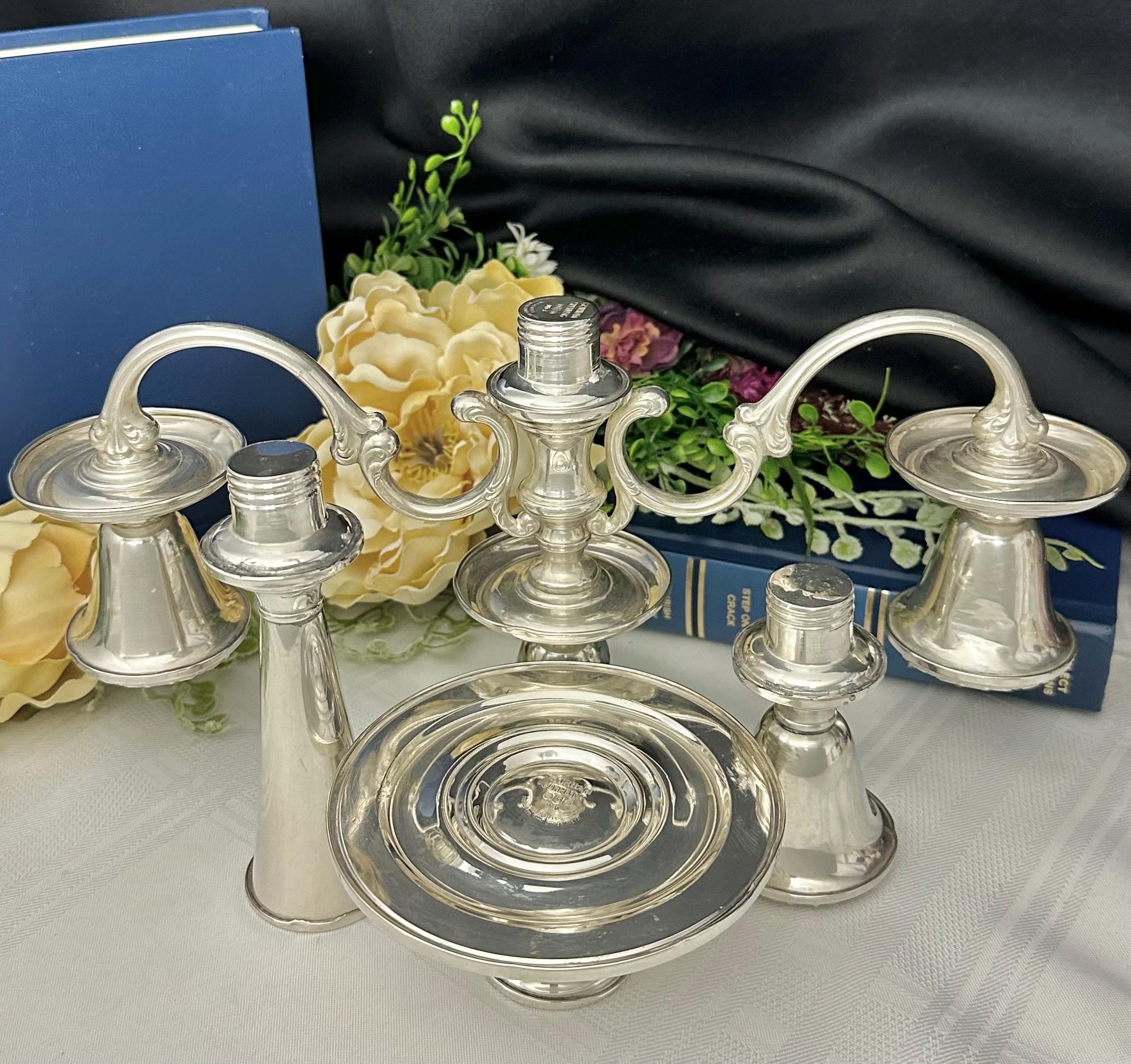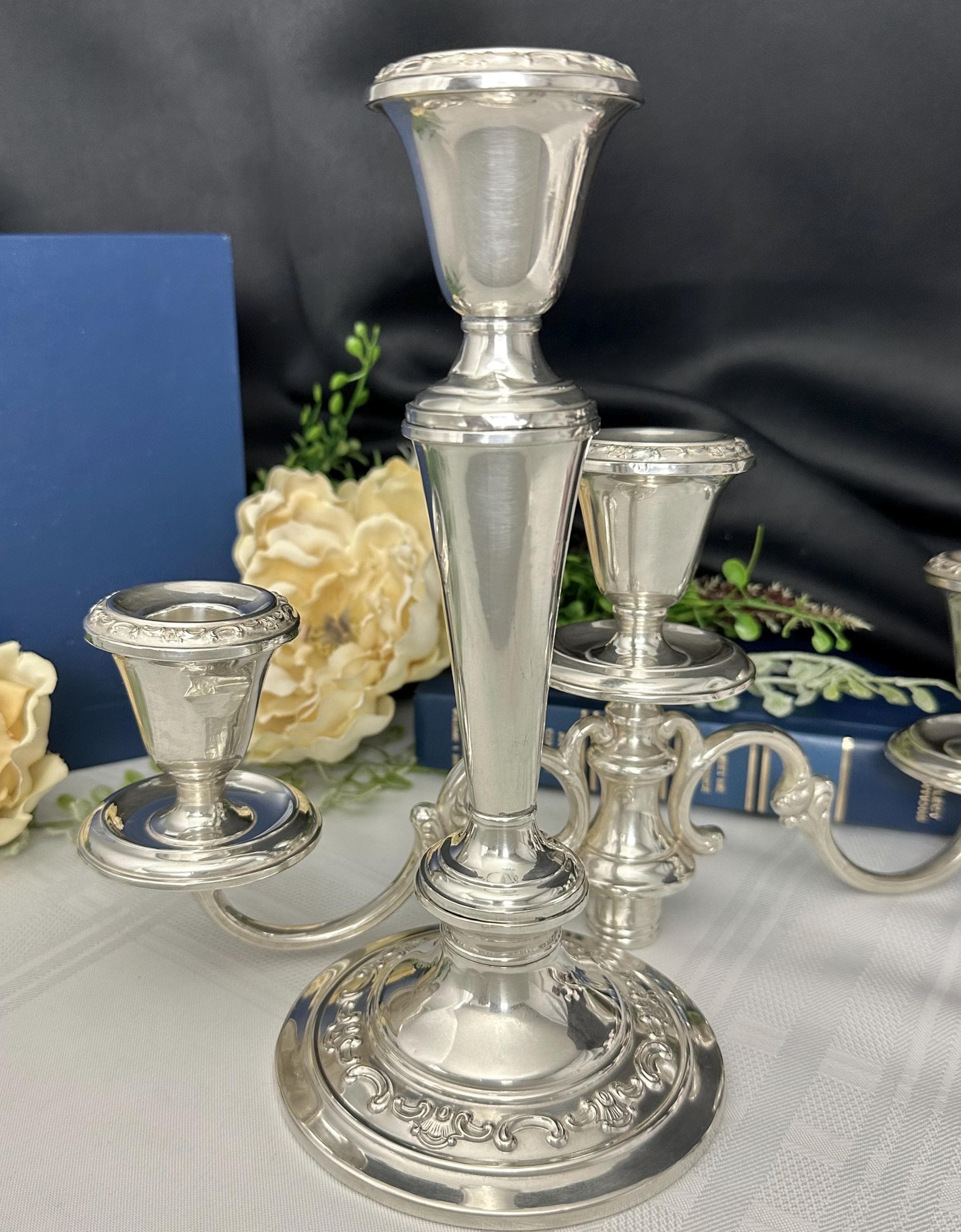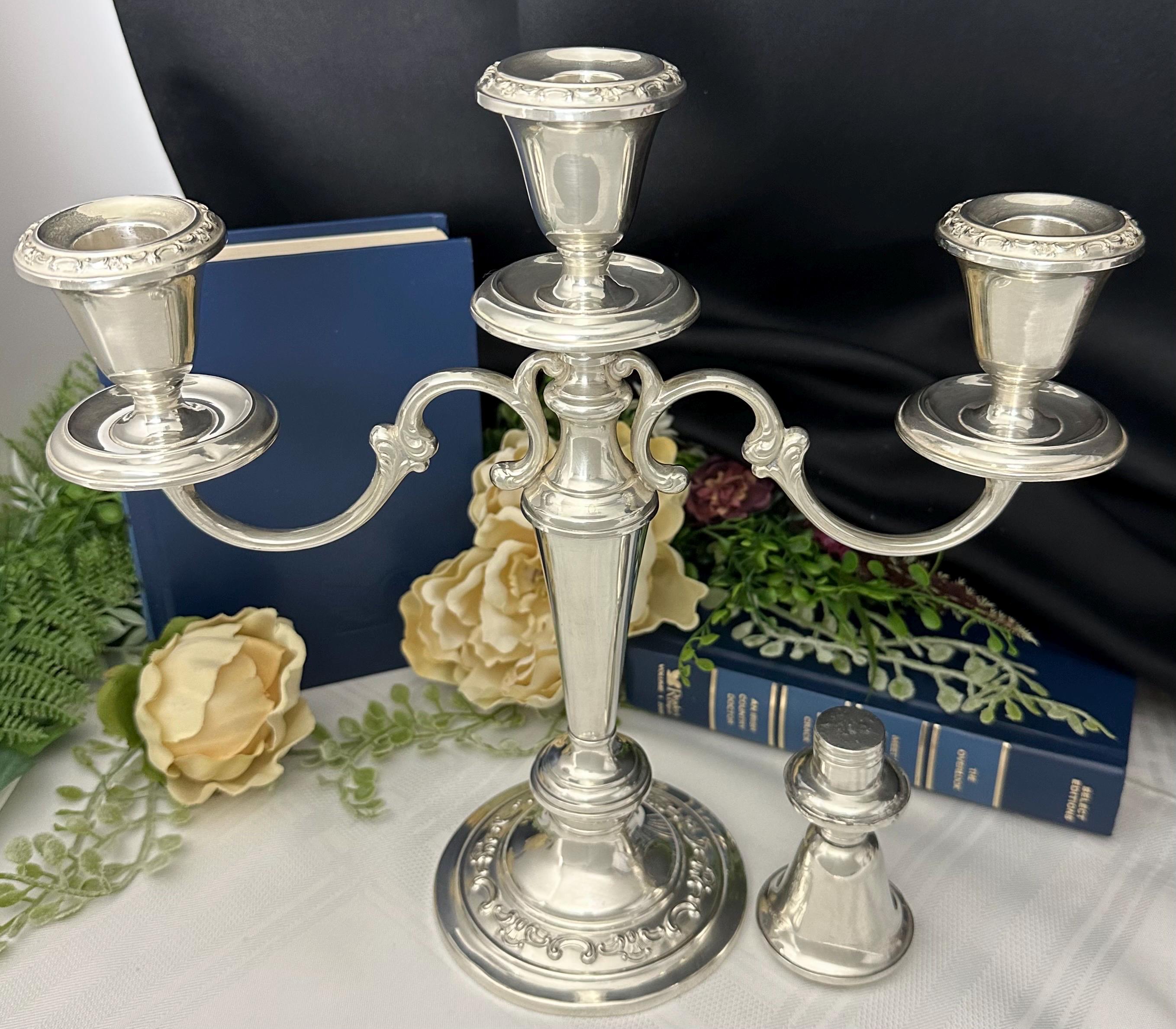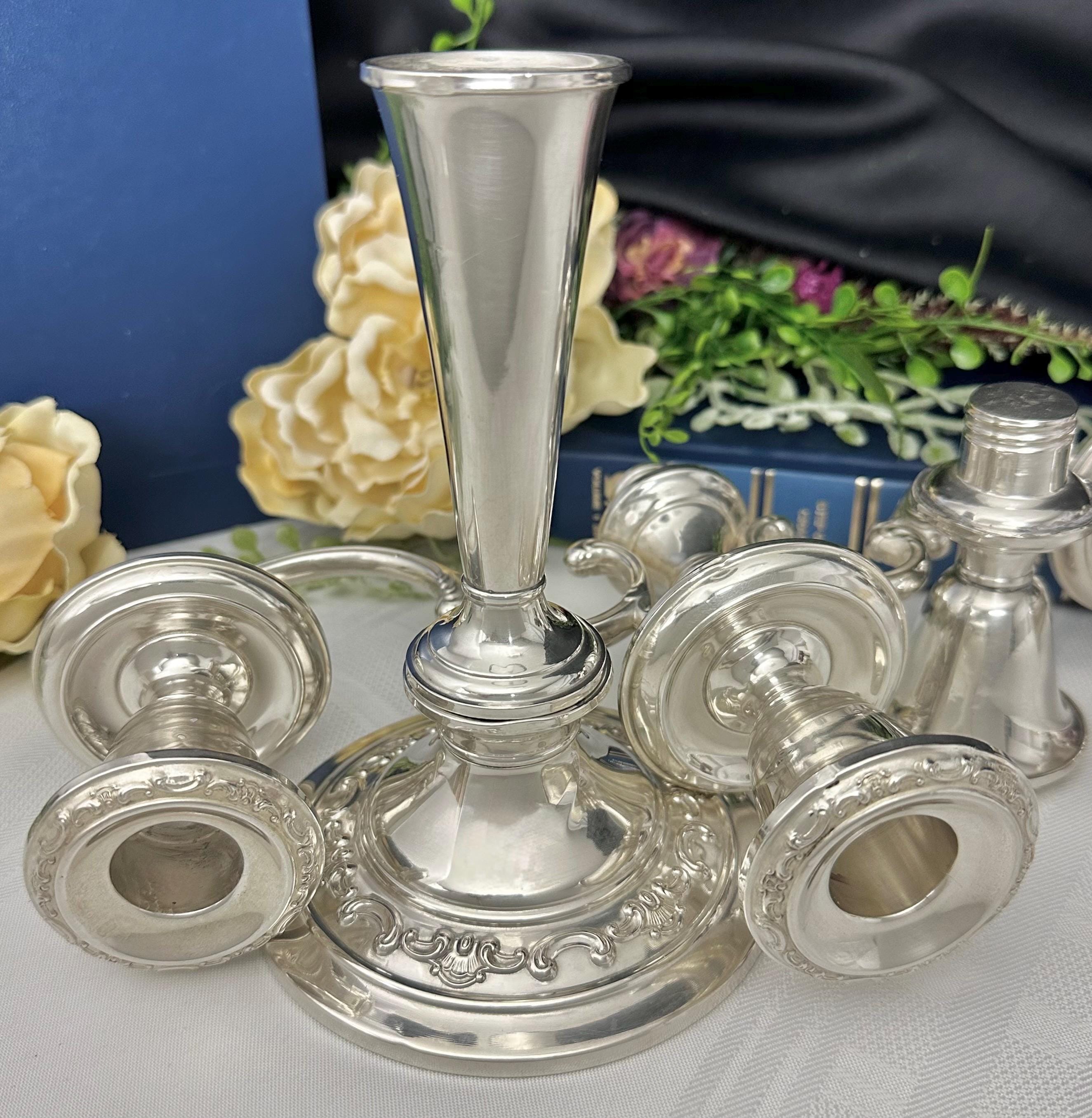 Made in the United States by renowned brand Gorham, this vintage silver candelabra exudes sophistication and timeless style for adding ambiance to any space. The piece with all 4 pieces used stands at the tallest height and holds 3 dinner taper candles. It can also be configured to hold one candle.