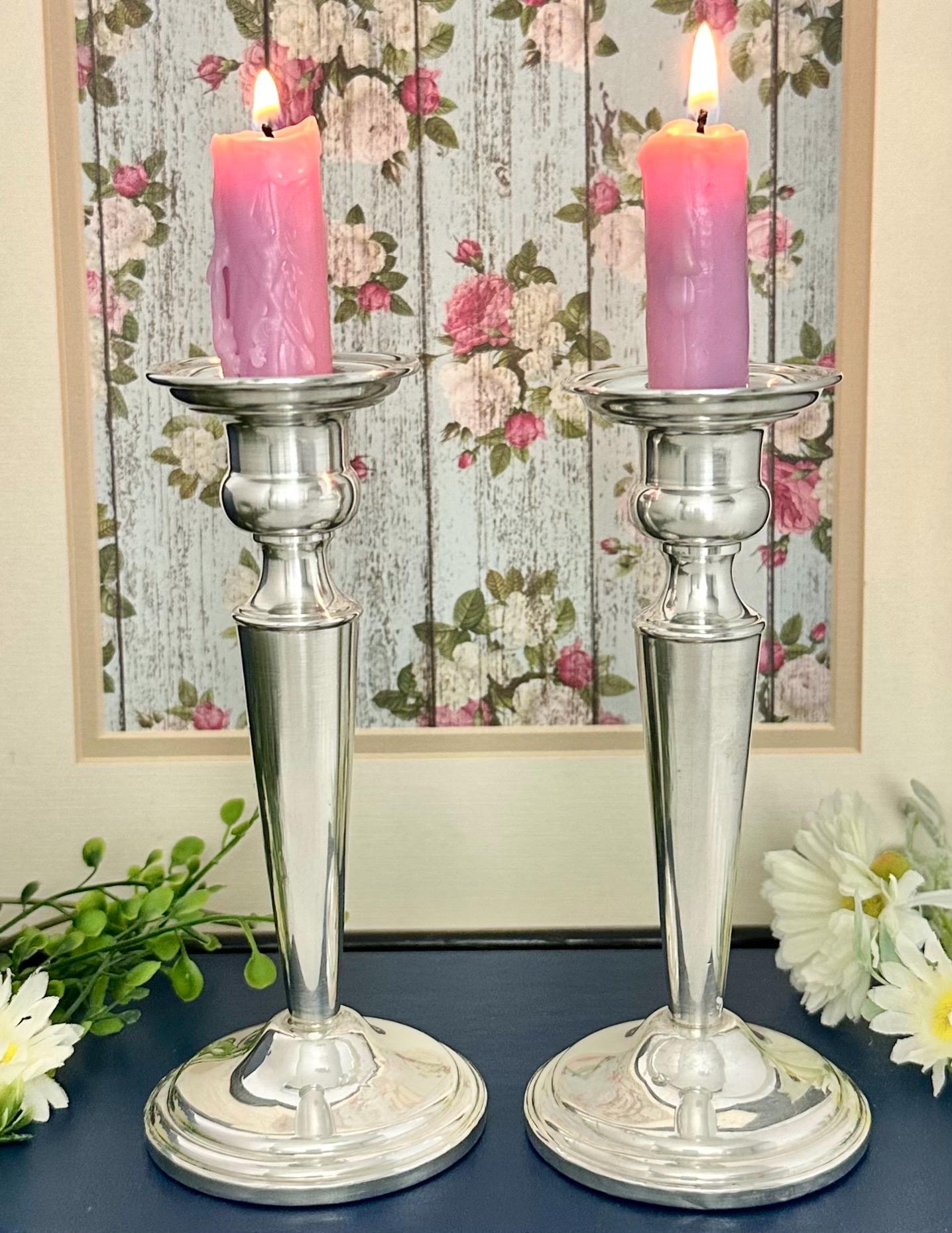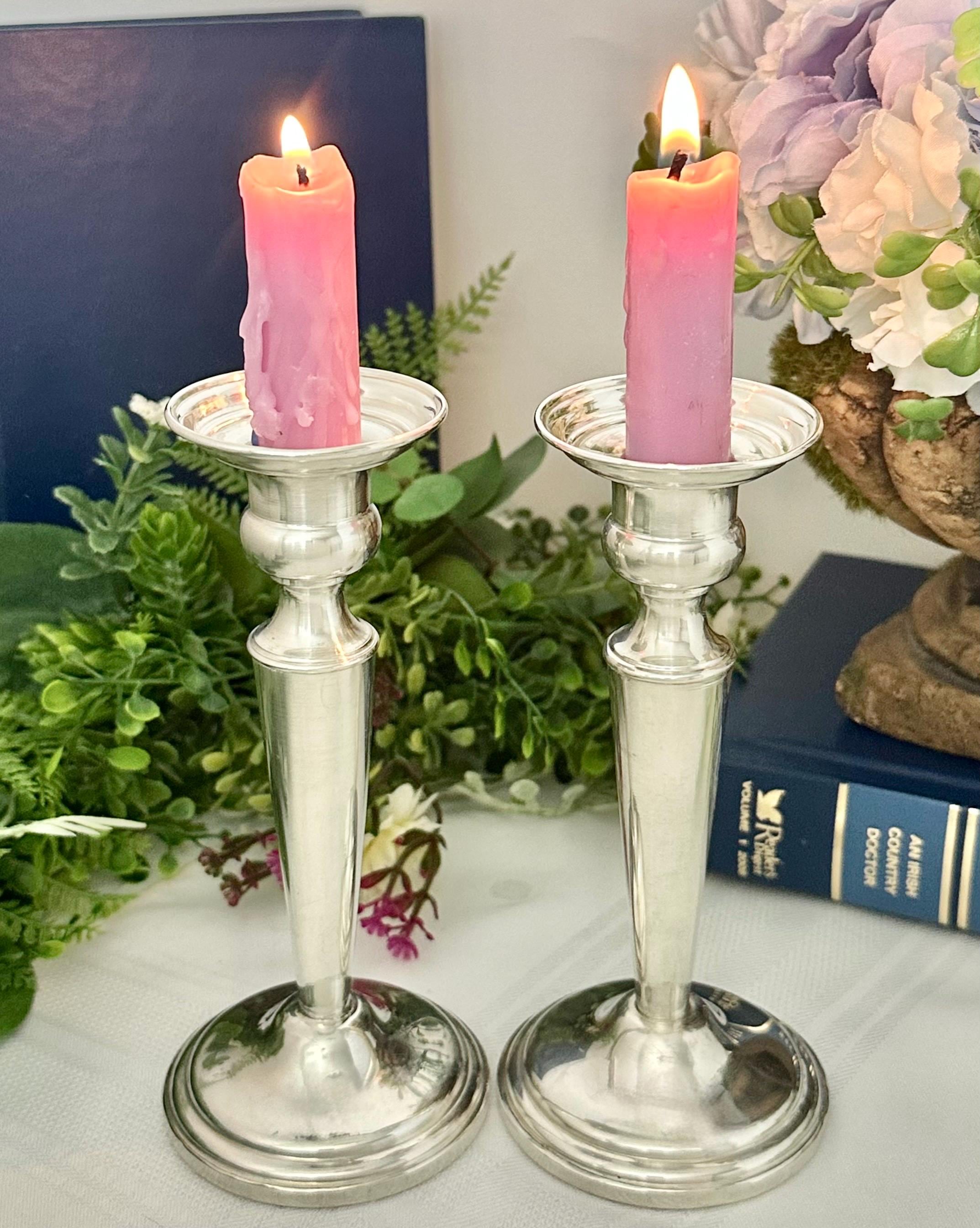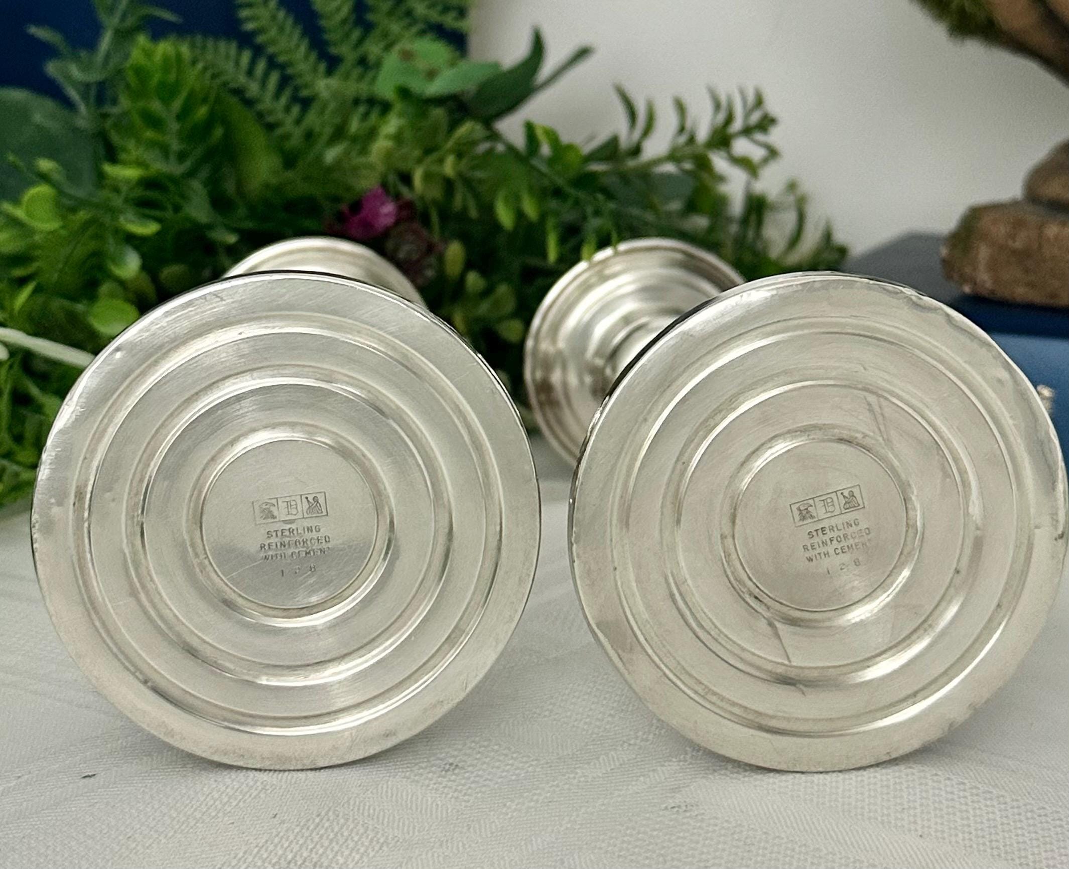 This vintage pair of Sterling Silver Candle Holders is a classic and elegant addition to any home decor. These weight 340 grams and are weighted and reinforced. These are in lovely condition and perfect for holding your favorite dinner / taper candles. These measure 6 inches tall with a diameter of 2 3/4 inches.