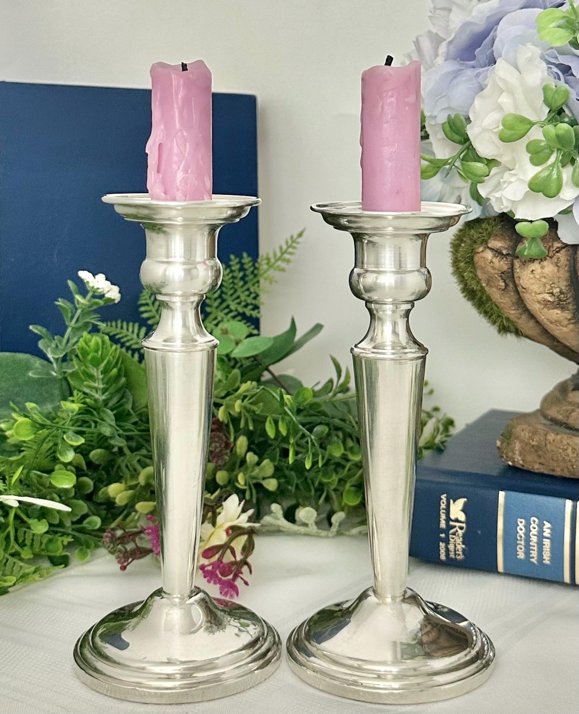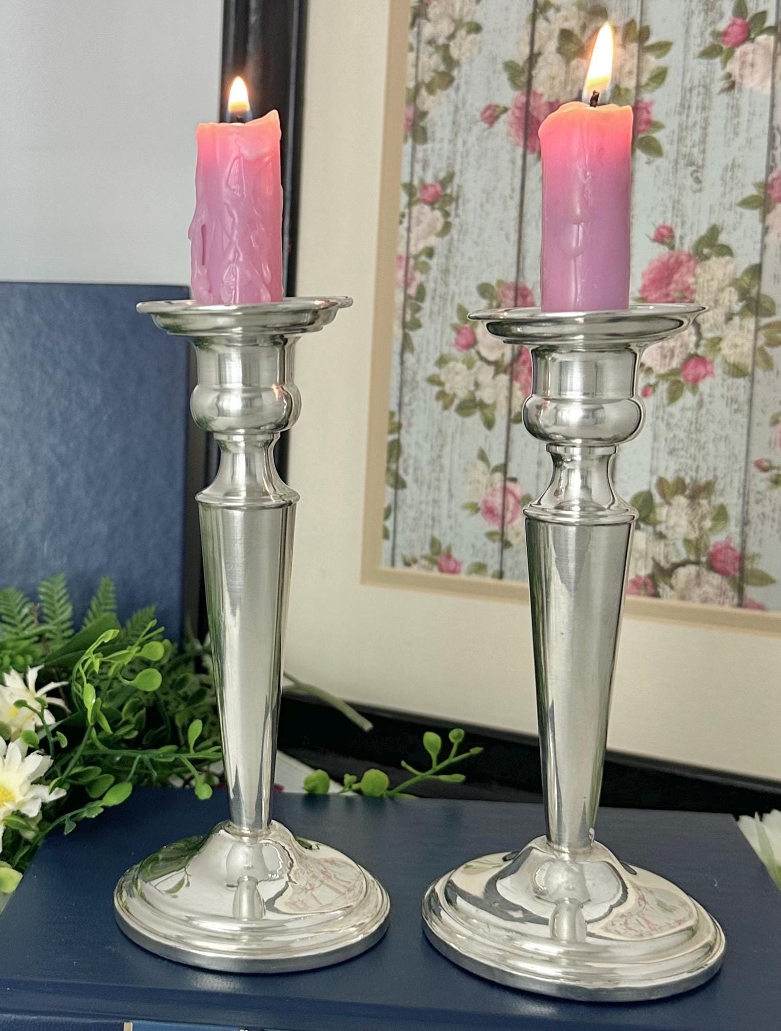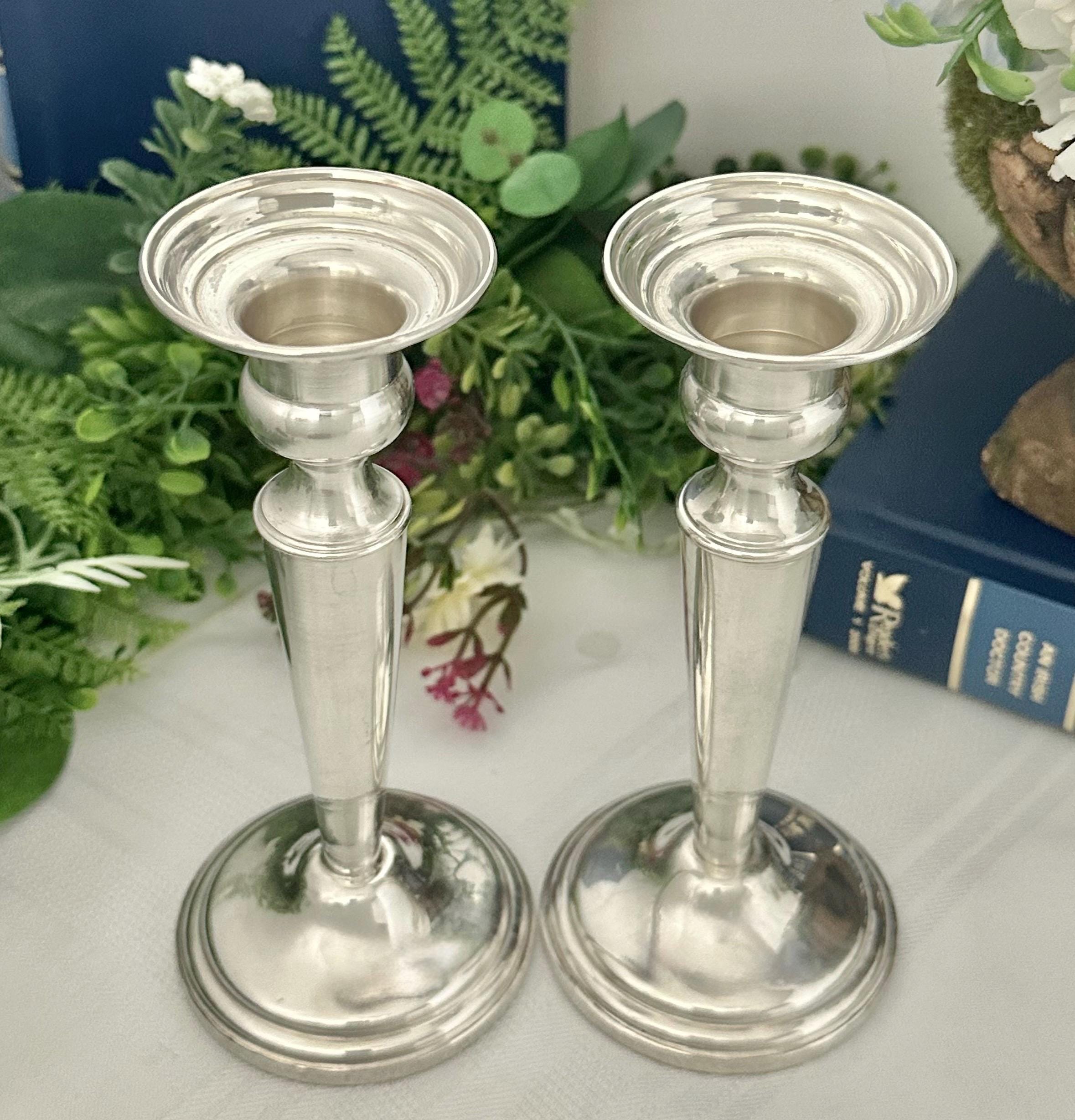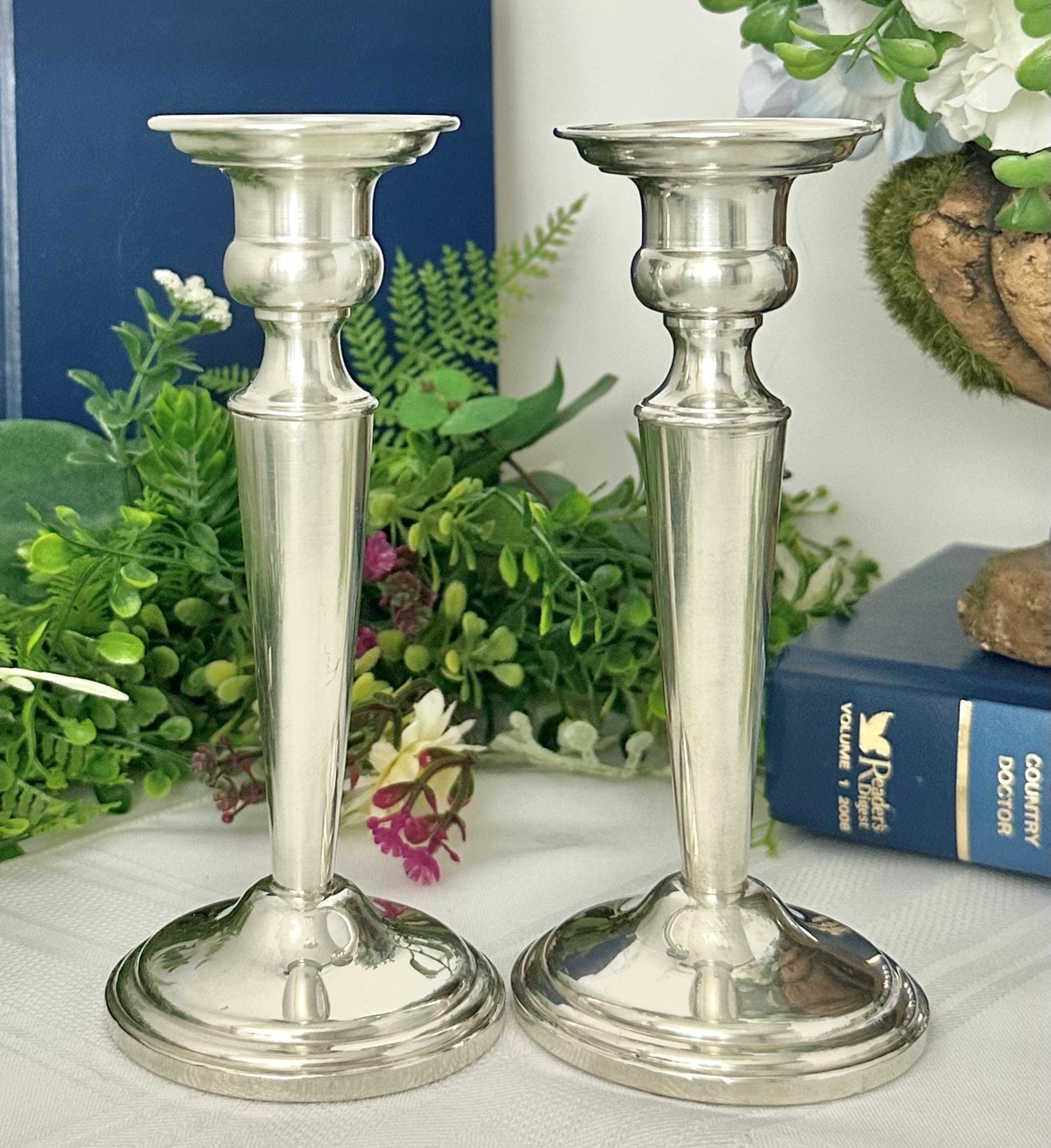 This vintage pair of Sterling Silver Candle Holders is a classic and elegant addition to any home decor. These weight 340 grams and are weighted and reinforced. These are in lovely condition and perfect for holding your favorite dinner / taper candles. These measure 6 inches tall with a diameter of 2 3/4 inches.