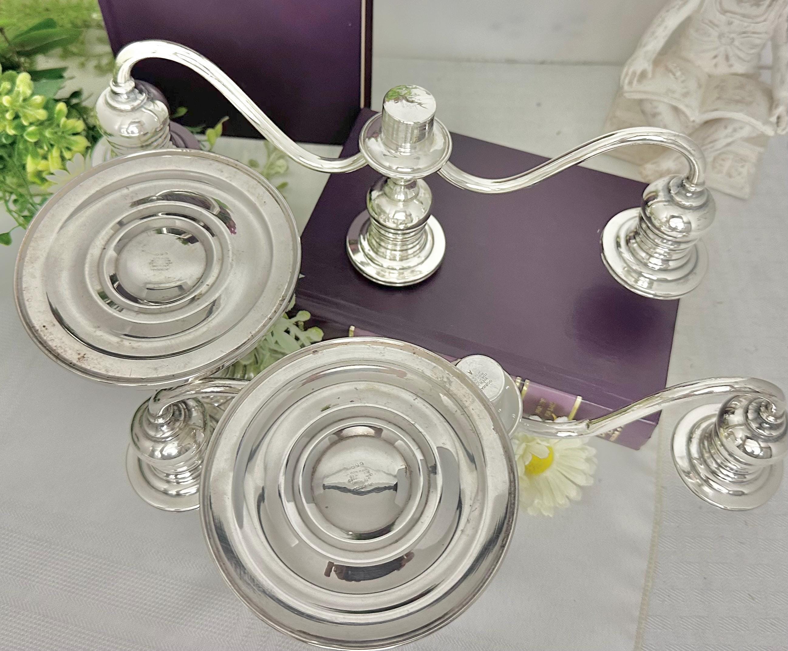 This is for a pair of Gorham Sterling Silver Candelabras. The Pair is a stunning silver candle holder set that features the classic 659 pattern (seen listed as Pilgrim and Old French pattern name). Made of sterling silver with a composition of .925, these candelabras are crafted with a depth of 4.25 inches, a width of 11.5 inches, and a height of 8 inches.