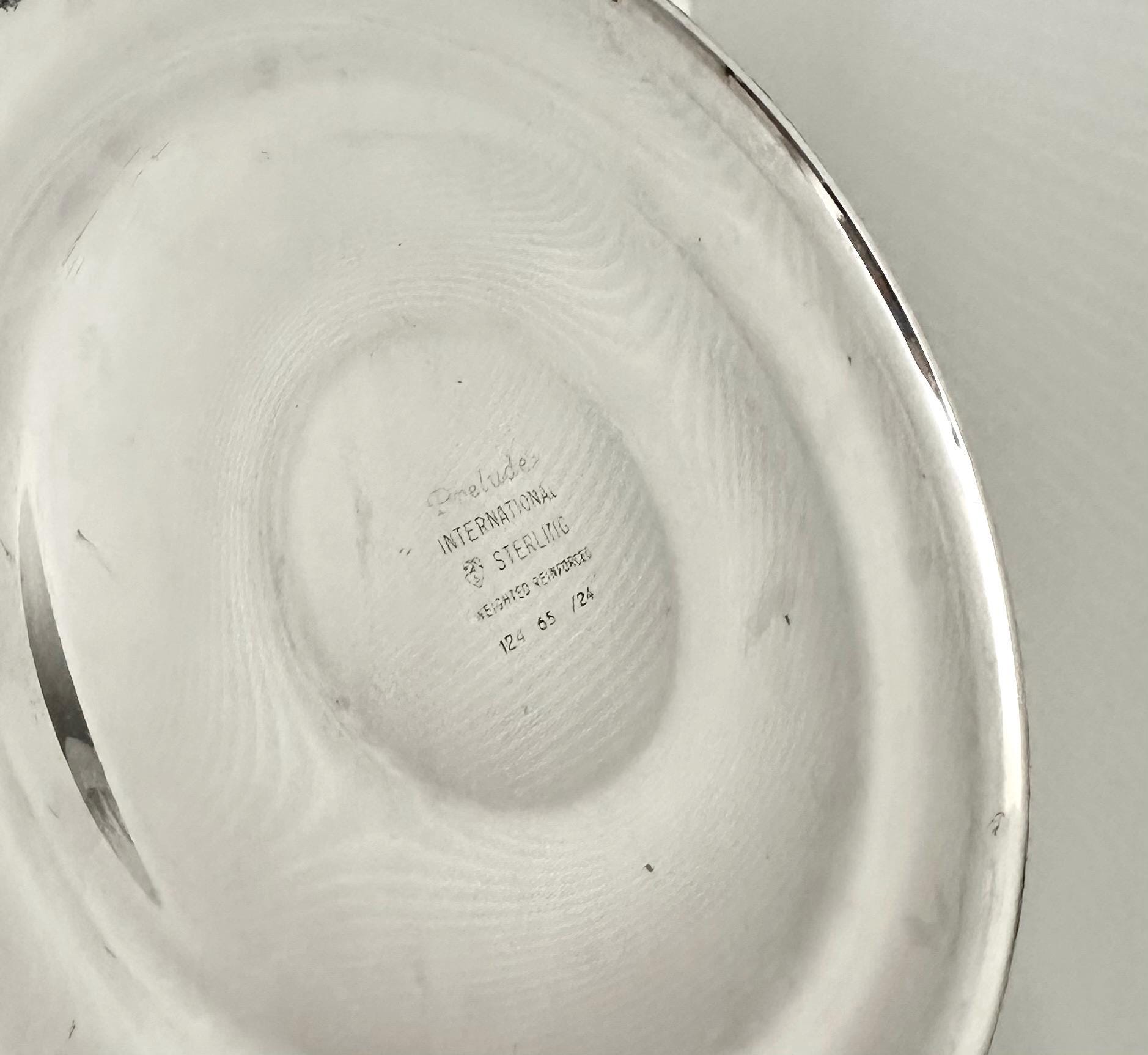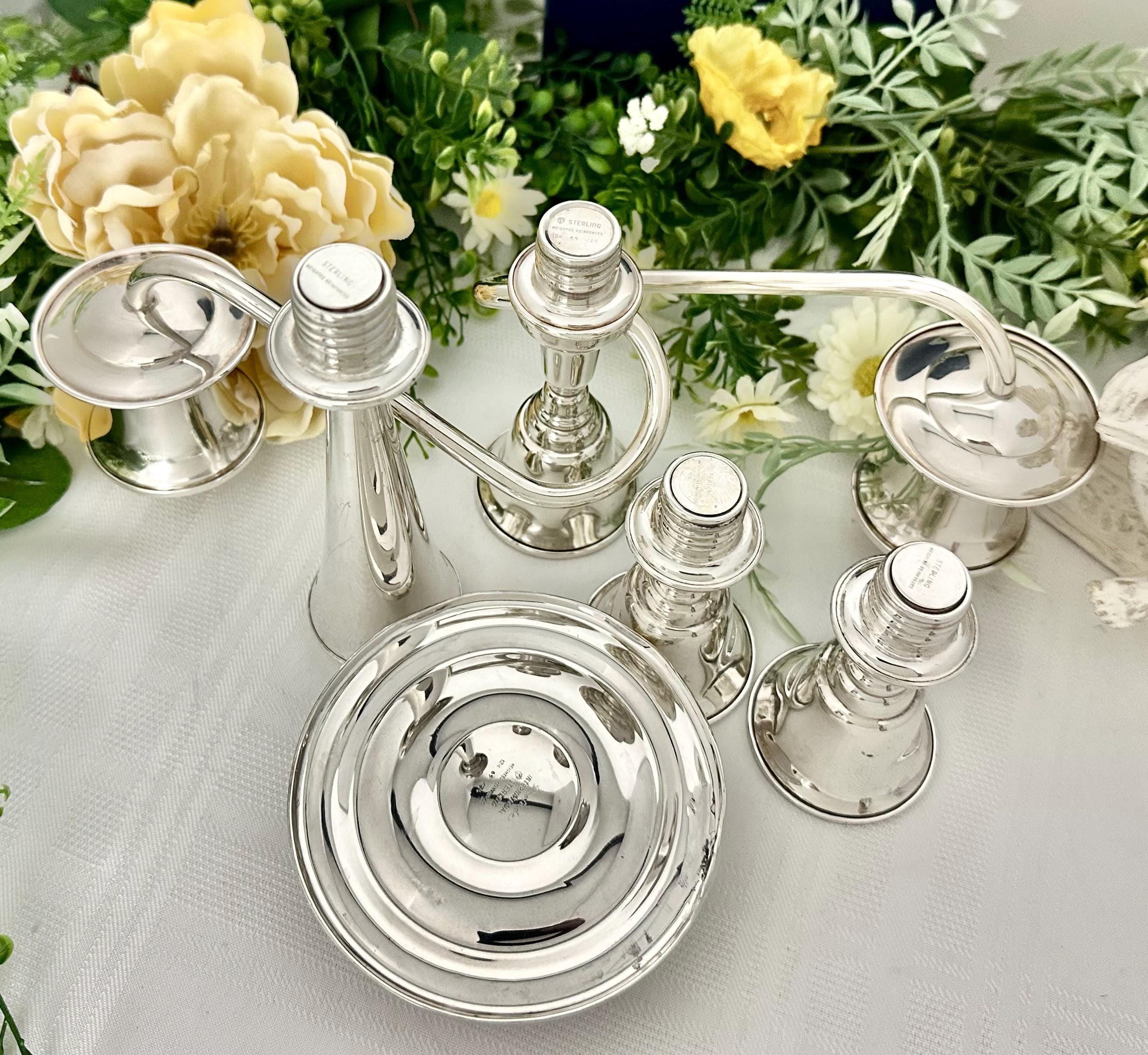 Made of sterling silver with a weight of 1092 grams, this candelabra has a depth of 4 inches, width of 11 inches, and height of 15.5 inches. This is marked on the foot with the makers name, Prelude, weighted and pattern number of 125 64 / 24. To make the larges configured candle holder it uses 4 pieces and displays 3 candles. Without the arms you can display a single dinner taper candle.