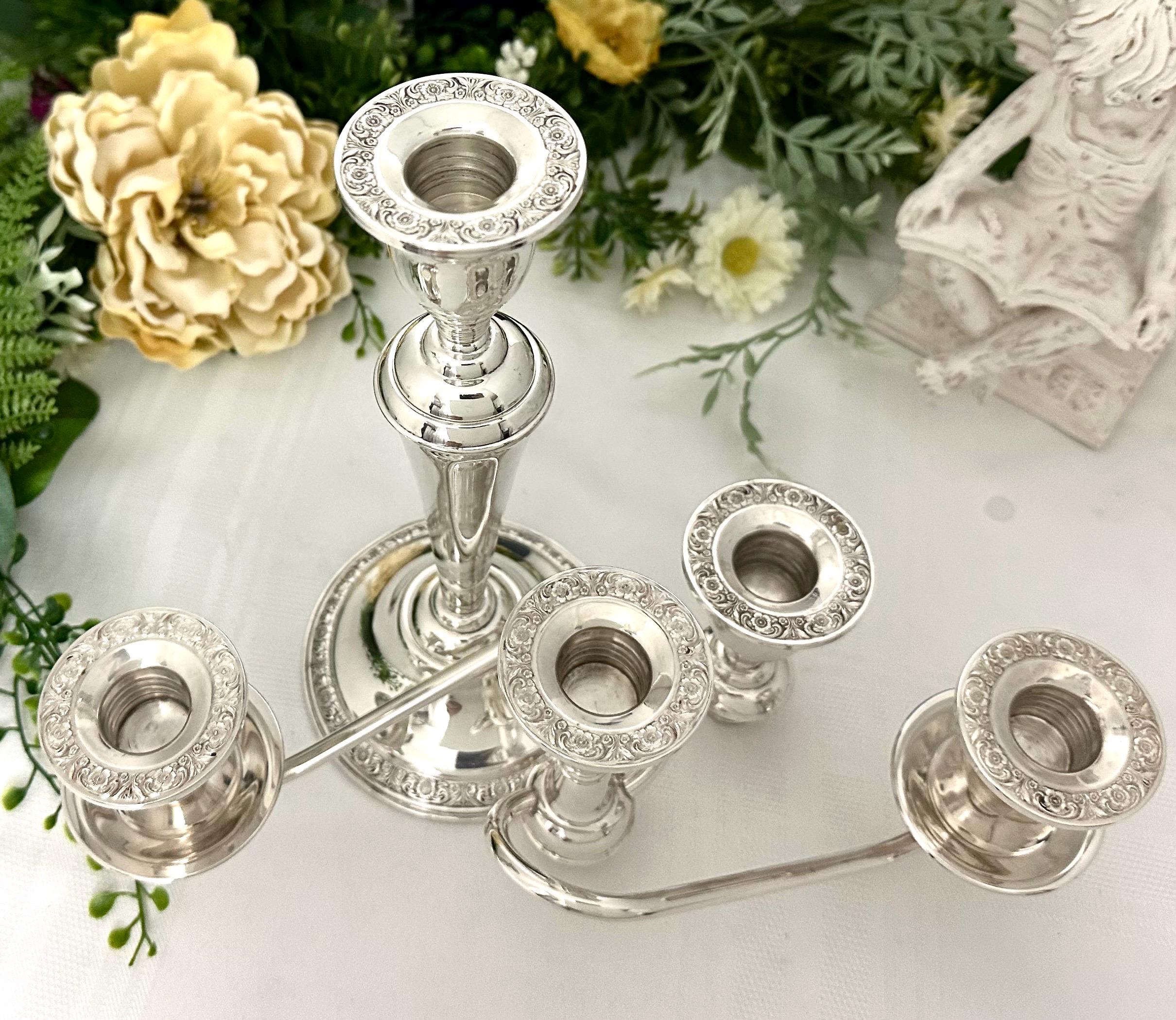 This is for a vintage International Prelude Sterling Silver 3 Arm Convertible Candelabra with decorated large twisted arms. This is a stunning piece crafted by International Silver, featuring a Victorian style design and side candle drip cups. Note all the pieces that have the beautiful floral design on the candle cups including the base.