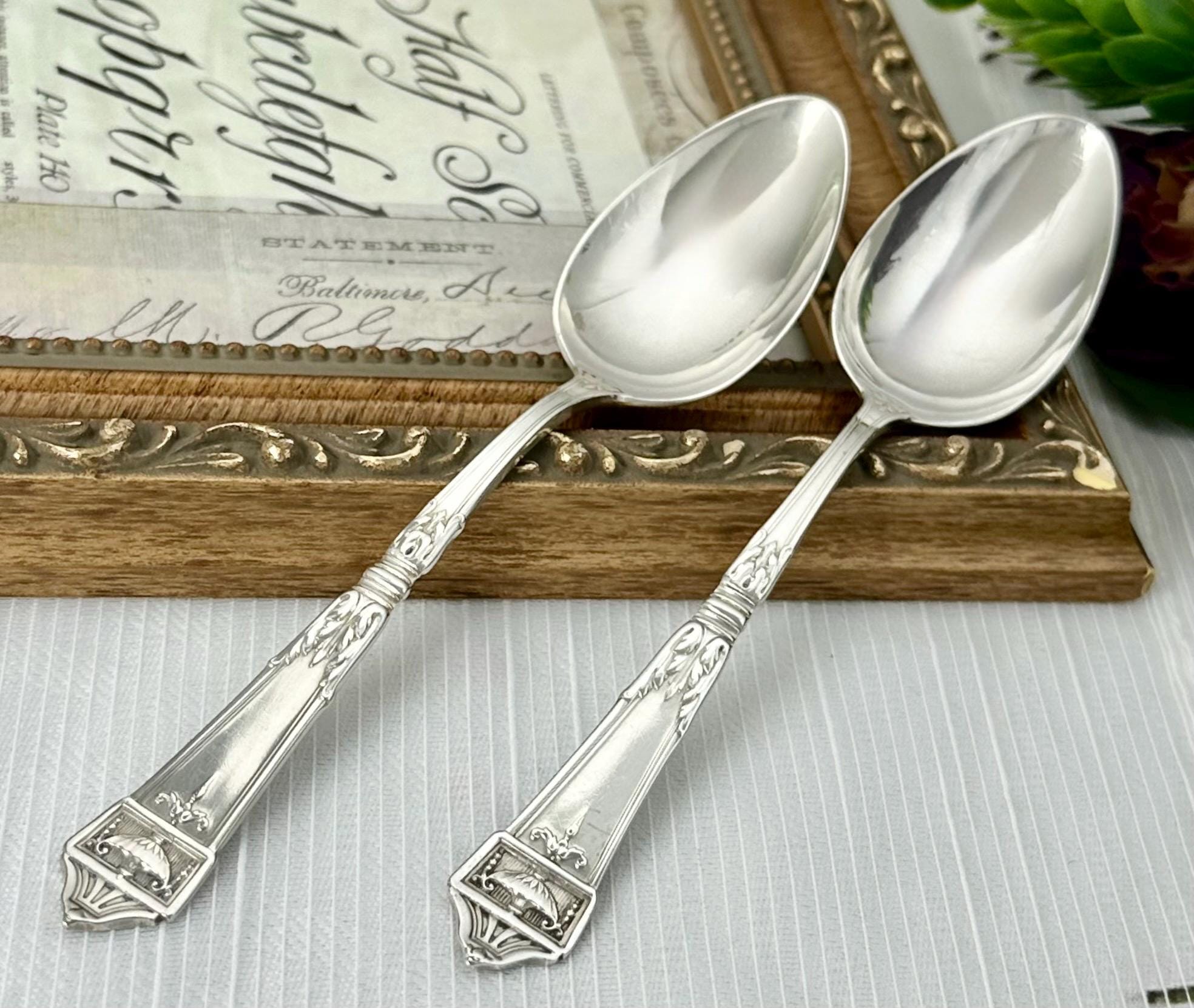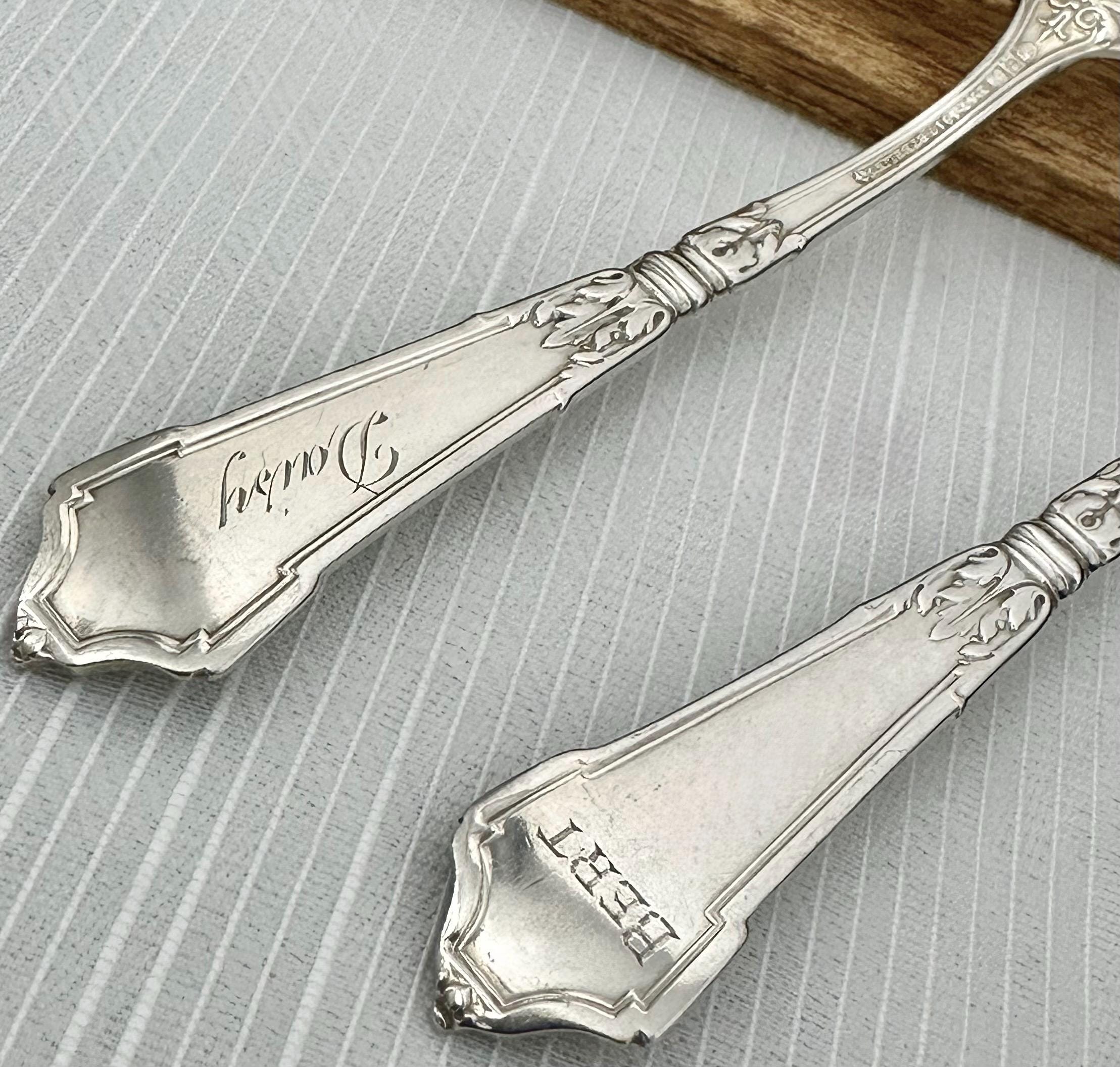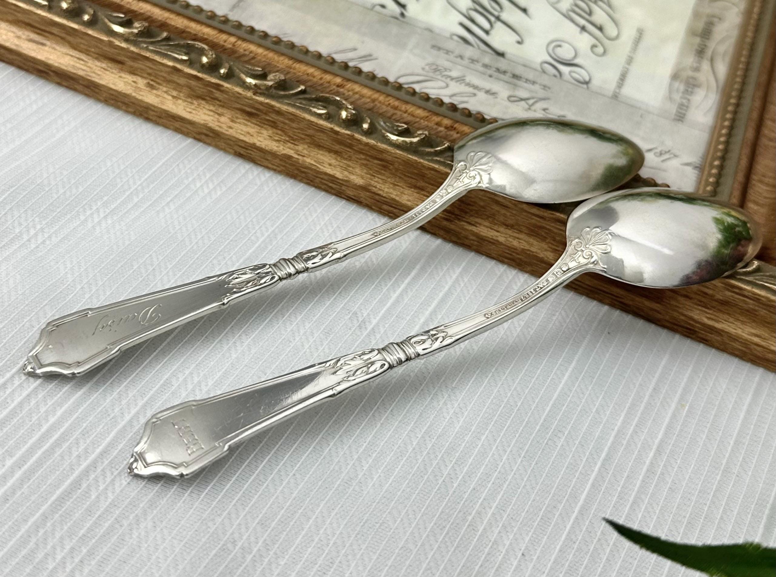 This is for 2 Gorham Lansdowne (1917) Sterling Silver Teaspoons. These are rare and elegant pieces of antique silverware dating back to the early 1900s. These 5 7/8 inch spoons feature an intricate Art Nouveau styling and are monogrammed on the back. Crafted from high-quality sterling silver, these teaspoons exude sophistication and charm, making them a unique and sought-after items for collectors of vintage silverware.