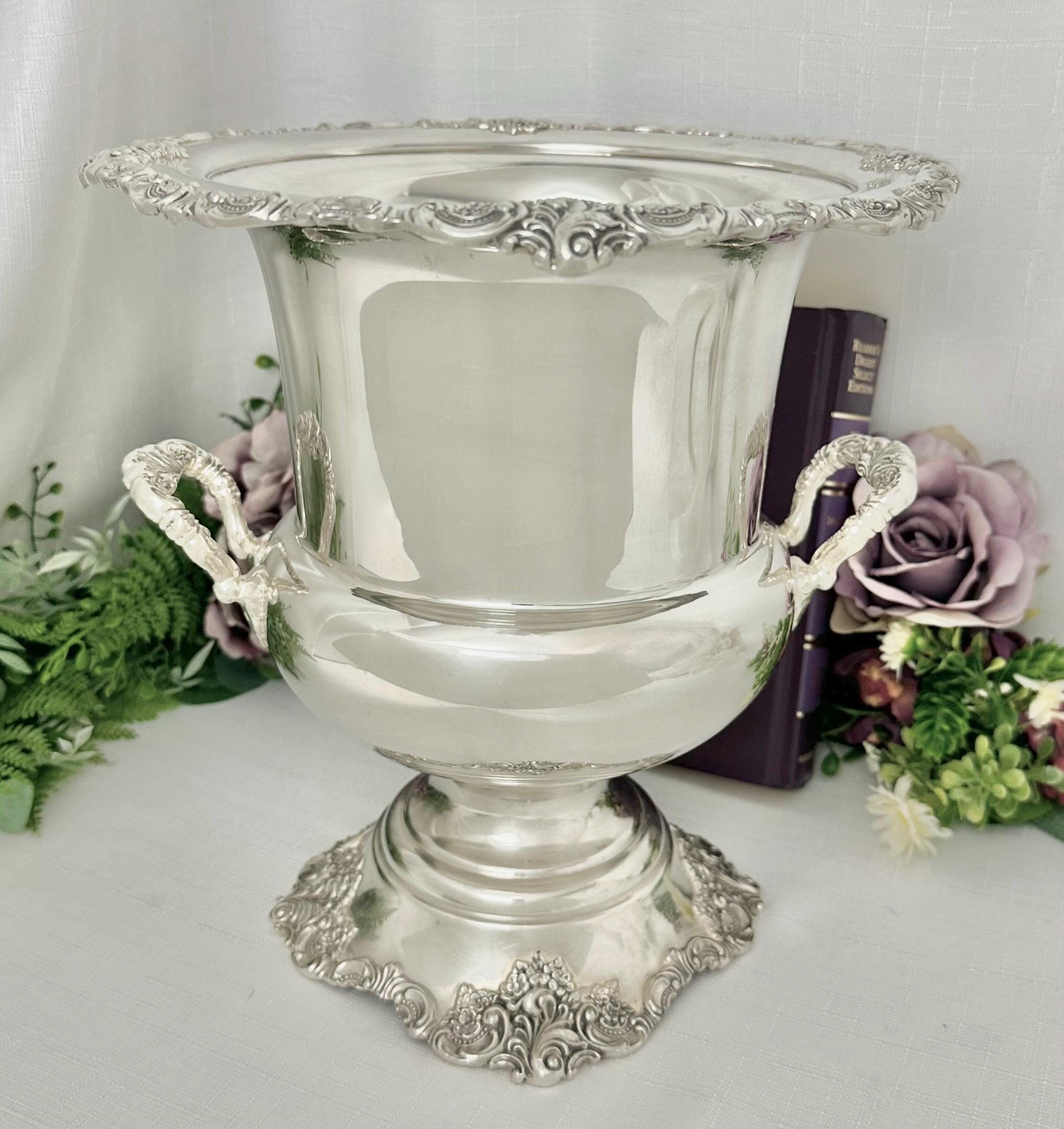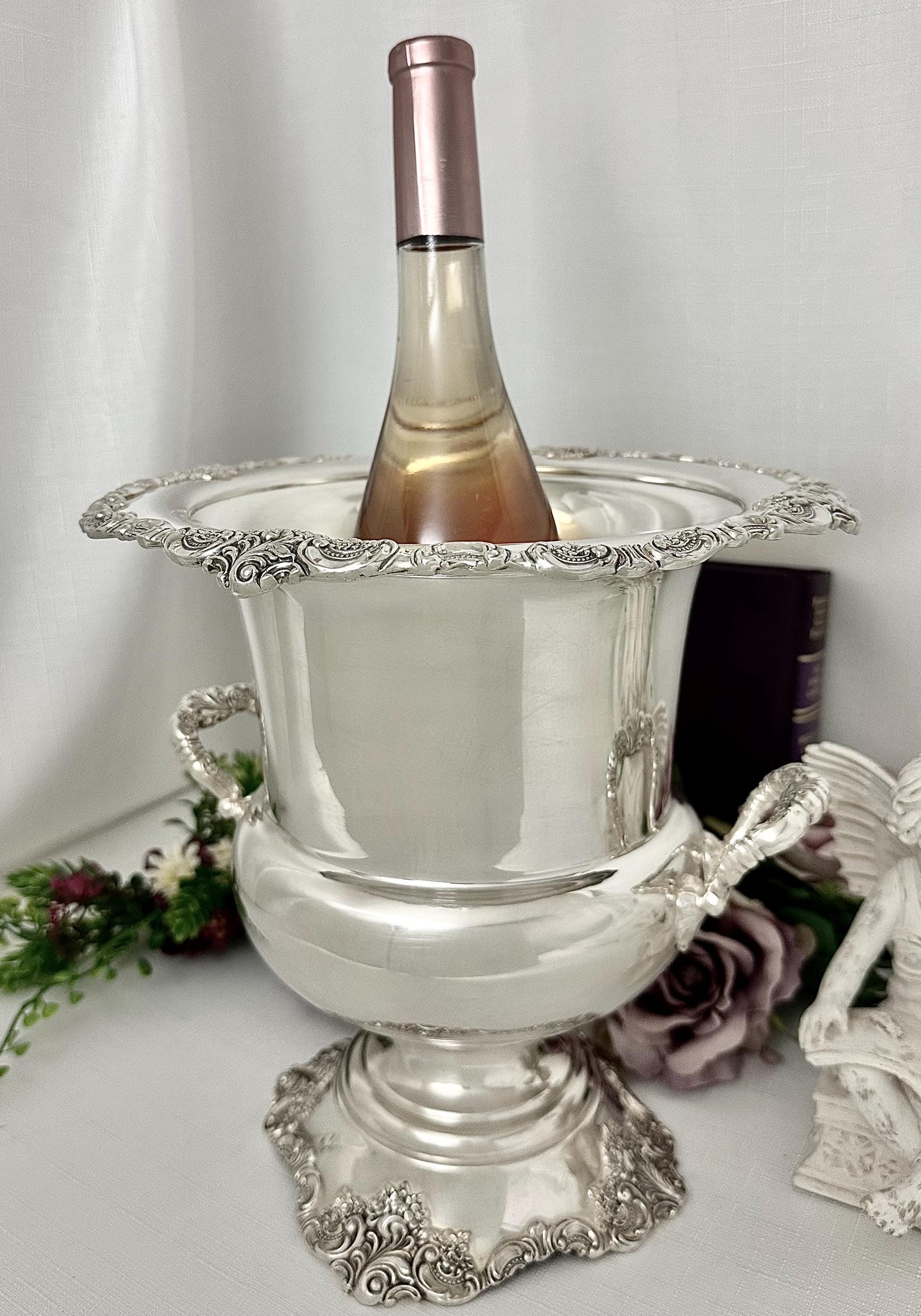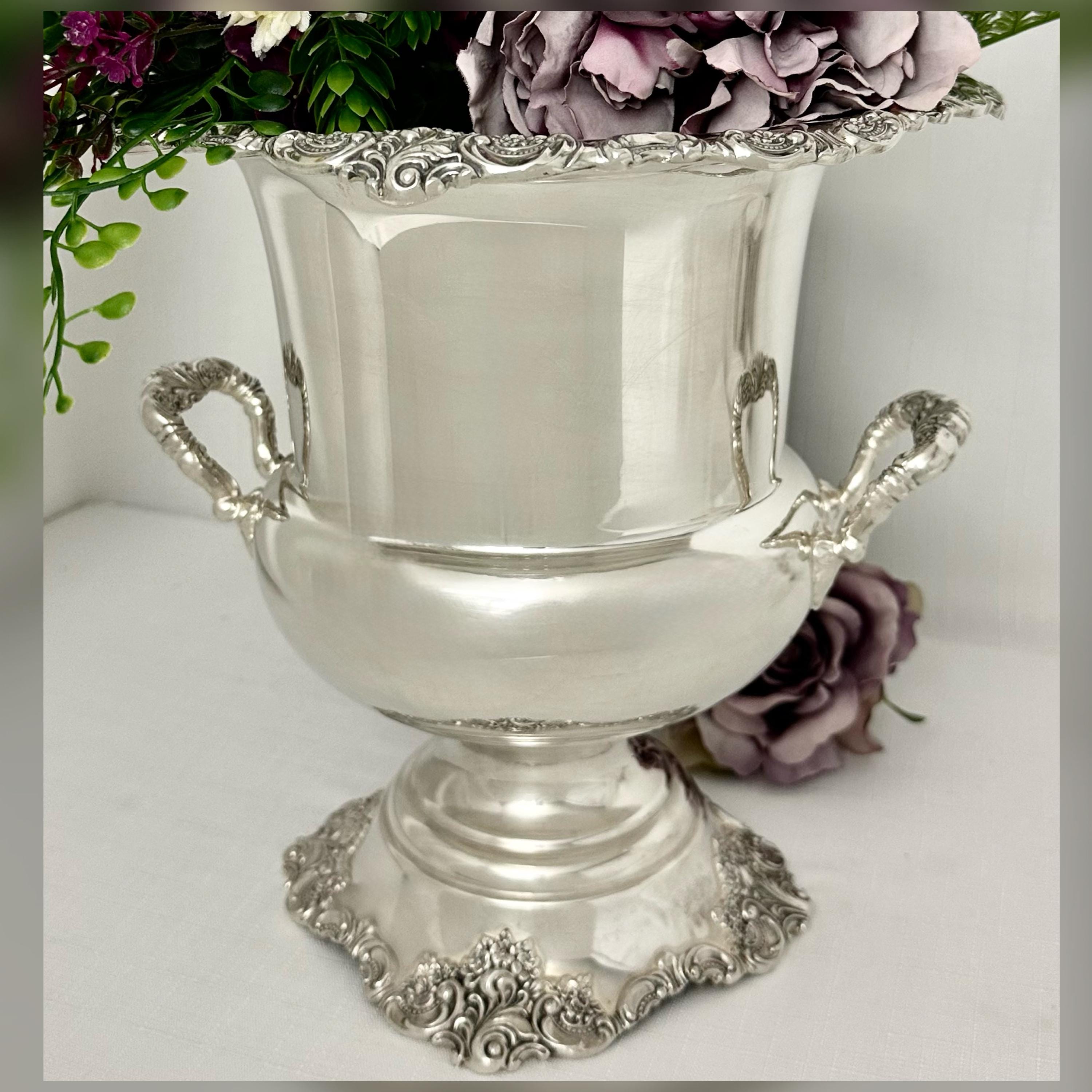 This is for a lovely Vintage Wallace Silver Plated Baroque Wine Cooler. This lovley piece is also perfect as an Ice Bucket, Champagne Bucket, or a Silver Plated urn to hold flowers. This is in the very popular Baroque pattern by Wallace Silver, item number 243, and marked on the bottom with makers name and pattern.