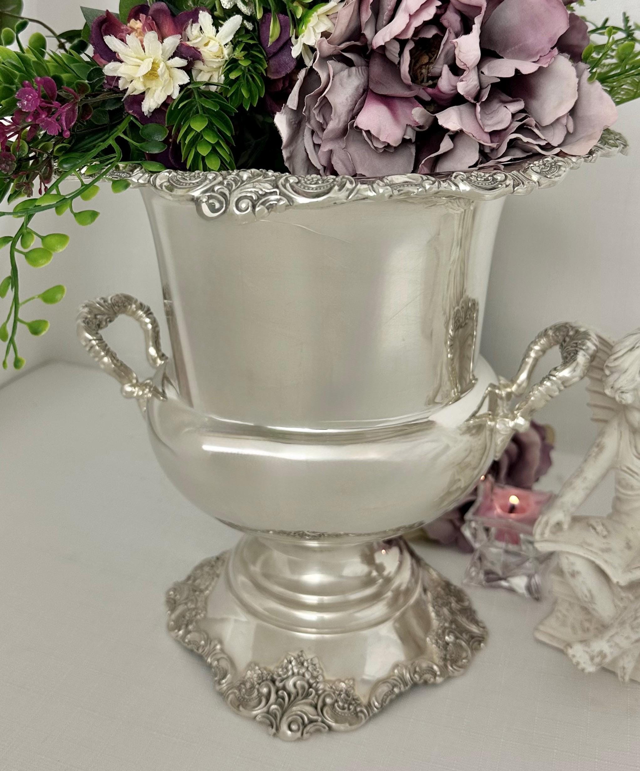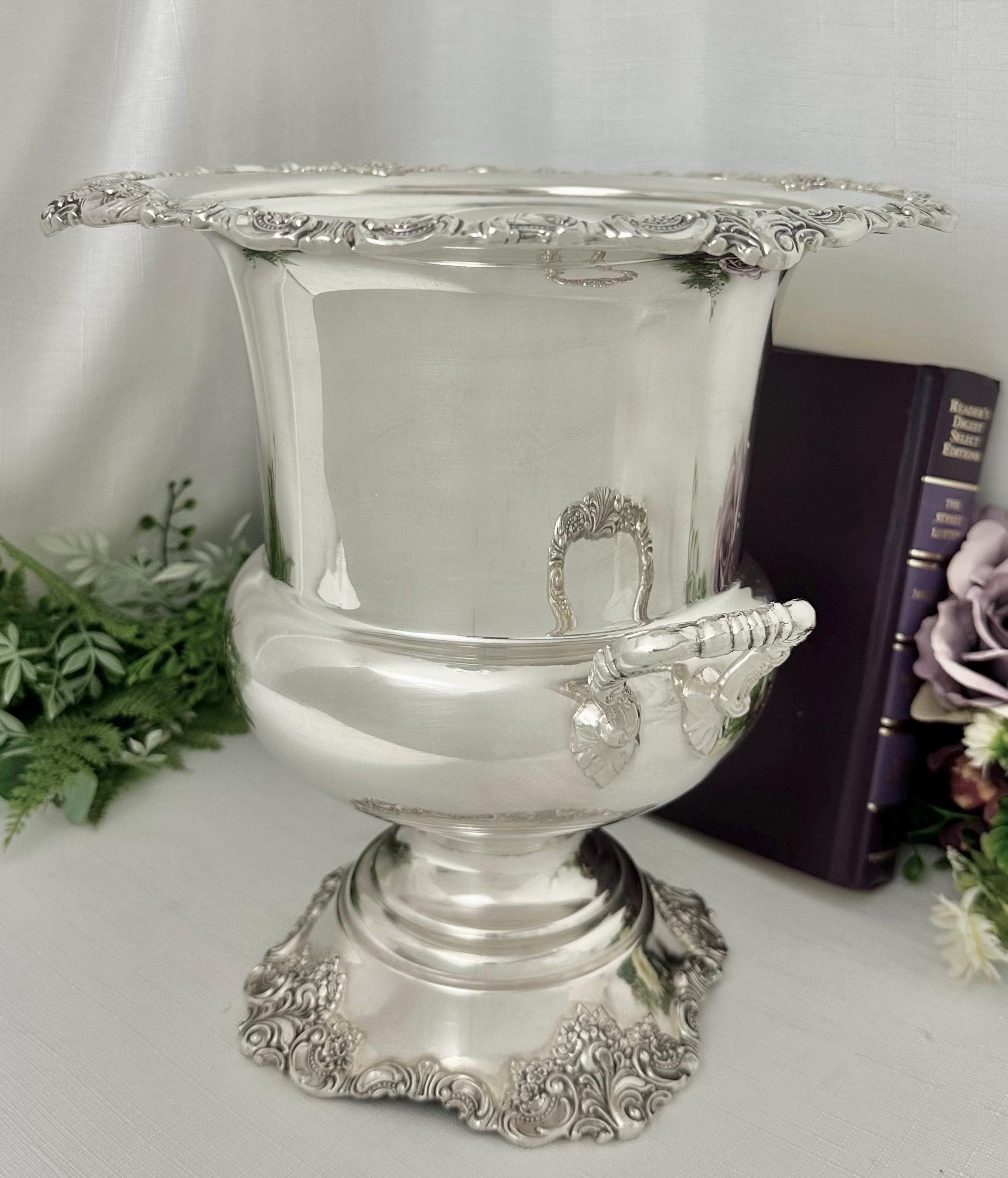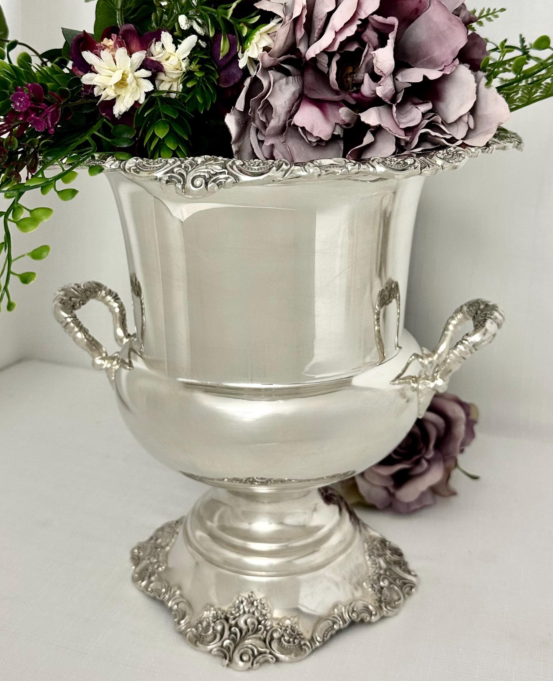 This is for a lovely Vintage Wallace Silver Plated Baroque Wine Cooler. This lovley piece is also perfect as an Ice Bucket, Champagne Bucket, or a Silver Plated urn to hold flowers. This is in the very popular Baroque pattern by Wallace Silver, item number 243, and marked on the bottom with makers name and pattern.