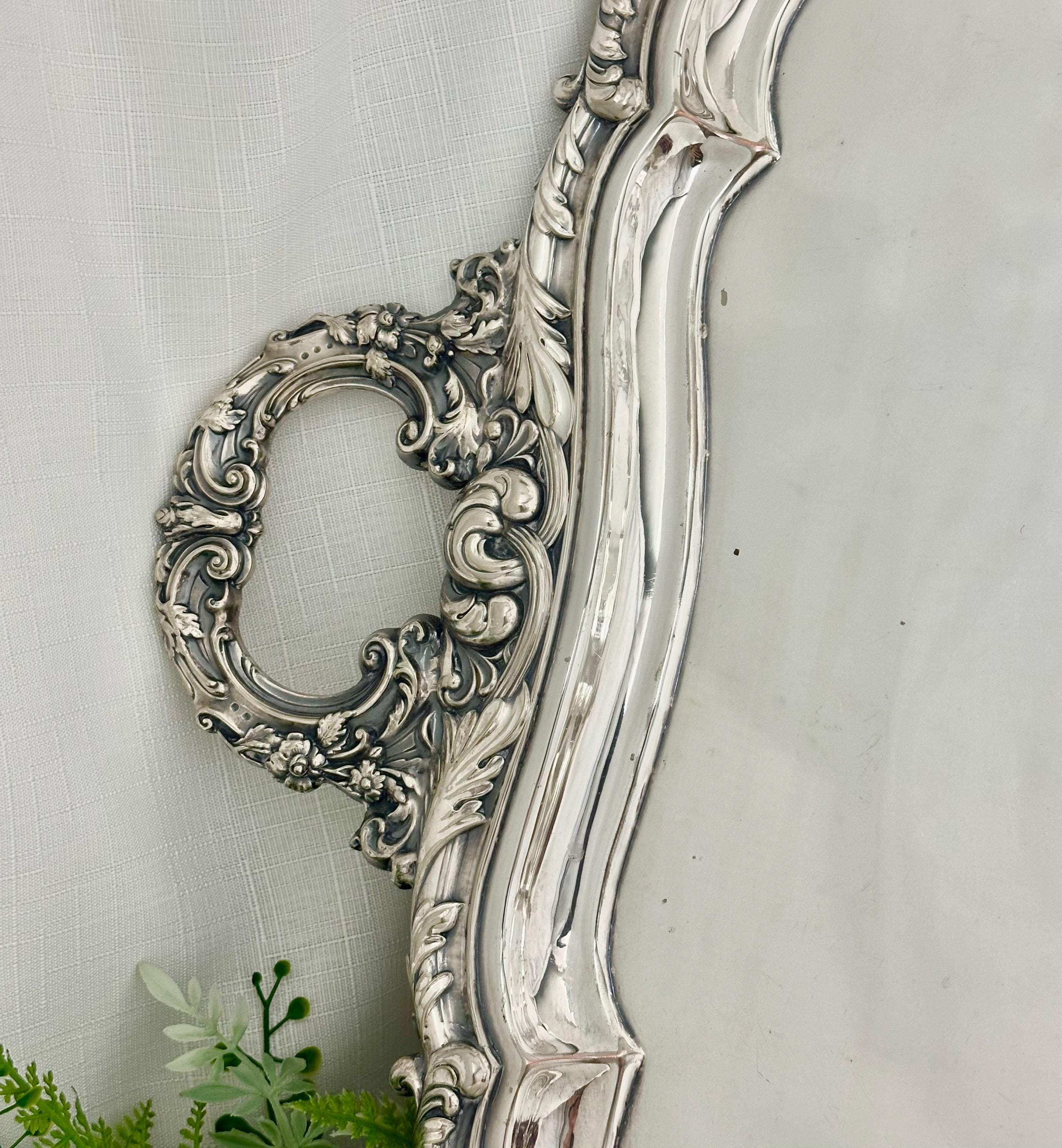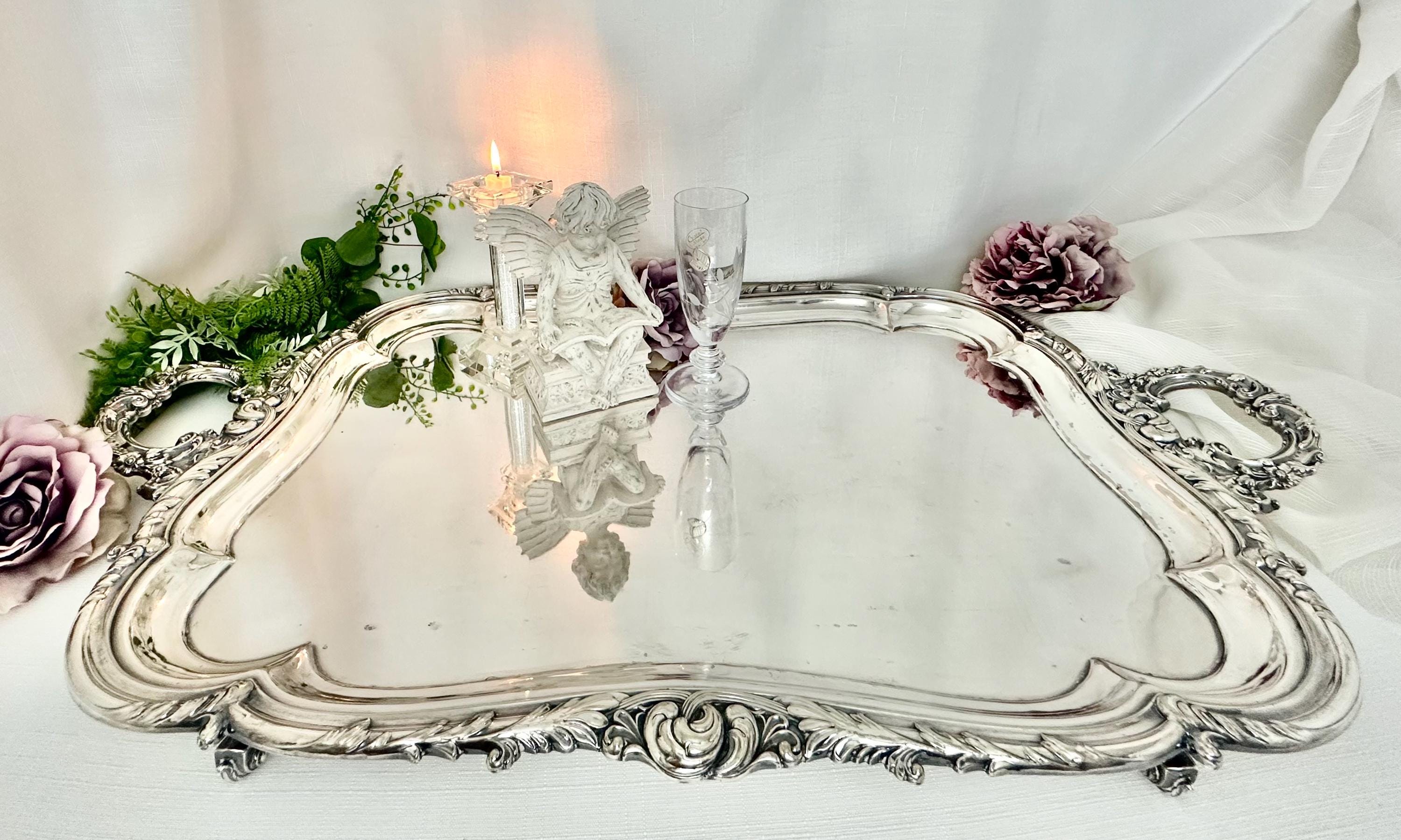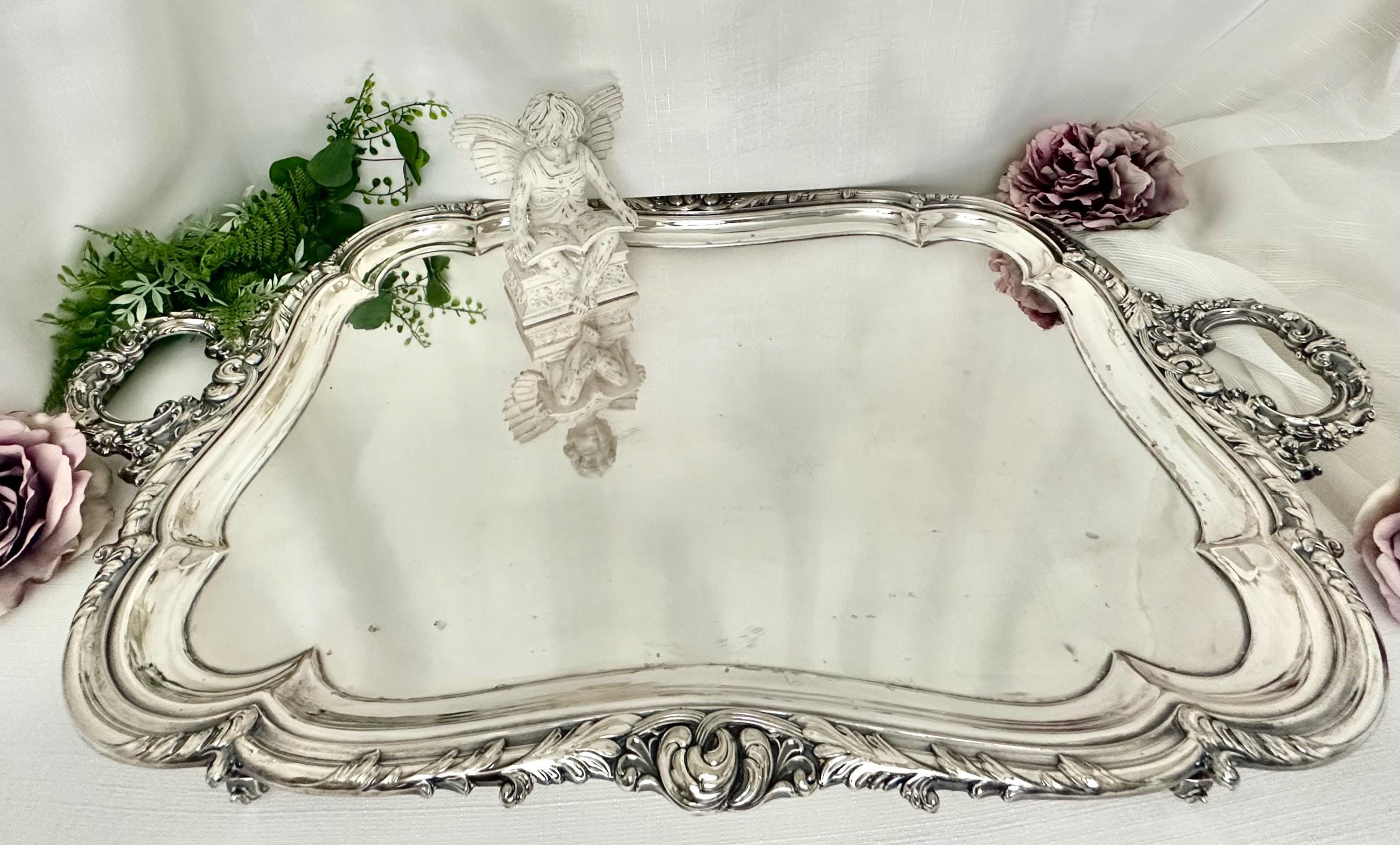 The intricate detailing and high-quality craftsmanship make this tray a luxurious and classic piece for any home, there are no makers marks that are discernible but is marked with various stamps that lend to the history of where produced, England.