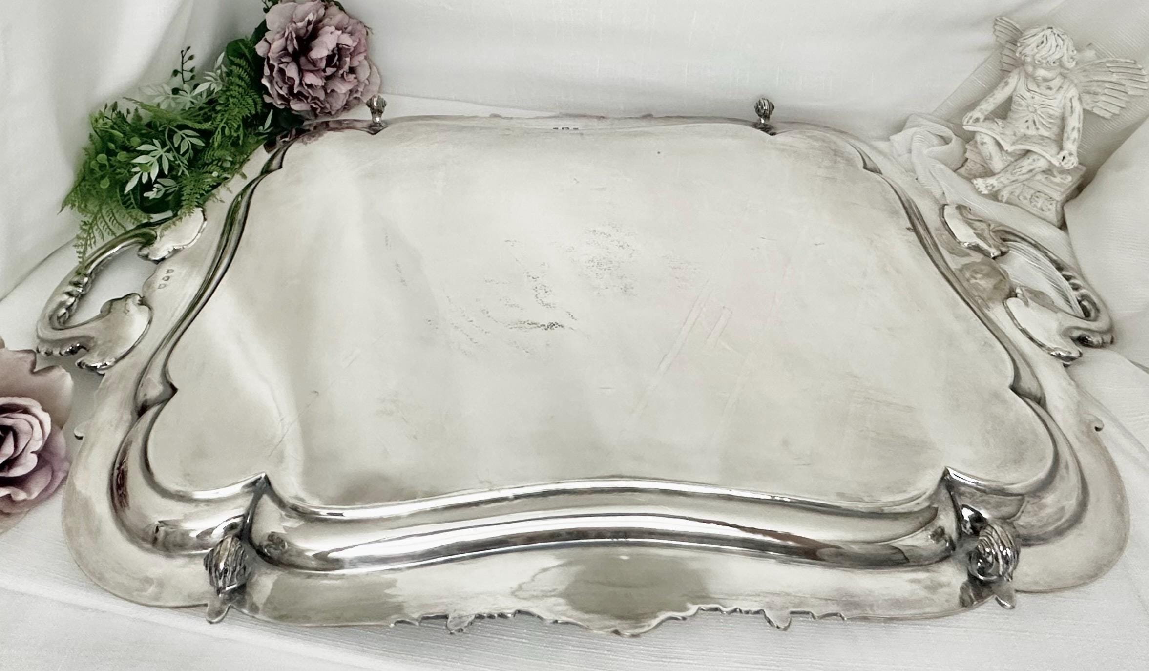 This is for an Antique Silver Plated tray that is a stunning example of a beautiful Victorian tea service tray. Crafted in England between the late 1890's to early 1900's. The footed butlers tray features beautiful cast ball floral feet and a high relief swirl design on the handles and the entire rim.