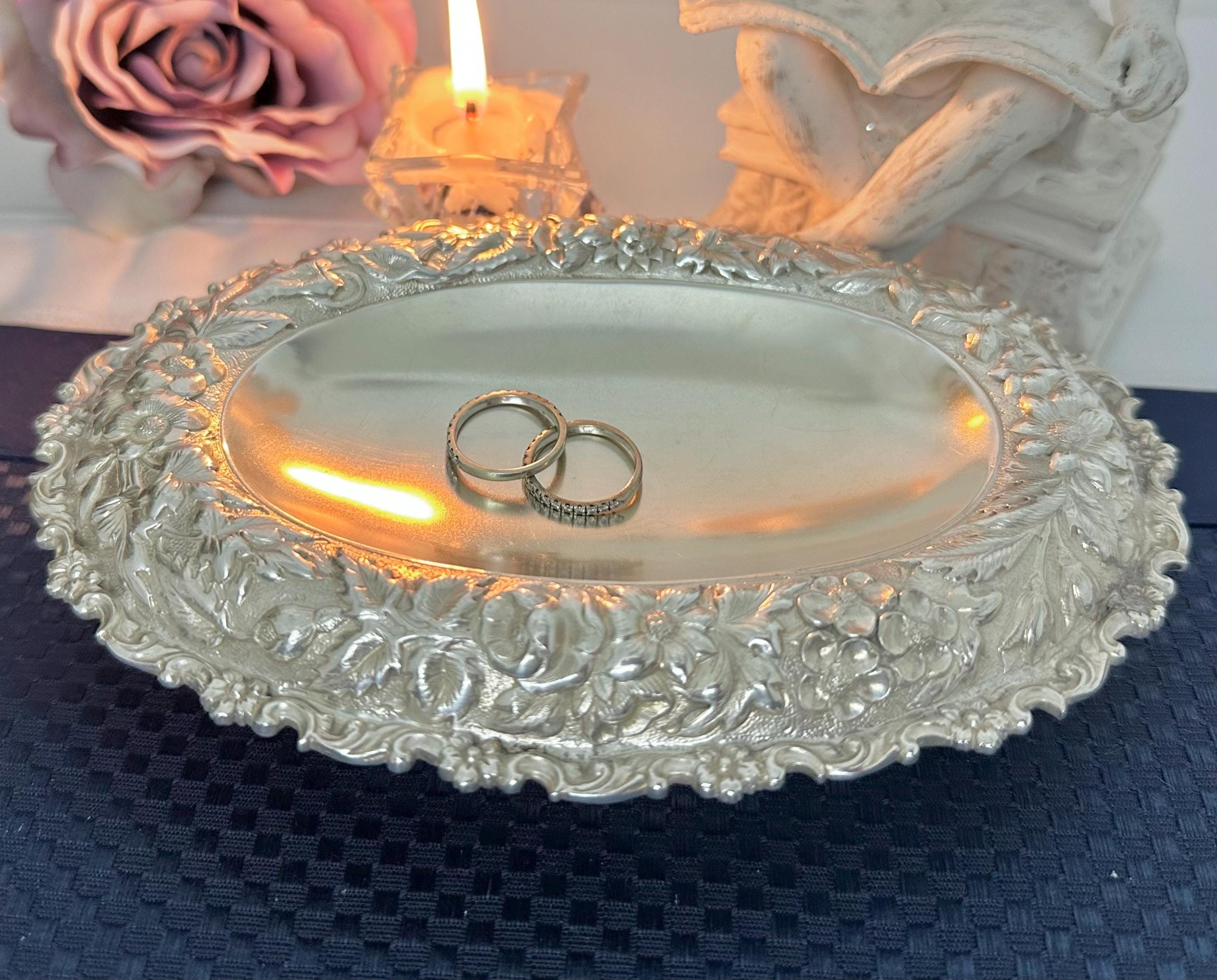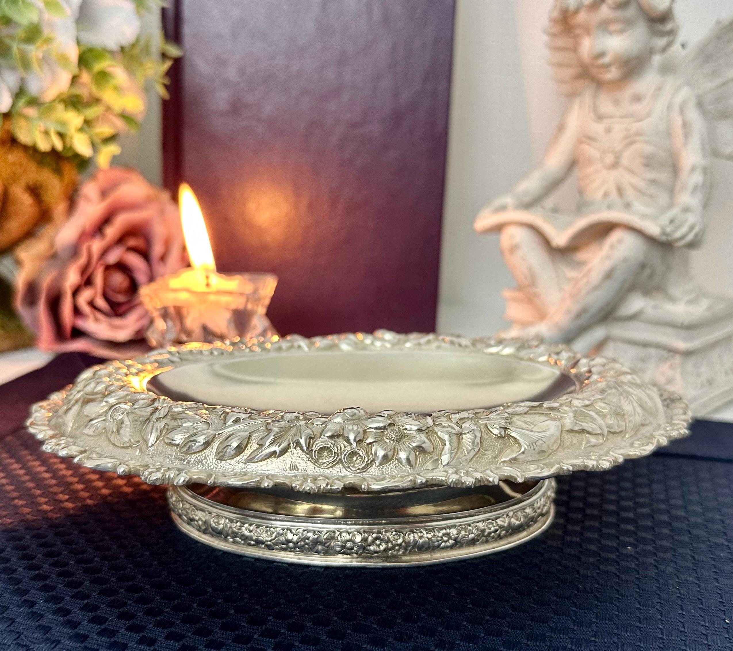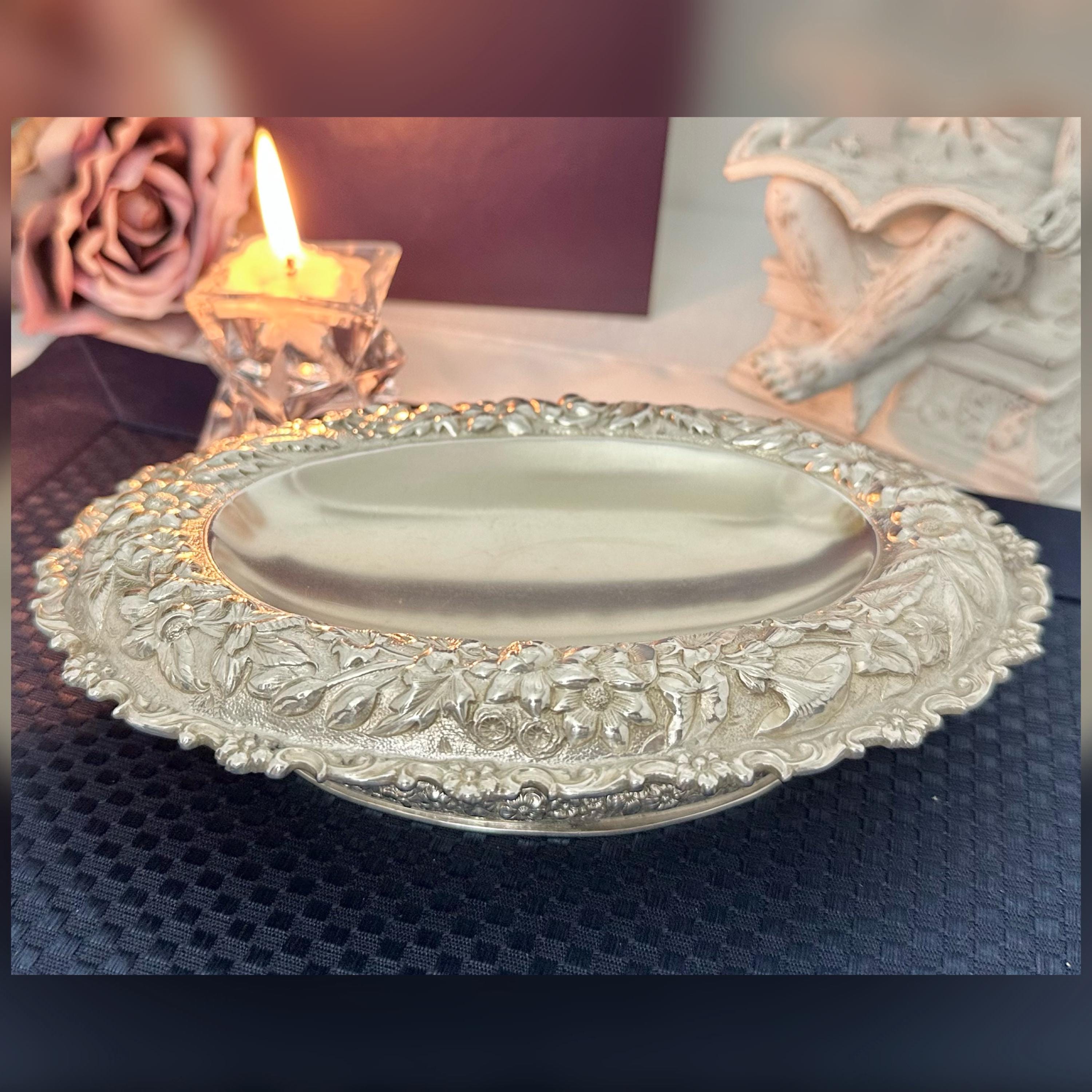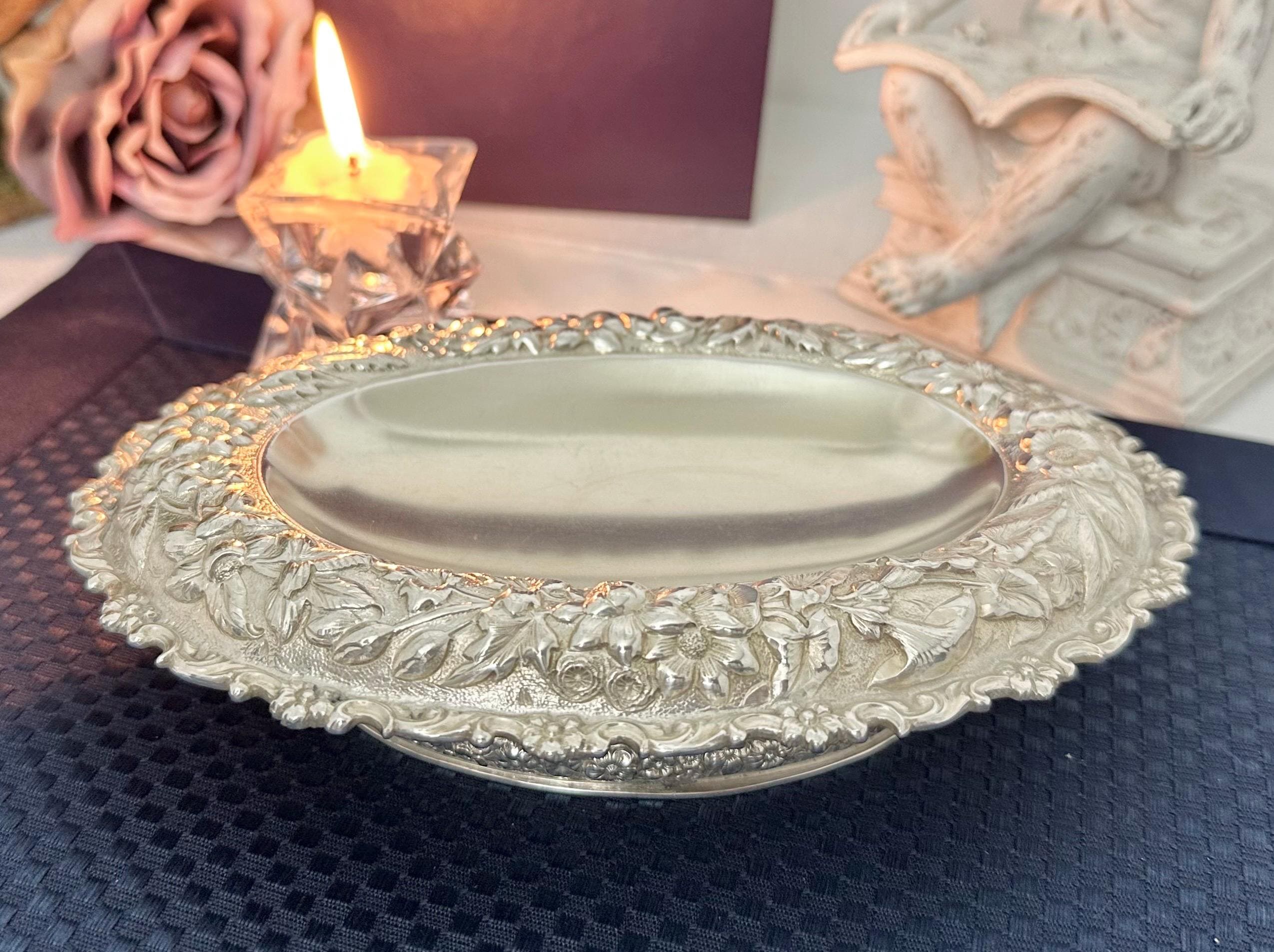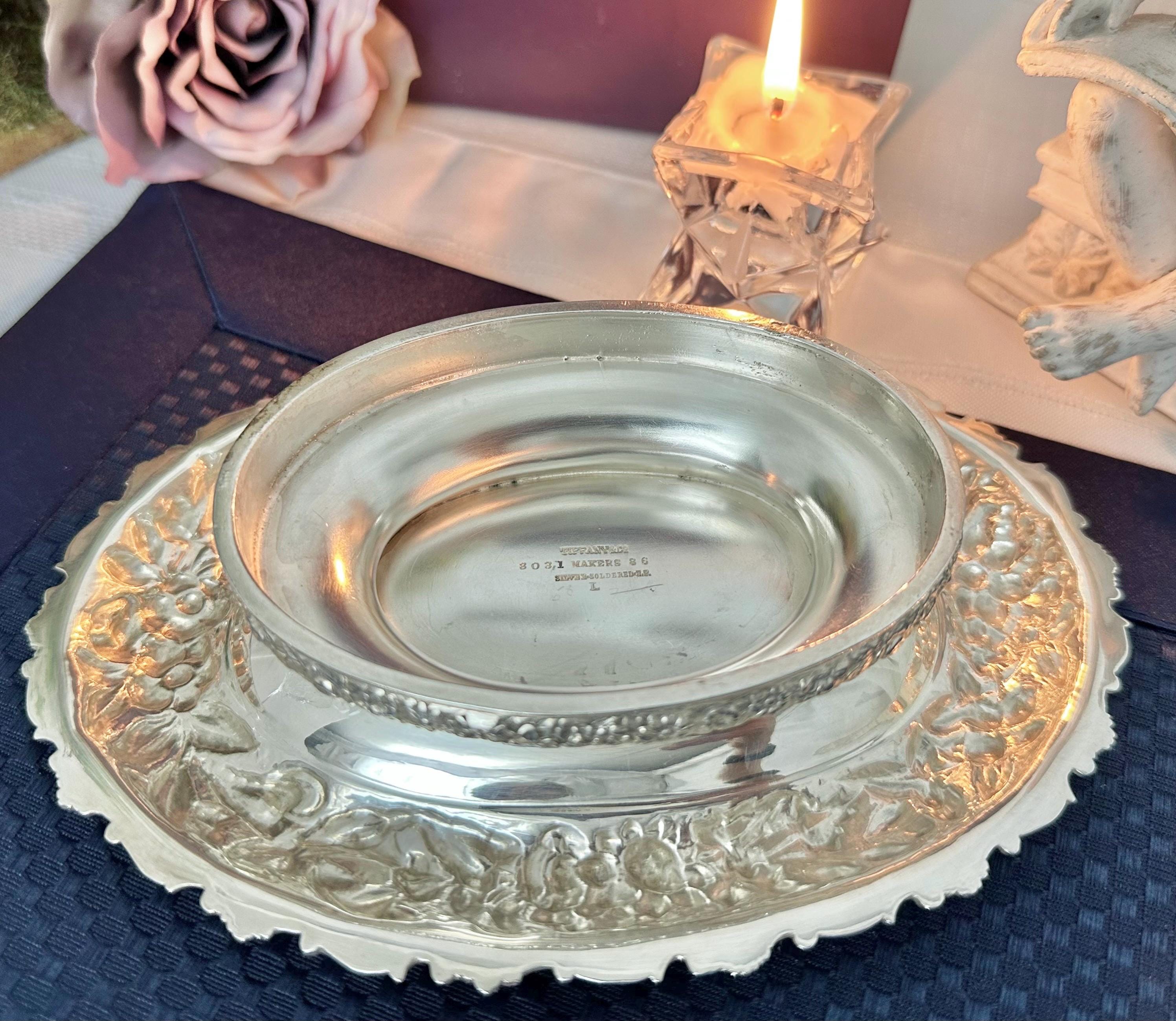 This is for a beautiful heavy Tiffany & Co Silver Soldered oval bowl featuring an ornate repousse floral design. This is a heavy, high quality silverpate piece typical of early Tiffany production, ideal for display or use. This Victorian floral style dish was crafted by the renowned jewelry maker between 1890-1915 in the United States. This is perfect for holding candy, jewelry to coins and to use and display for years to come!