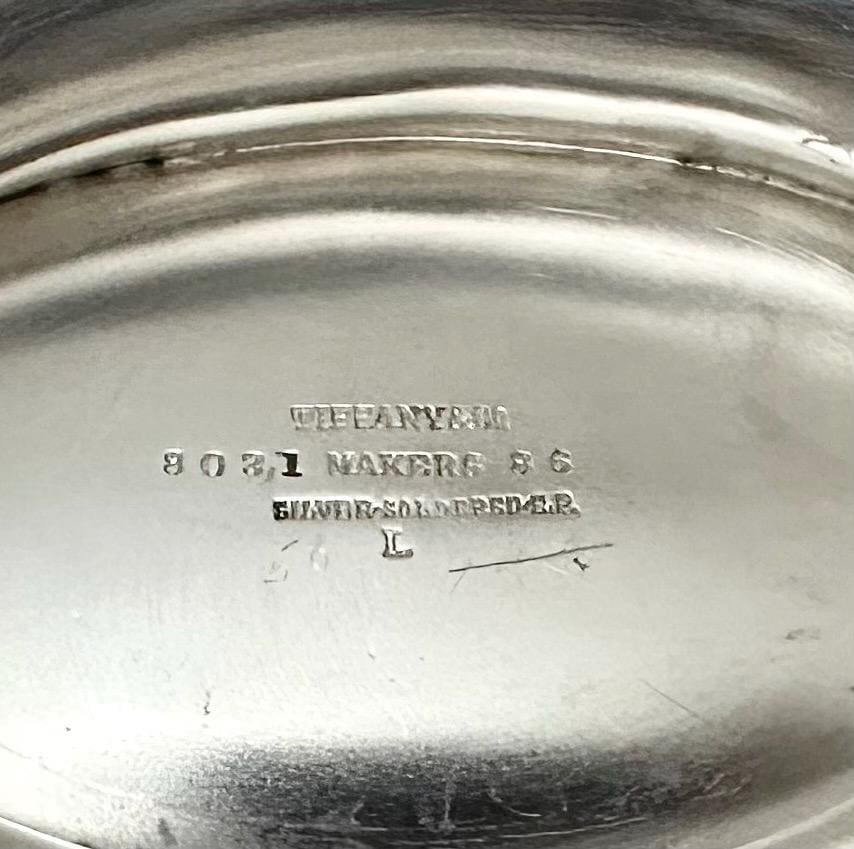 With a depth of 5 inches and a width of 7.25 inches, this bowl is a beautiful and elegant addition to any collection of antique silverware. This wonderful dish is in excellent condition with wonderful detail on the rim and has a decorated foot. The piece is marked on the bottom with Tiffany & Co, 8031 Makers 36, Silver-Soldered E.F. and L.