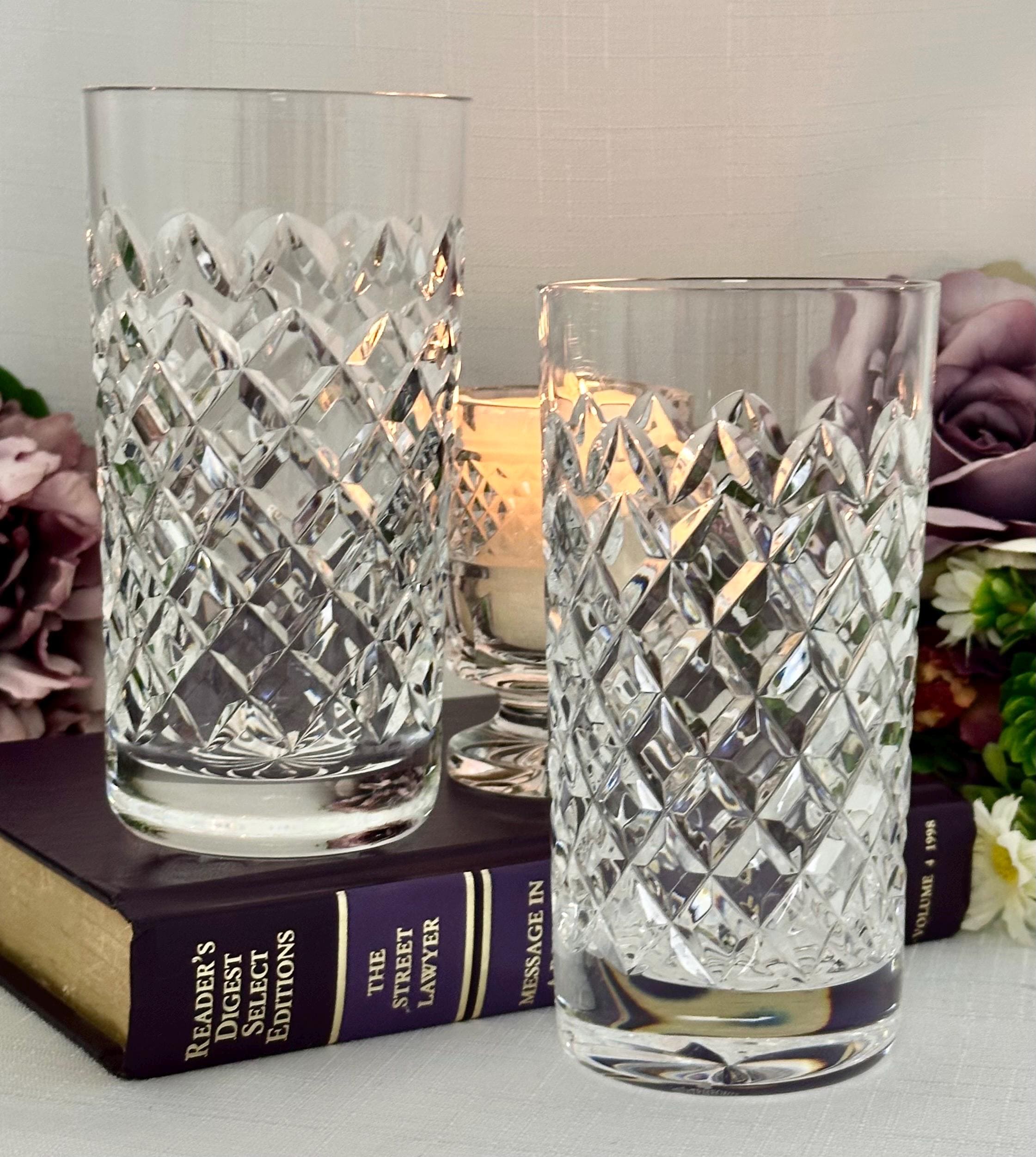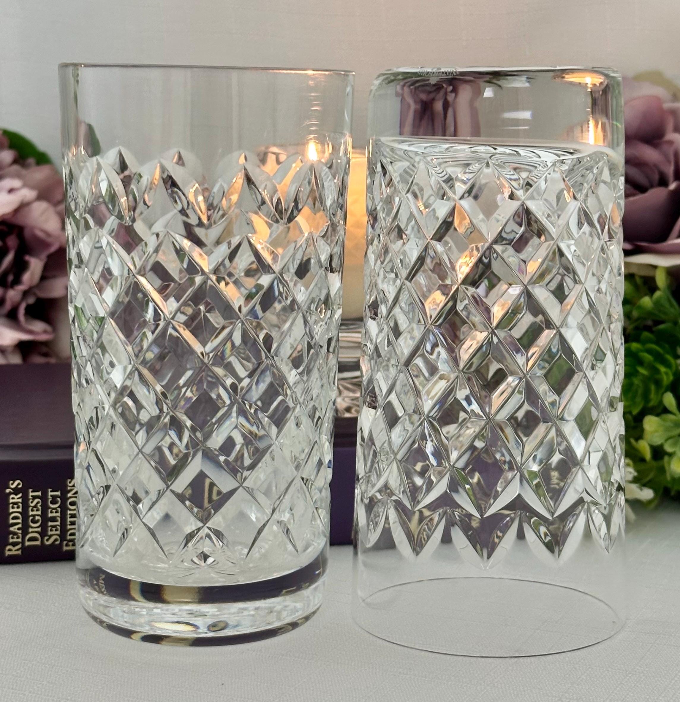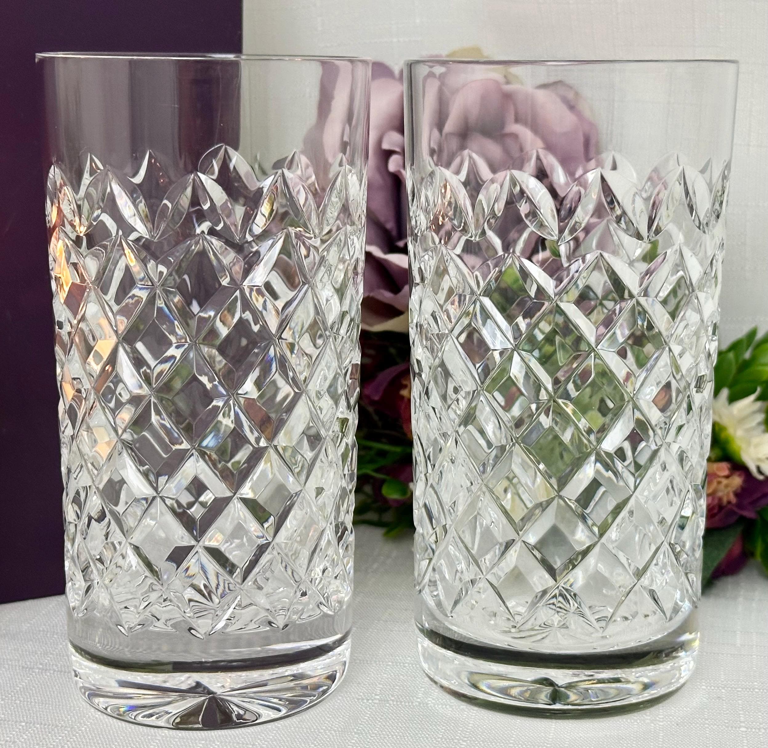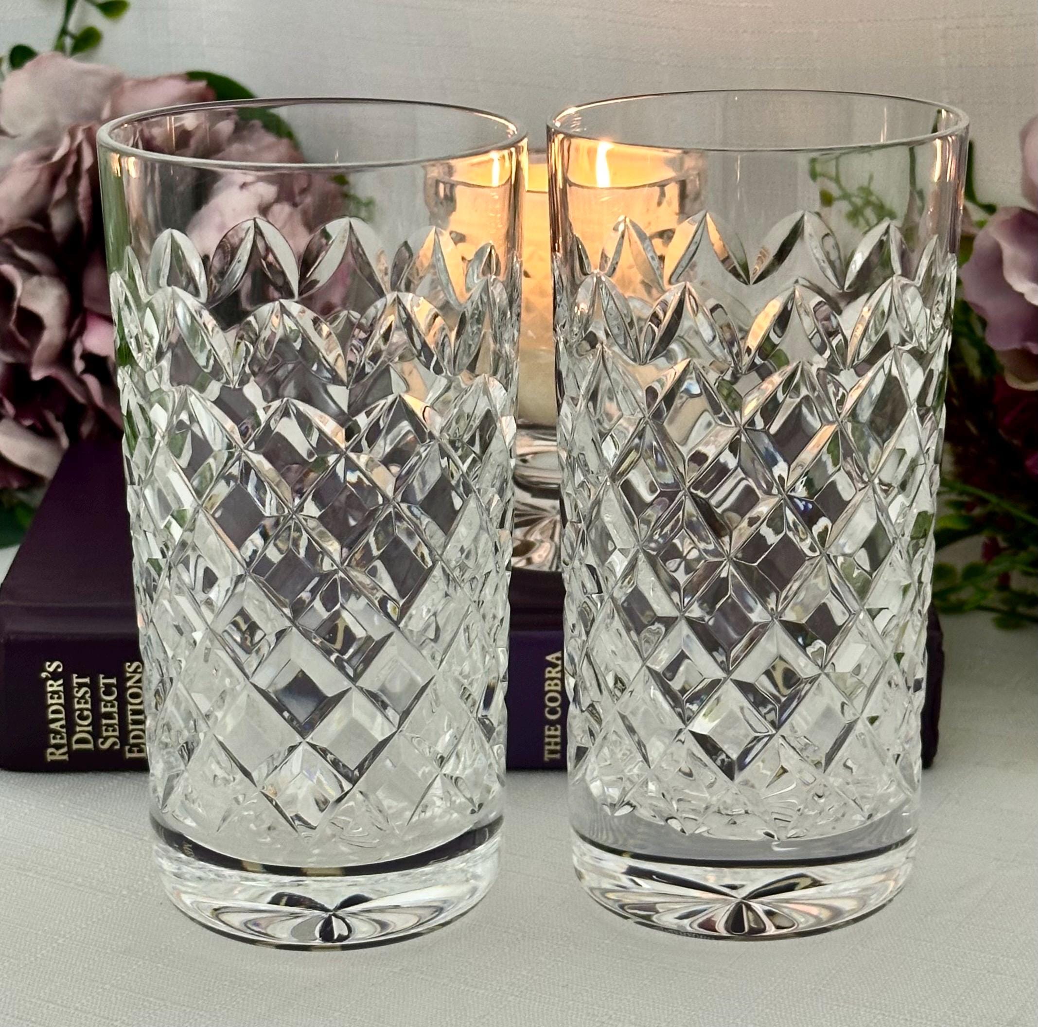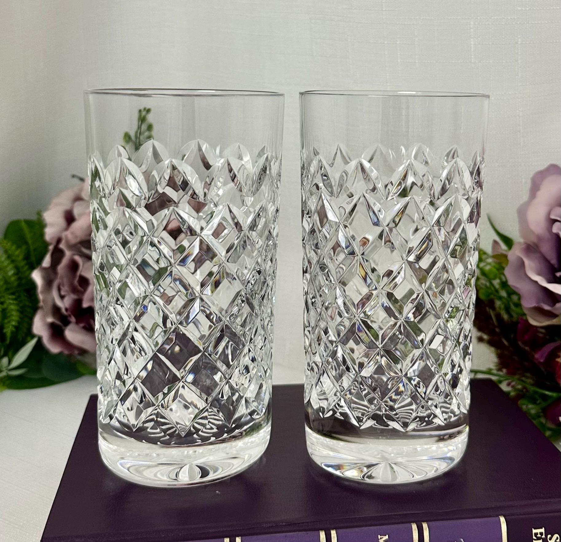 This is for a pair of vintage Waterford Powerscourt Crystal Highball Glasses. This set of two vintage drinking glasses featuring a classic cross cut design with arches. Made of high-quality glass and crystal, these round tumblers are perfect for all occasions and hold 12 oz of cold beverages.