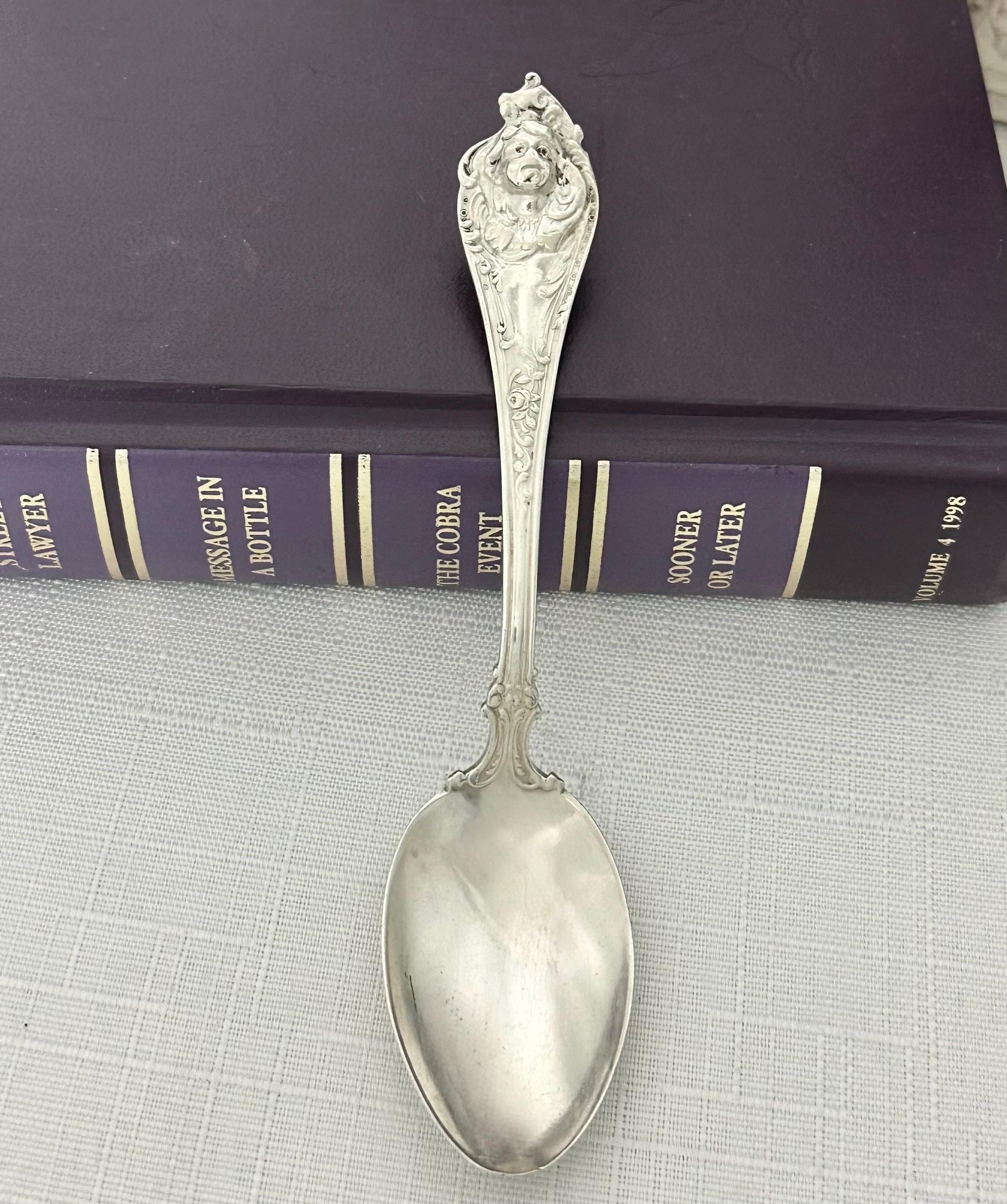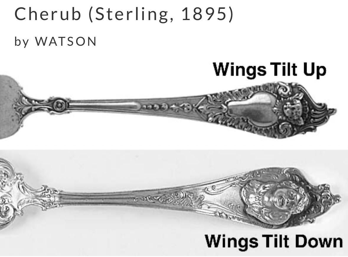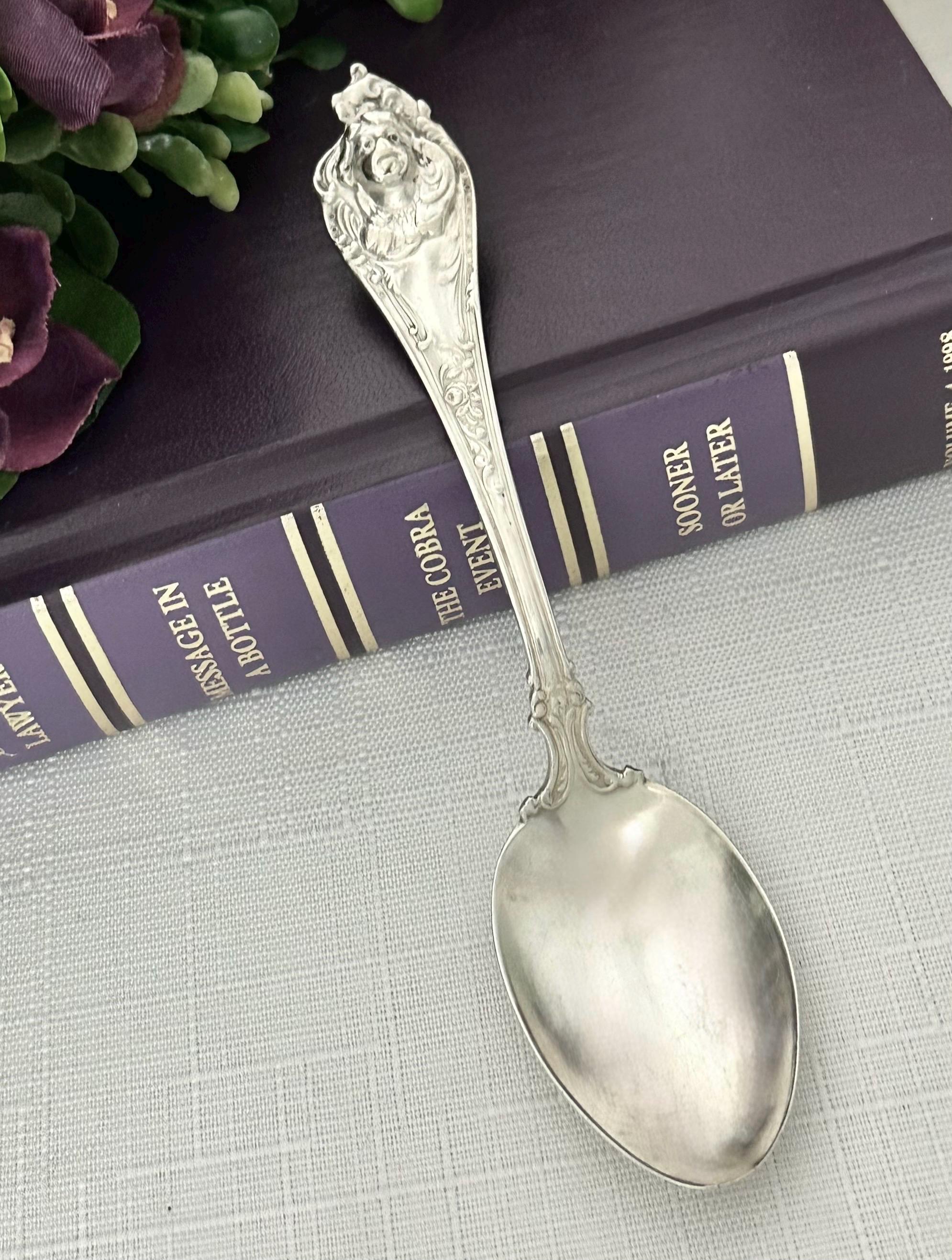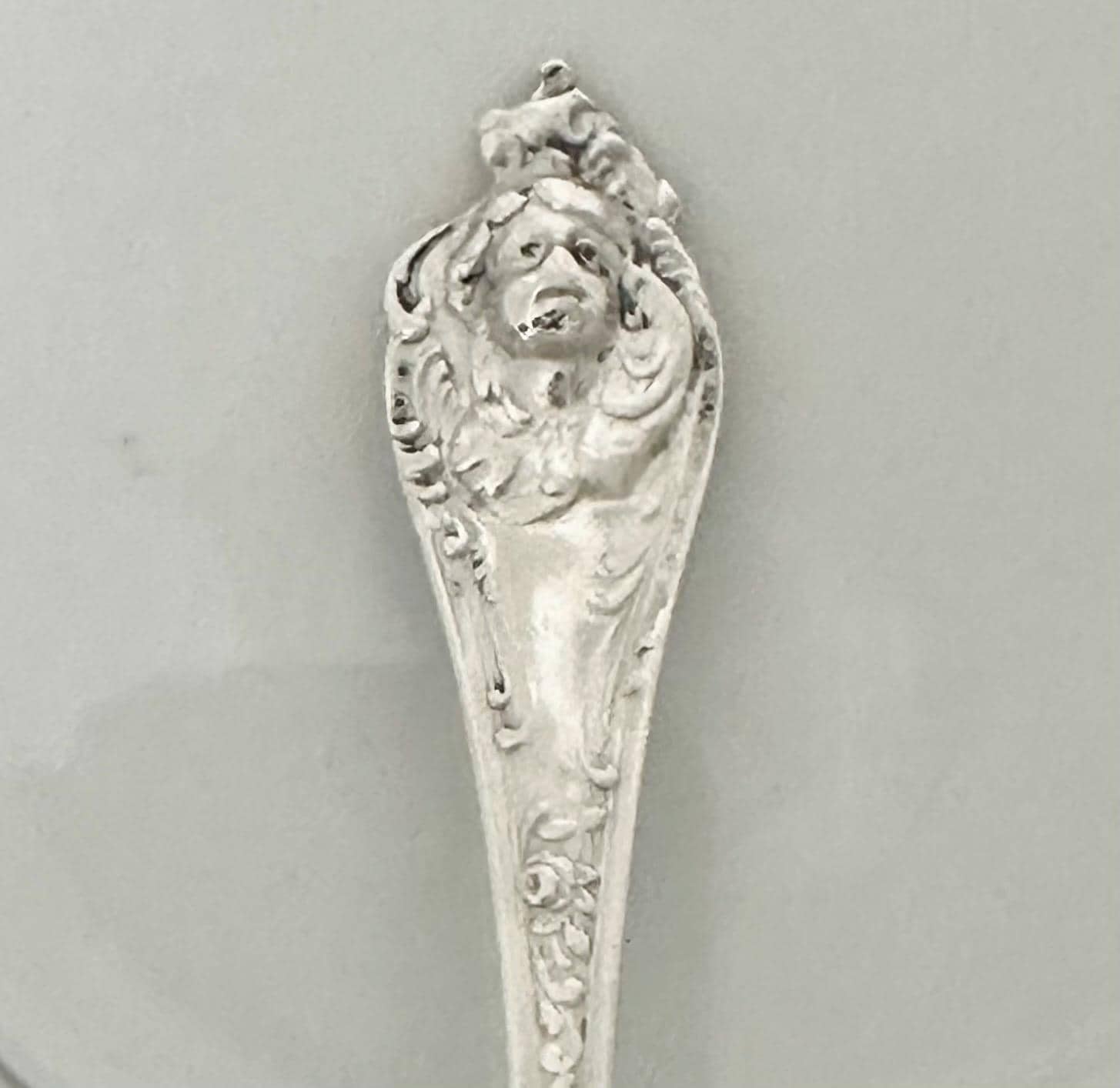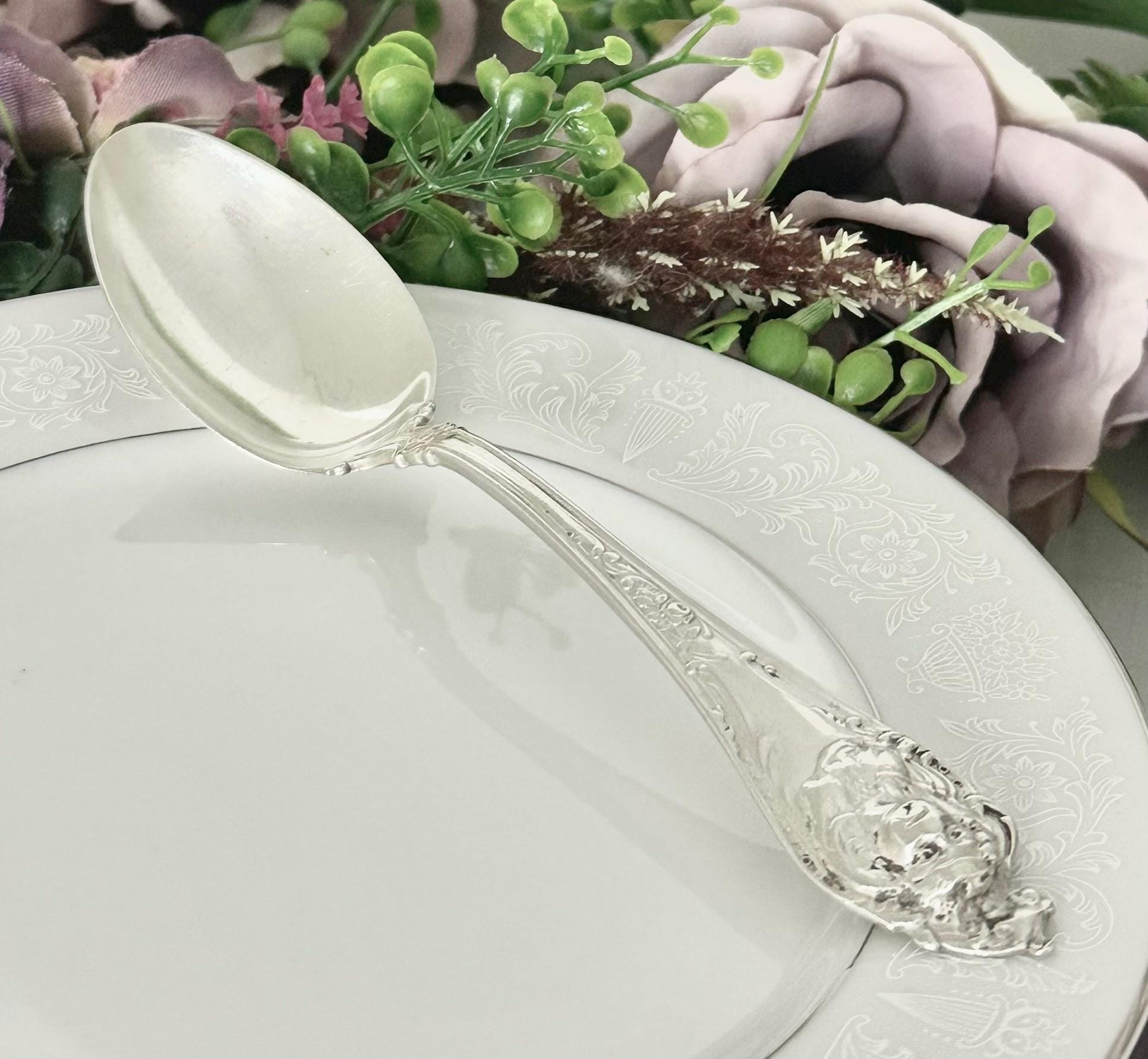The product is a rare beautiful Antique Watson Sterling Silver spoon from 1895 with a Cherub pattern on its handle. It features intricate Cherub (wings coming down) on the handle, adding a unique and artistic touch to the Art Nouveau style of silverware.