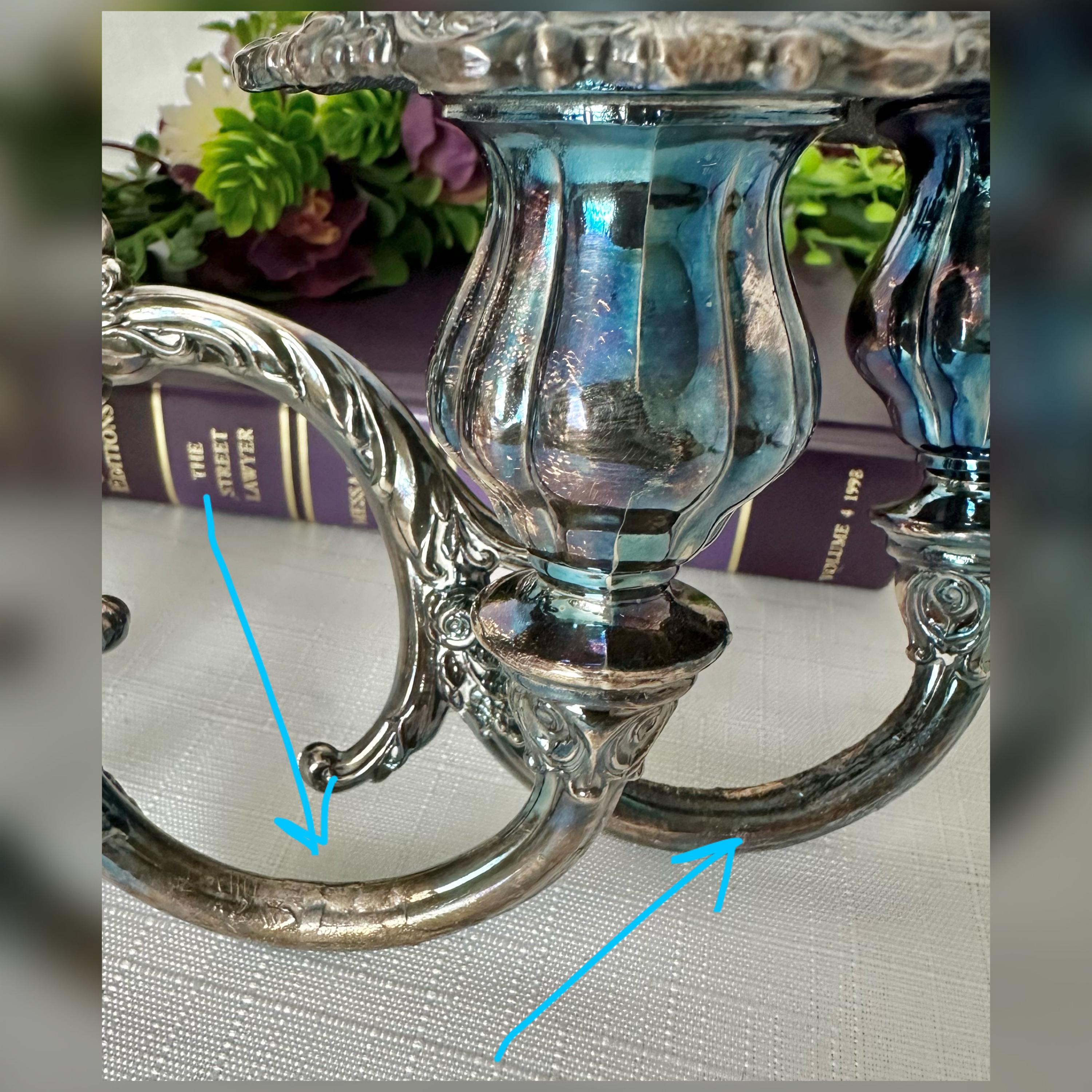 ***These are tarnished and I would suggest to NOT polish them as the silver plate looks to have issues on two of the arms where it is wrinkled and would not polish up correctly to have an even finish. This is at the bend of two of the four arms noted in the pictures.
