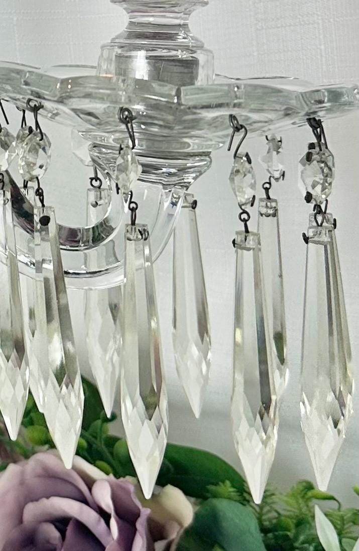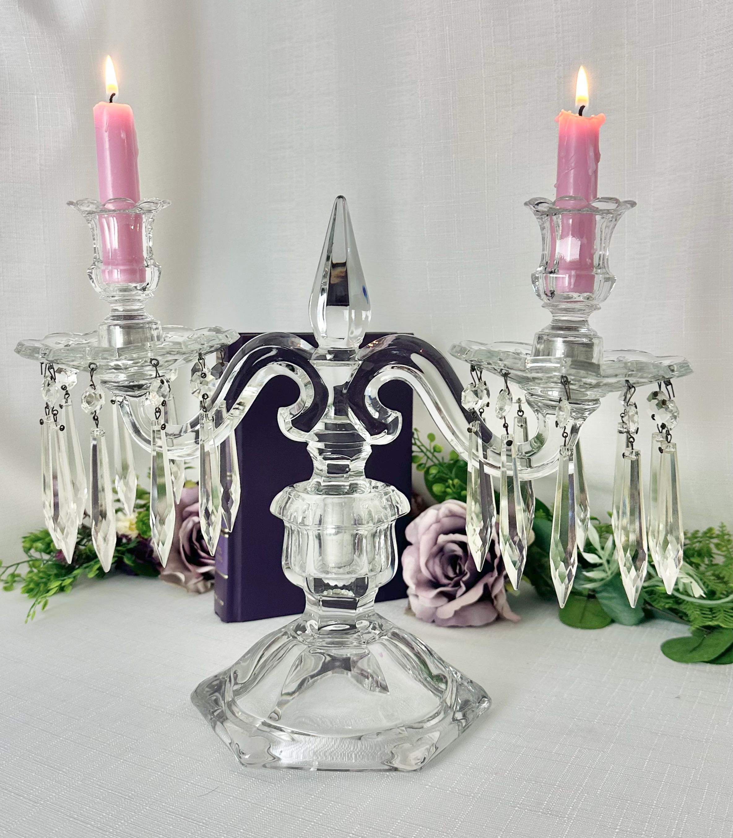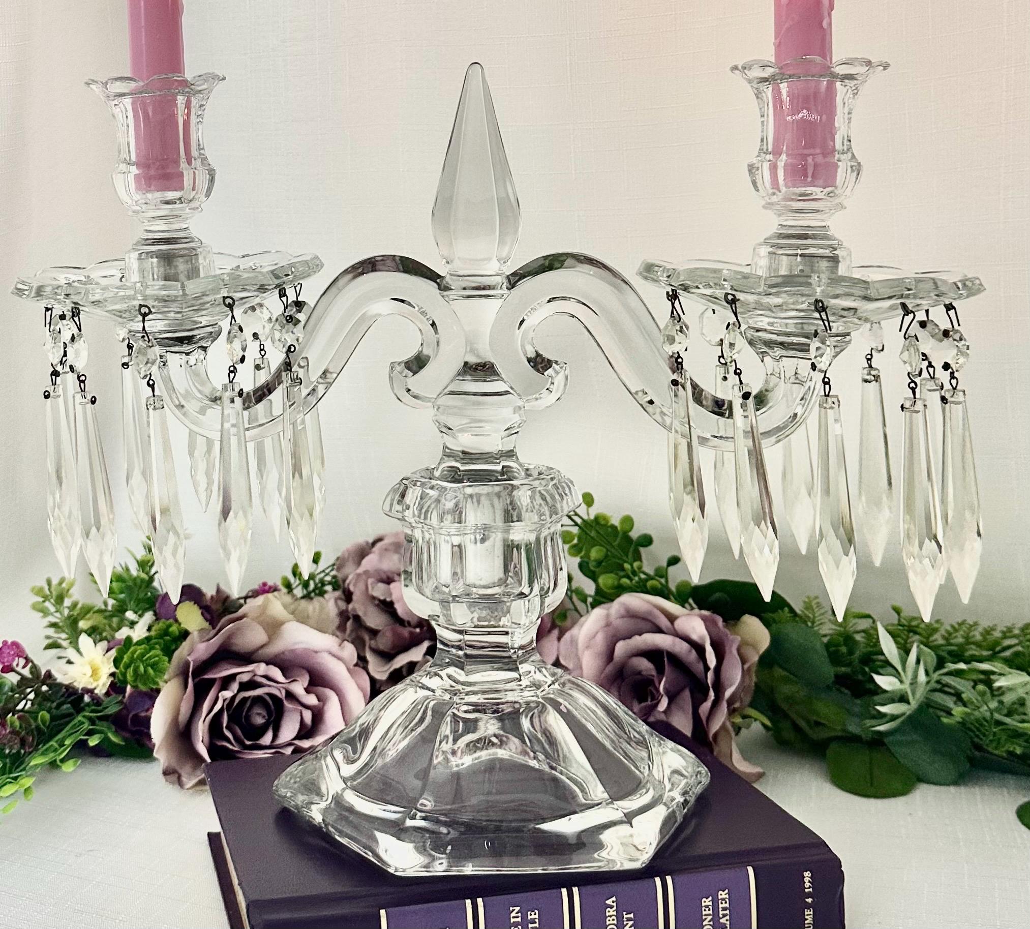 Measuring 10.75 inches in height and 13.5 inches in width, this vintage piece from the Heisey brand adds a touch of sophistication to any space with its intricate design and timeless appeal. Made for formal occasions, this candelabra is a beautiful addition to any collection of decorative collectibles. There are no chips or cracks and the crystals also are in lovely condition and appear original due to the way the wire is constructed for holding them together.