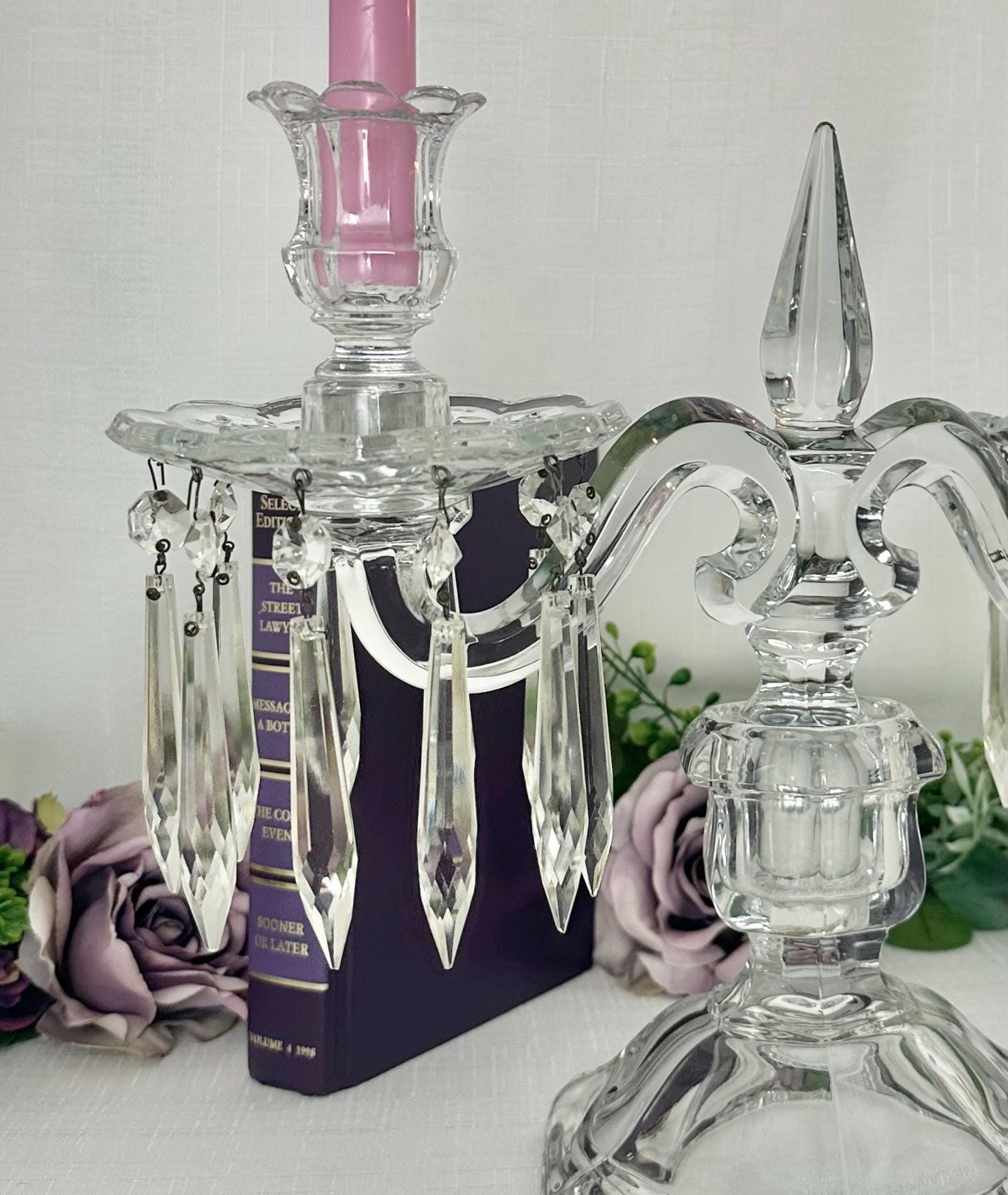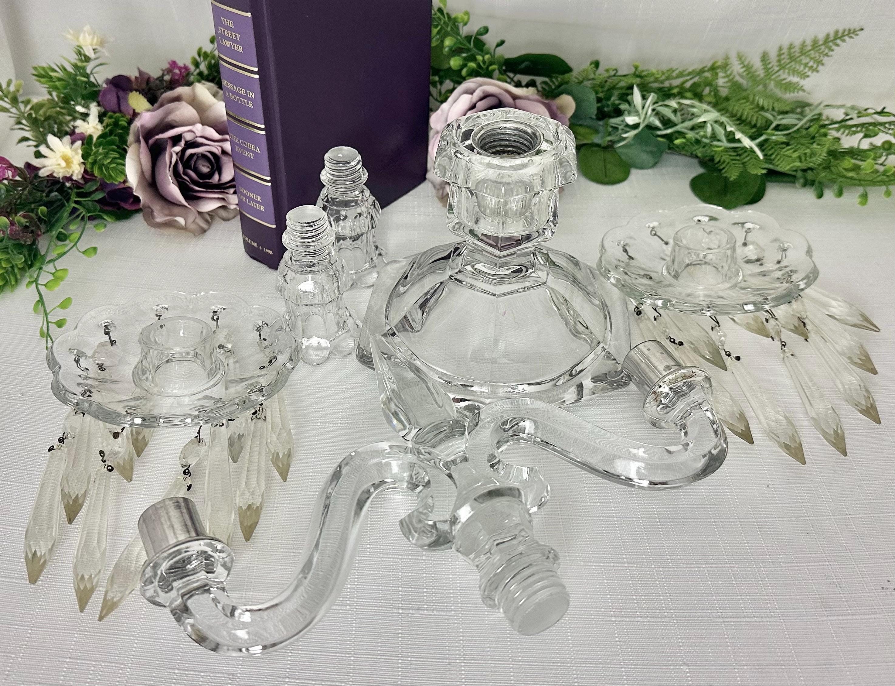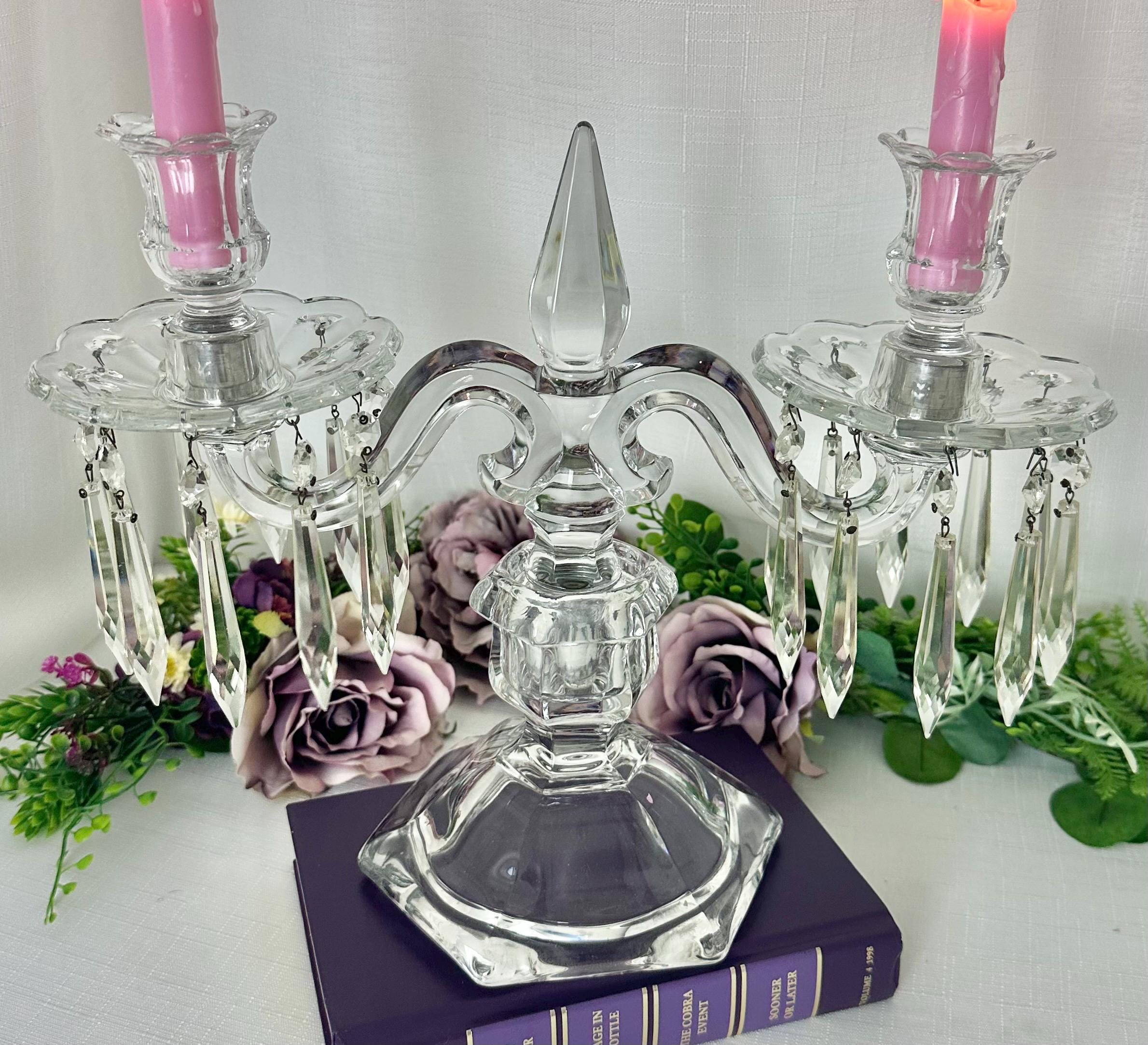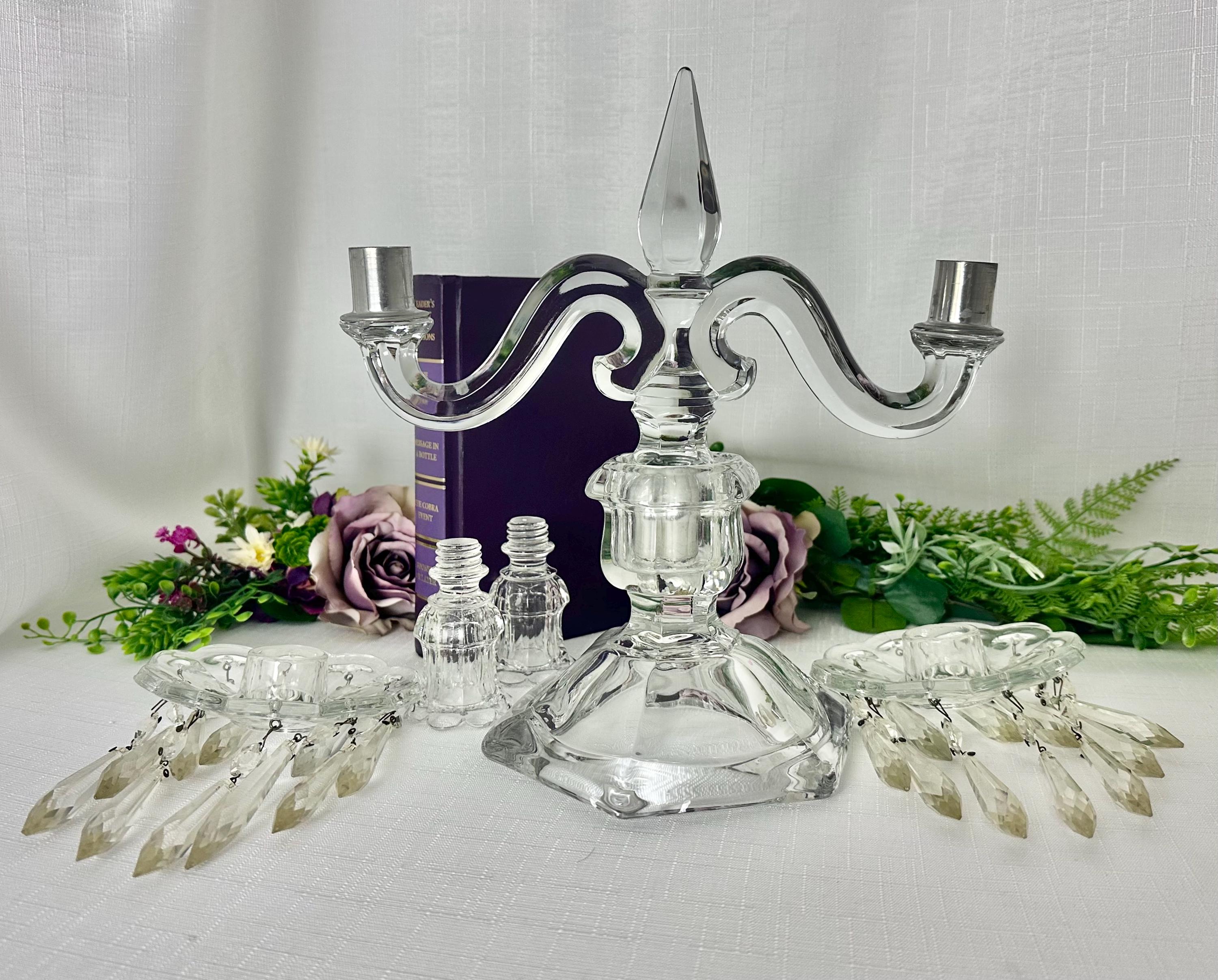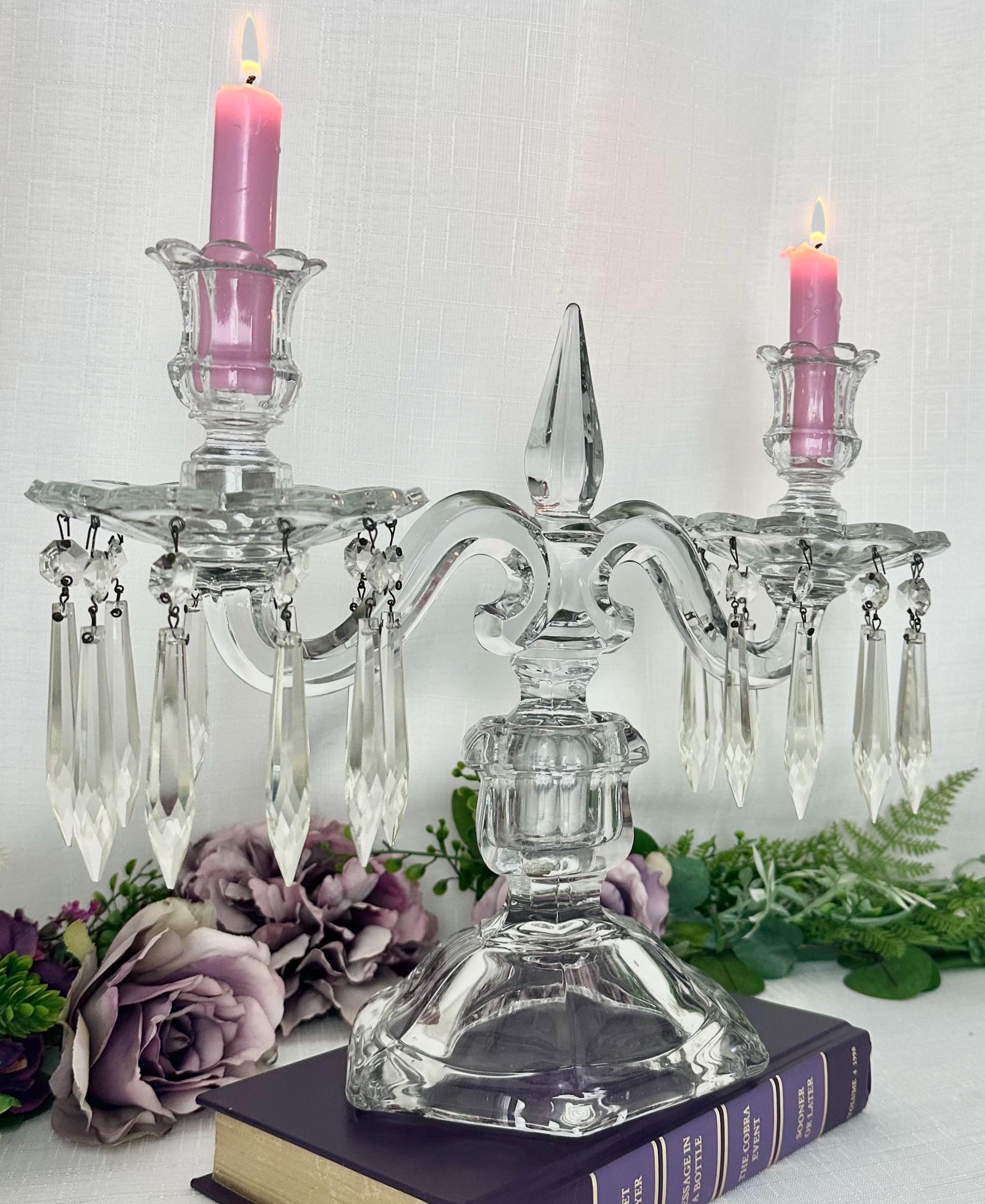 This is for 1 vintage Old Williamsburg by Heisey Candelabra. This Vintage piece looks to have the original Hanging Crystals and is a medium-sized glass candle holder suitable for all occasions. With a Colonial style and gloss finish, this elegant candelabra is perfect for holding dinner taper candles at a party or in a decorative display.