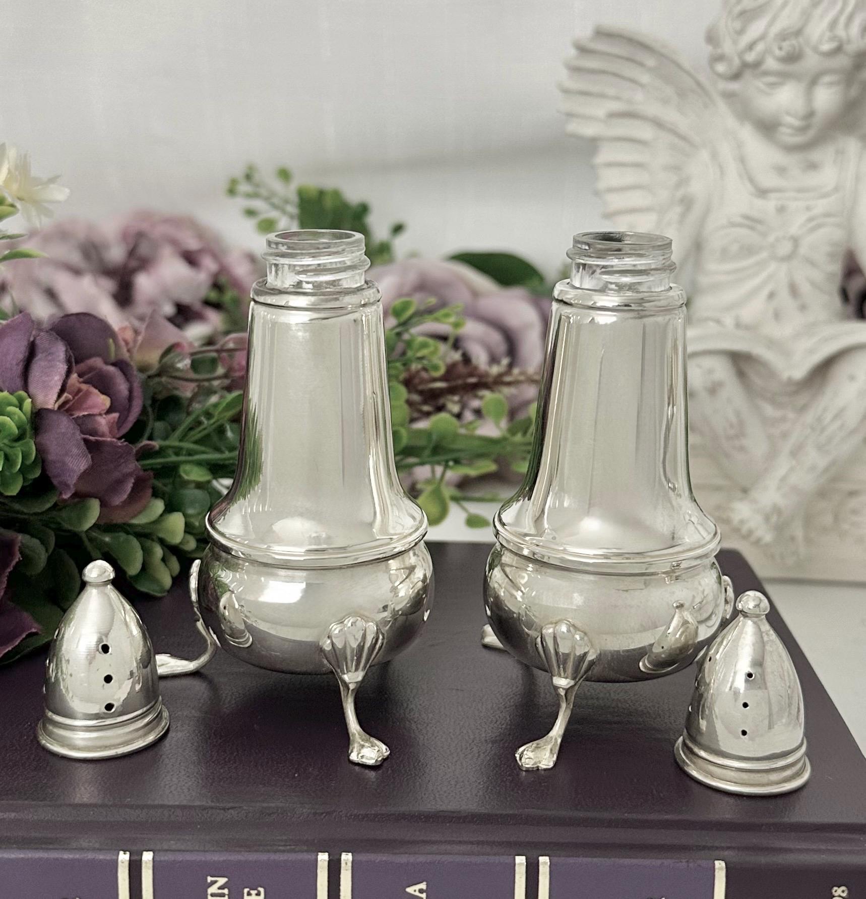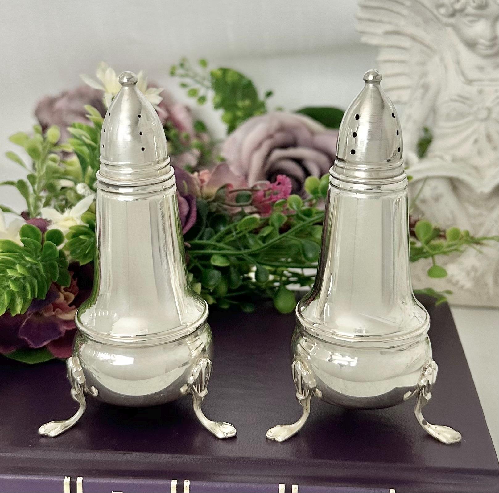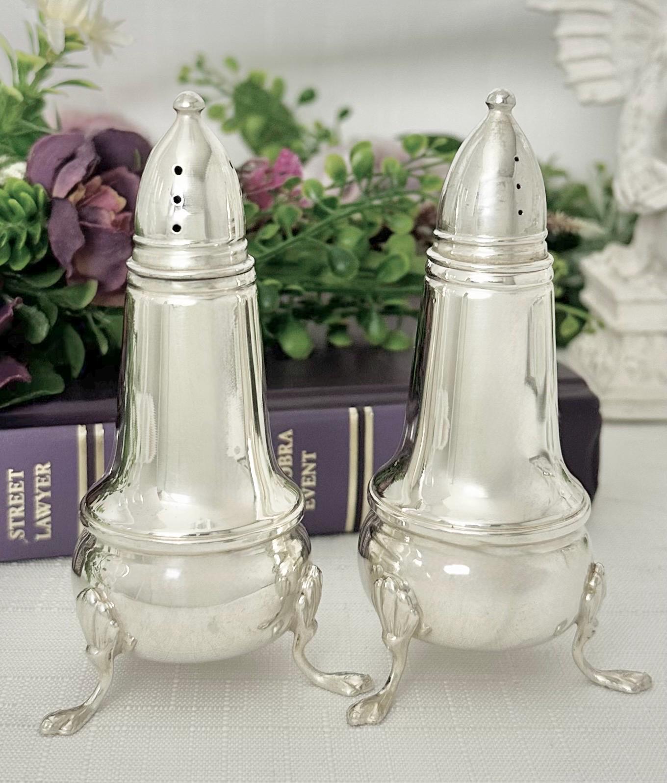 This is for a vintage Crown Sterling Silver Salt and Pepper Shaker Set. These are a luxurious set featuring a Claw footed design. Made of fine sterling silver (.925) and lined with glass, these shakers add a touch of elegance to any table setting. These measure approx 4.25 inches tall.