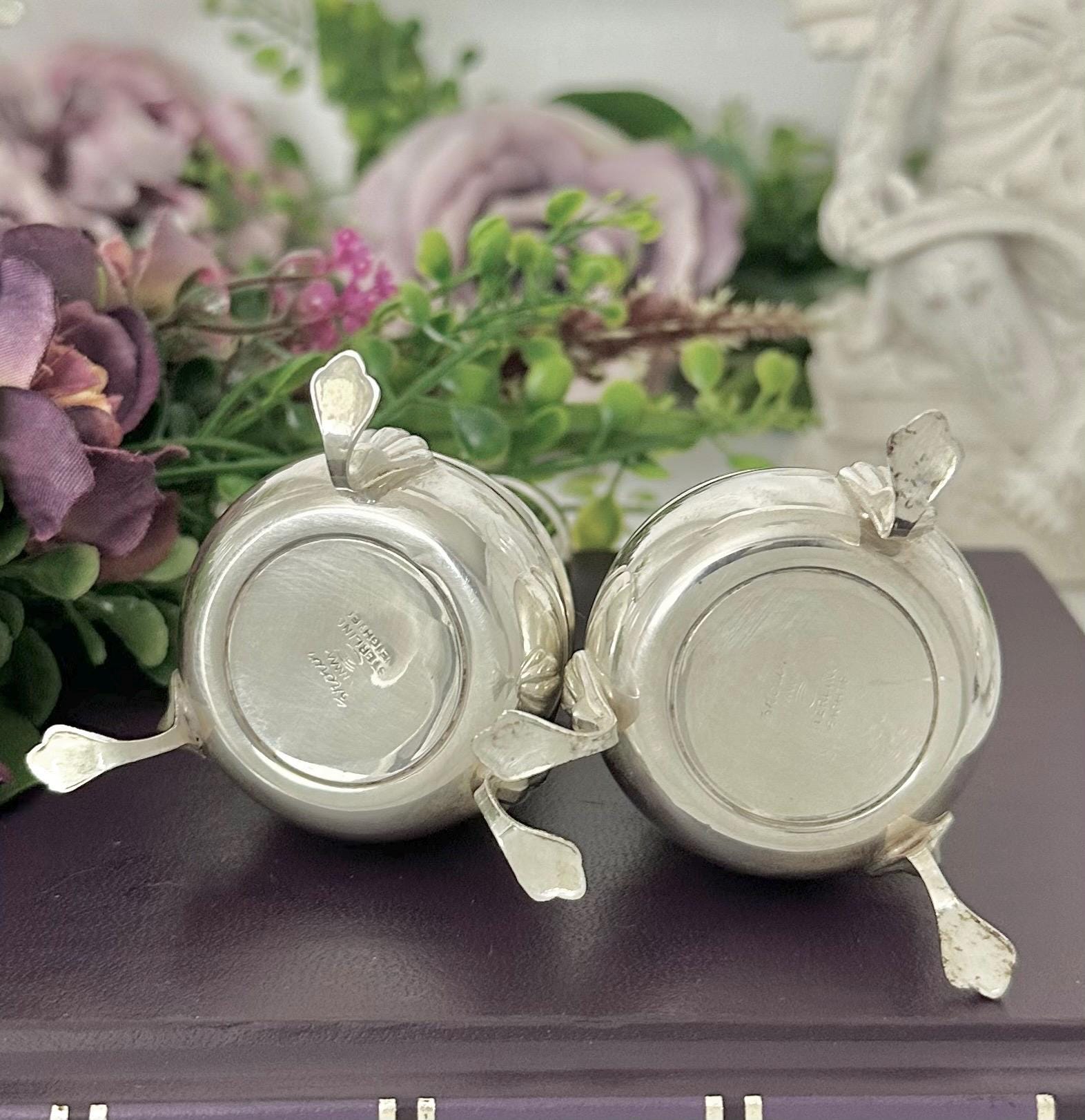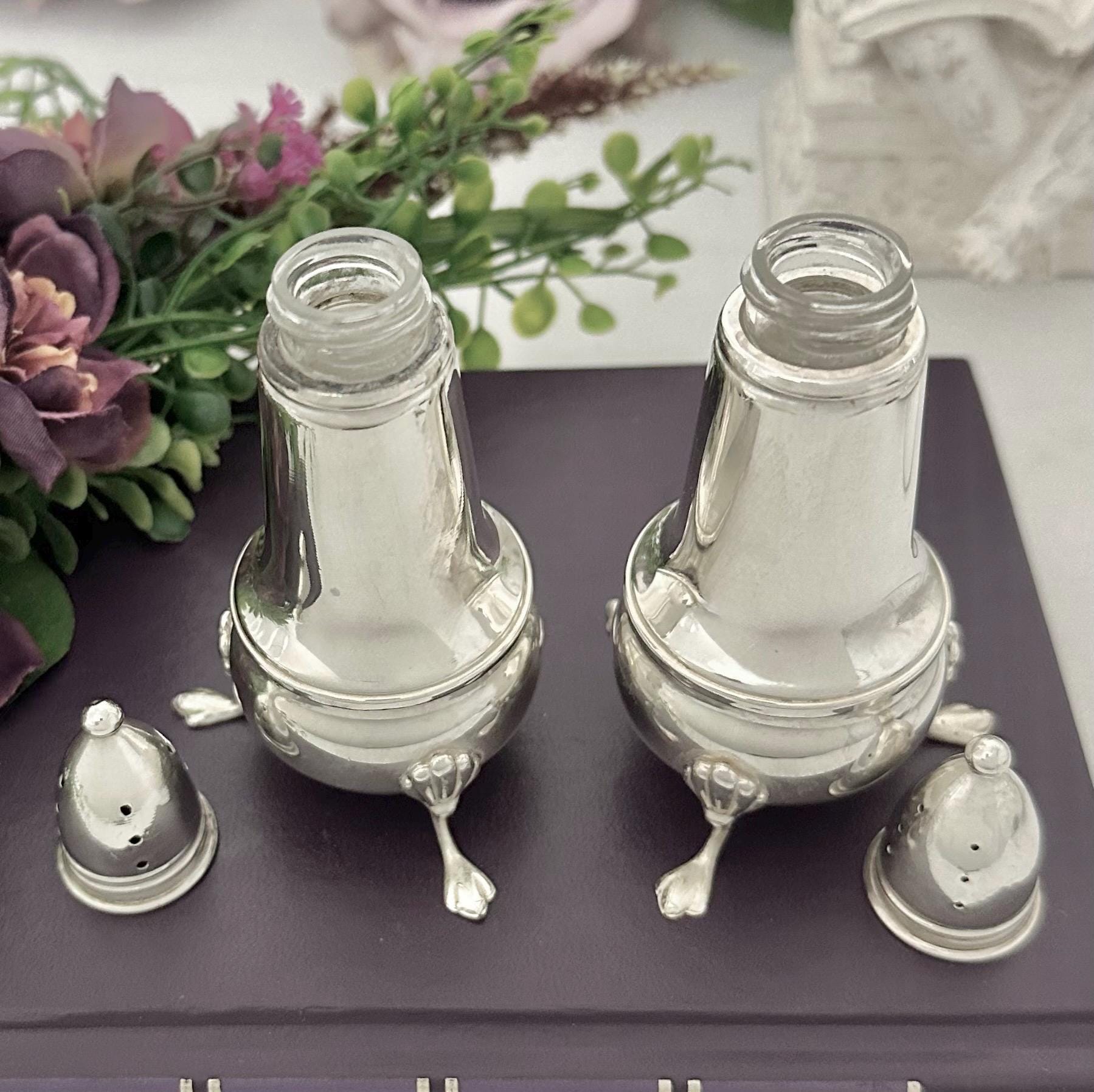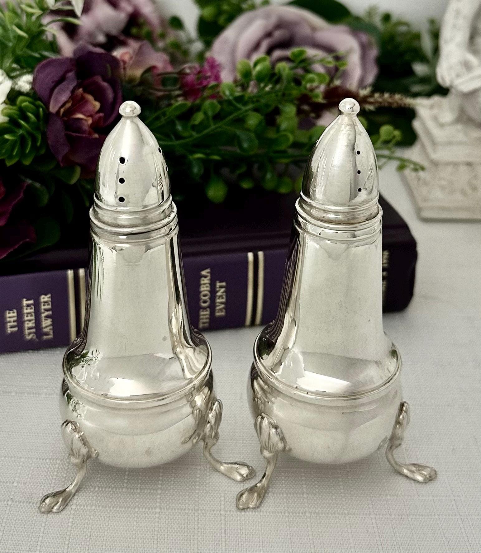 This is for a vintage Crown Sterling Silver Salt and Pepper Shaker Set. These are a luxurious set featuring a Claw footed design. Made of fine sterling silver (.925) and lined with glass, these shakers add a touch of elegance to any table setting. These measure approx 4.25 inches tall.