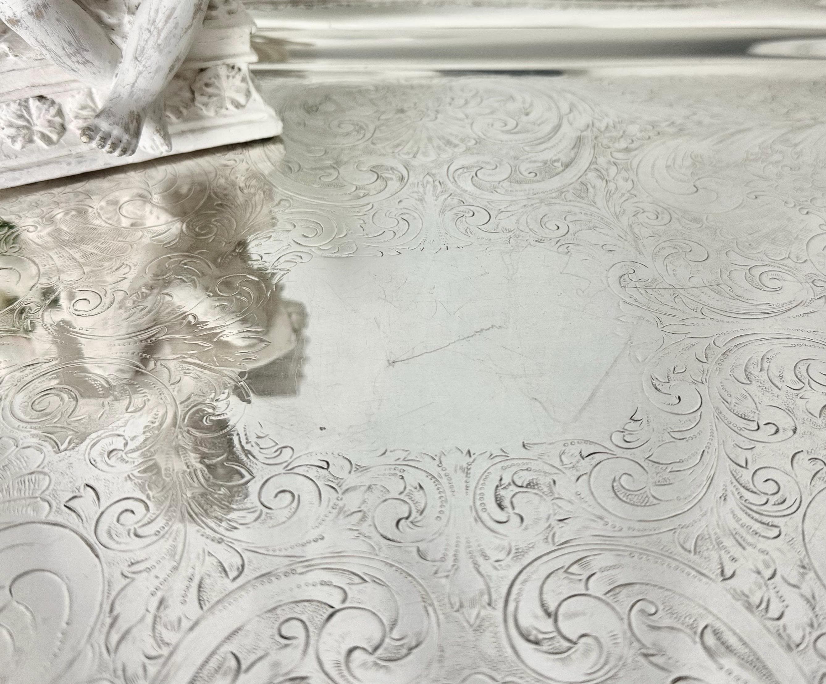 Made of silverplate metal with a footed design, this tray features intricate details and a classic silver plated finish. With dimensions of 17 inches in depth, 28.5 inches in width, and 2 inches in height, it is a versatile piece that can be used for serving drinks, placed on a bar cart or as a stylish decorative accent in any home. Perfect for adding a touch of vintage charm to any room.