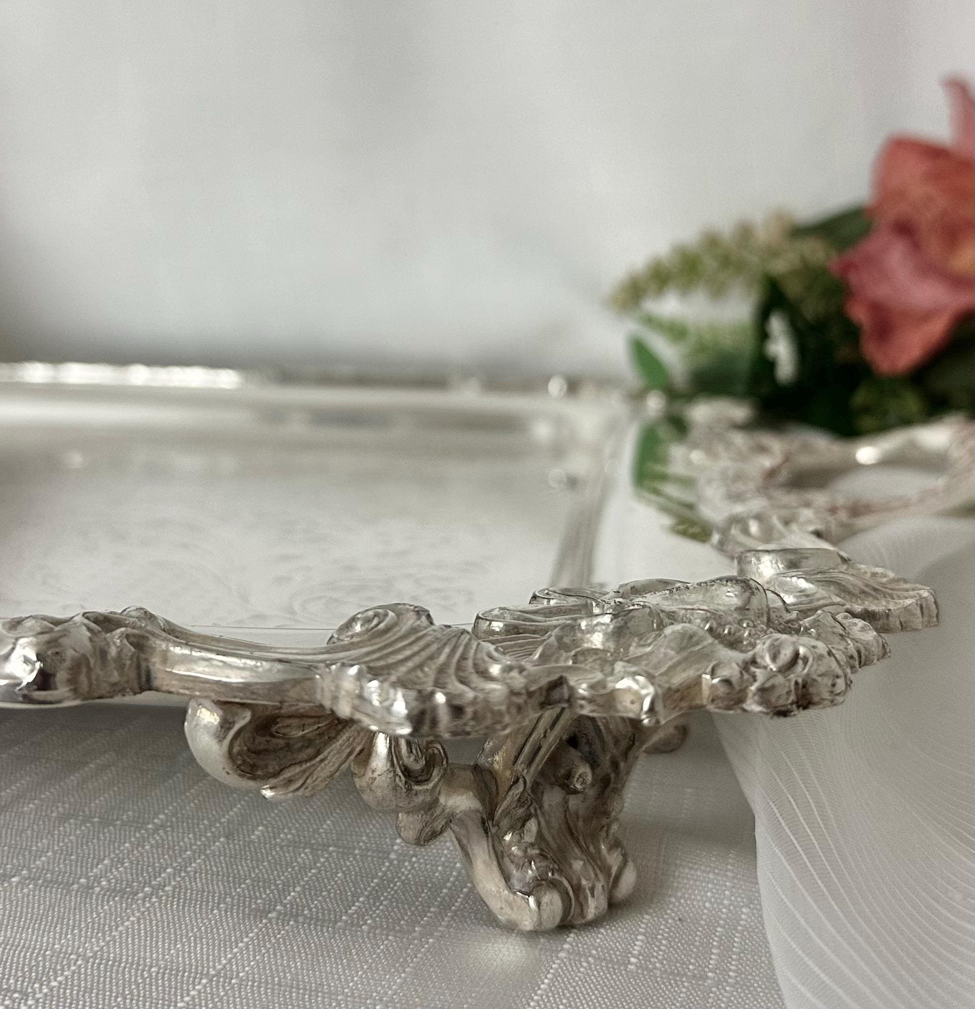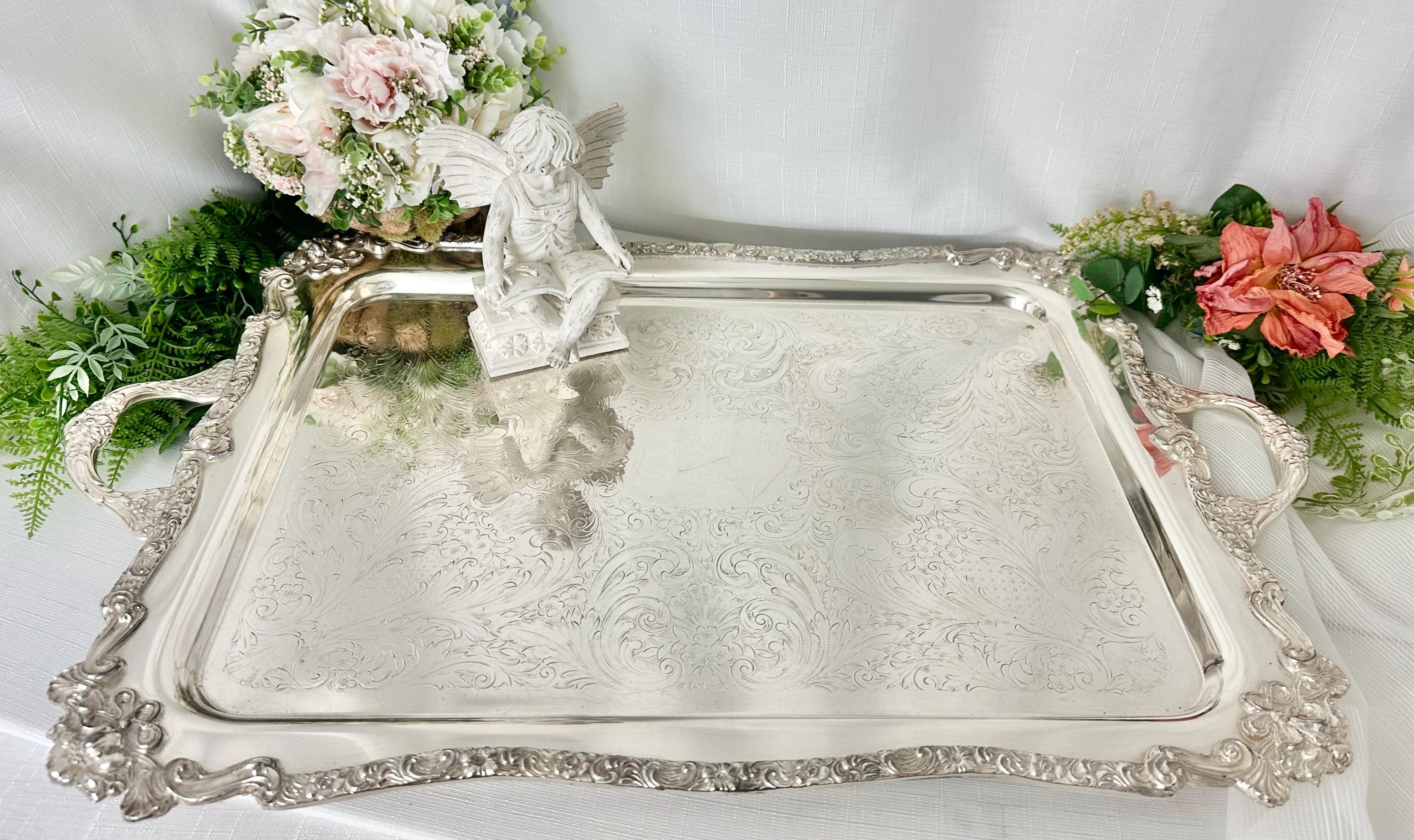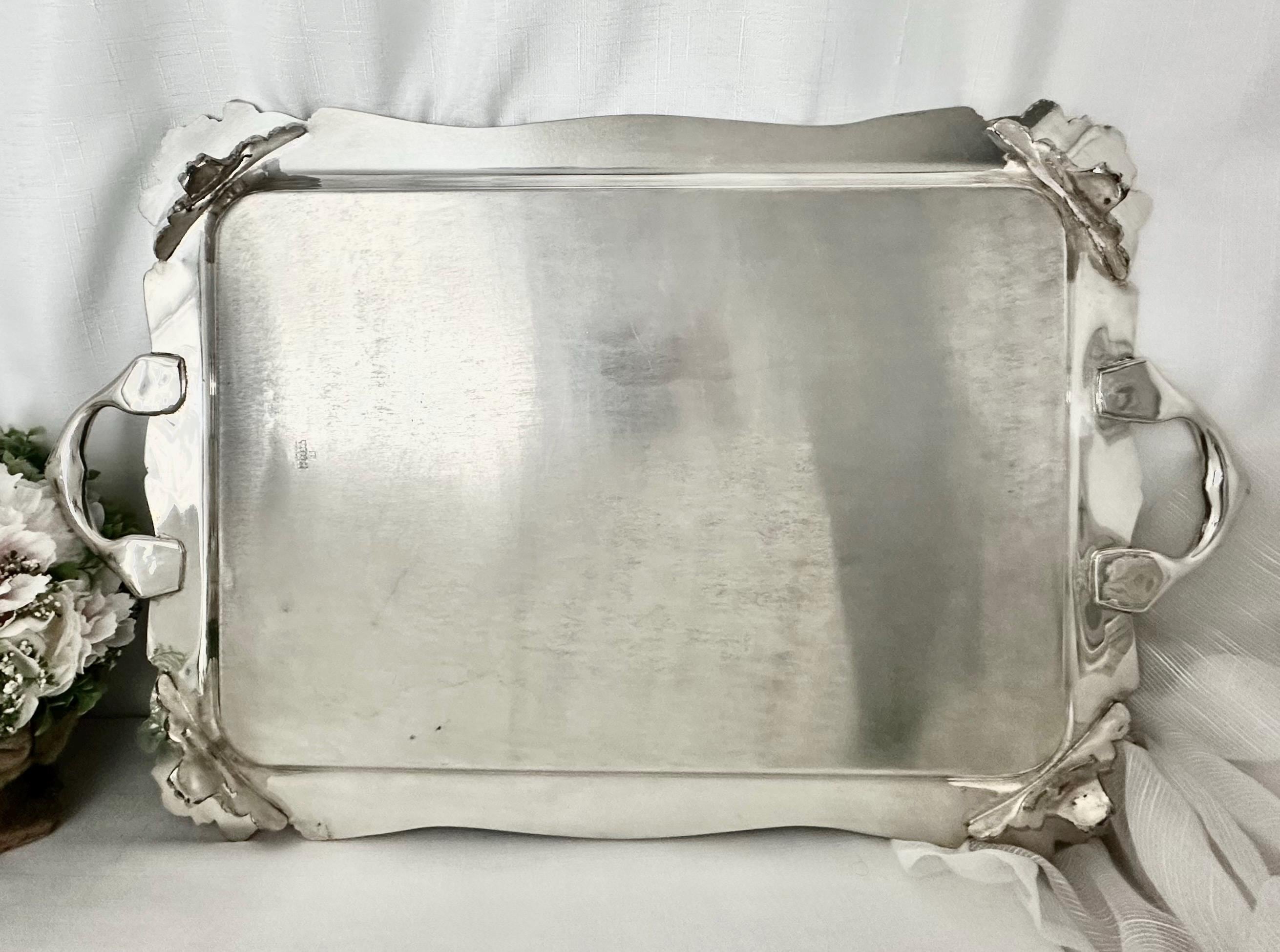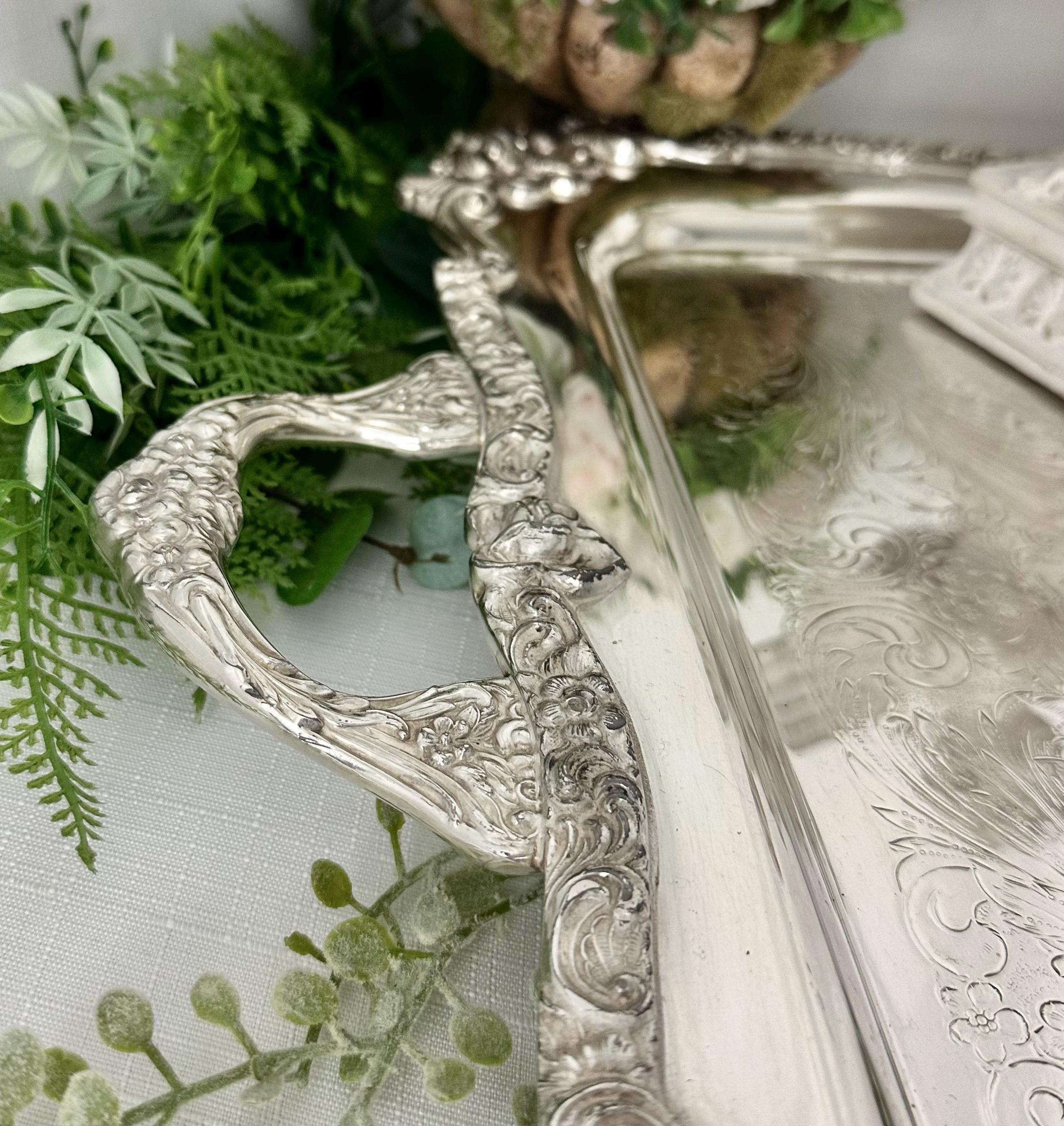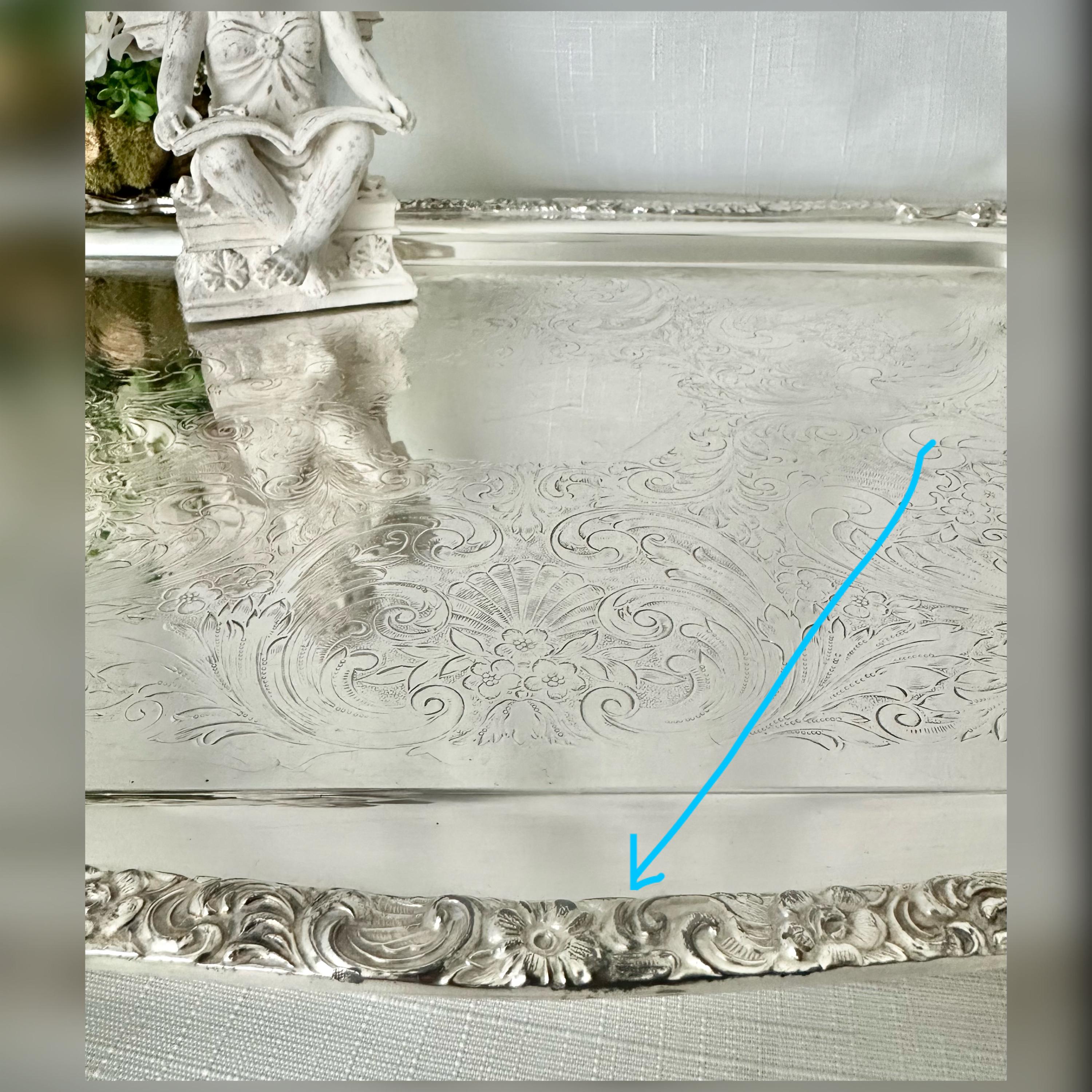 The Vintage Silverplate Butlers Serving Tray. This looks like makers mark of Sheridan. This piece is a large and ornate platter that exudes a vintage Victorian style.
