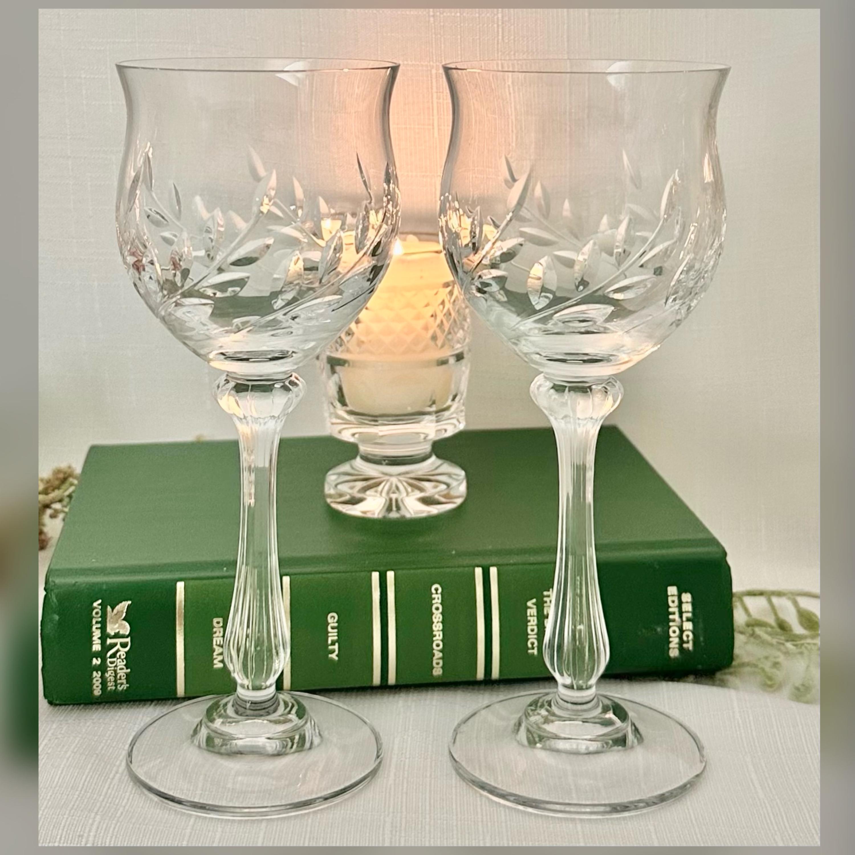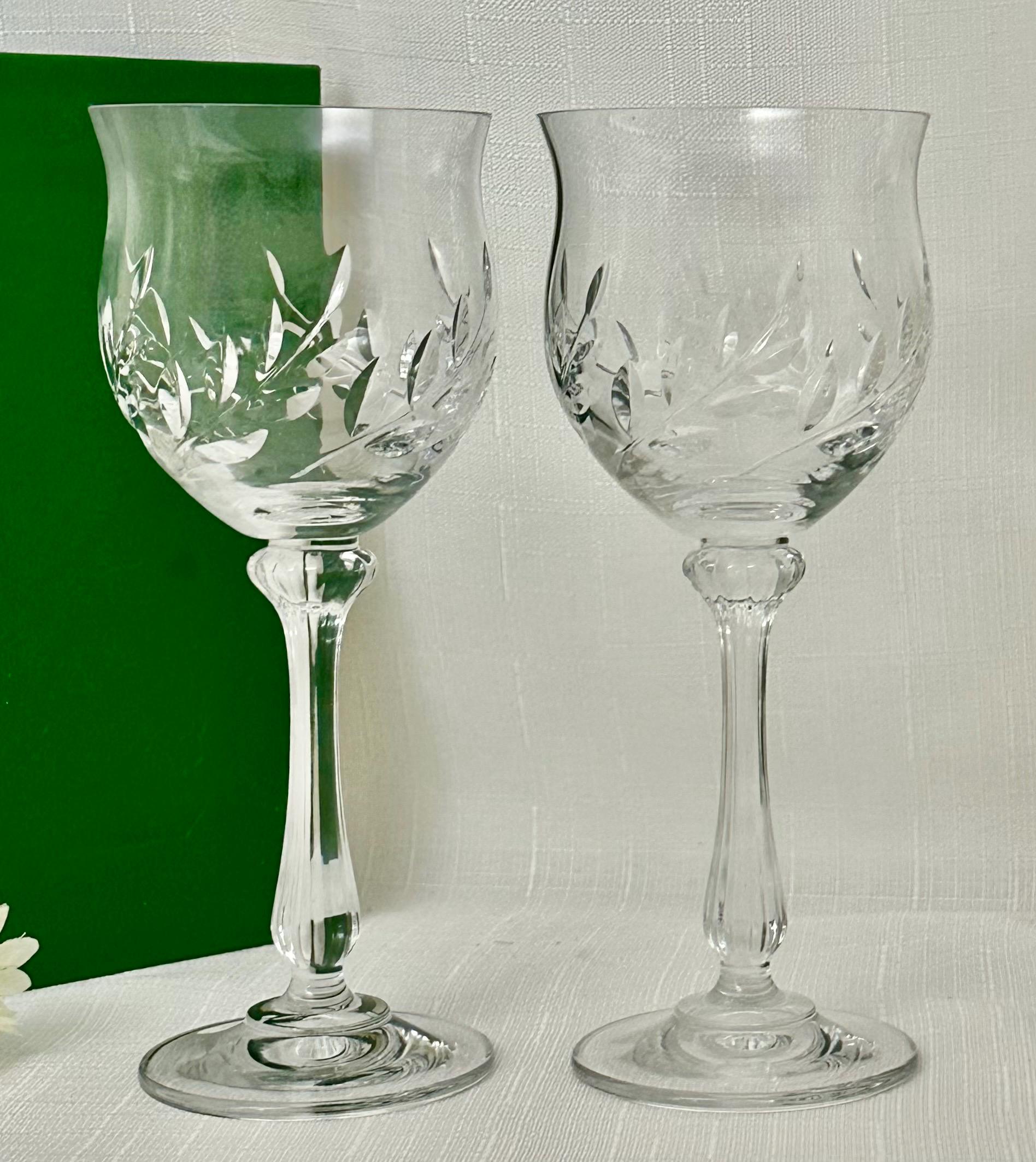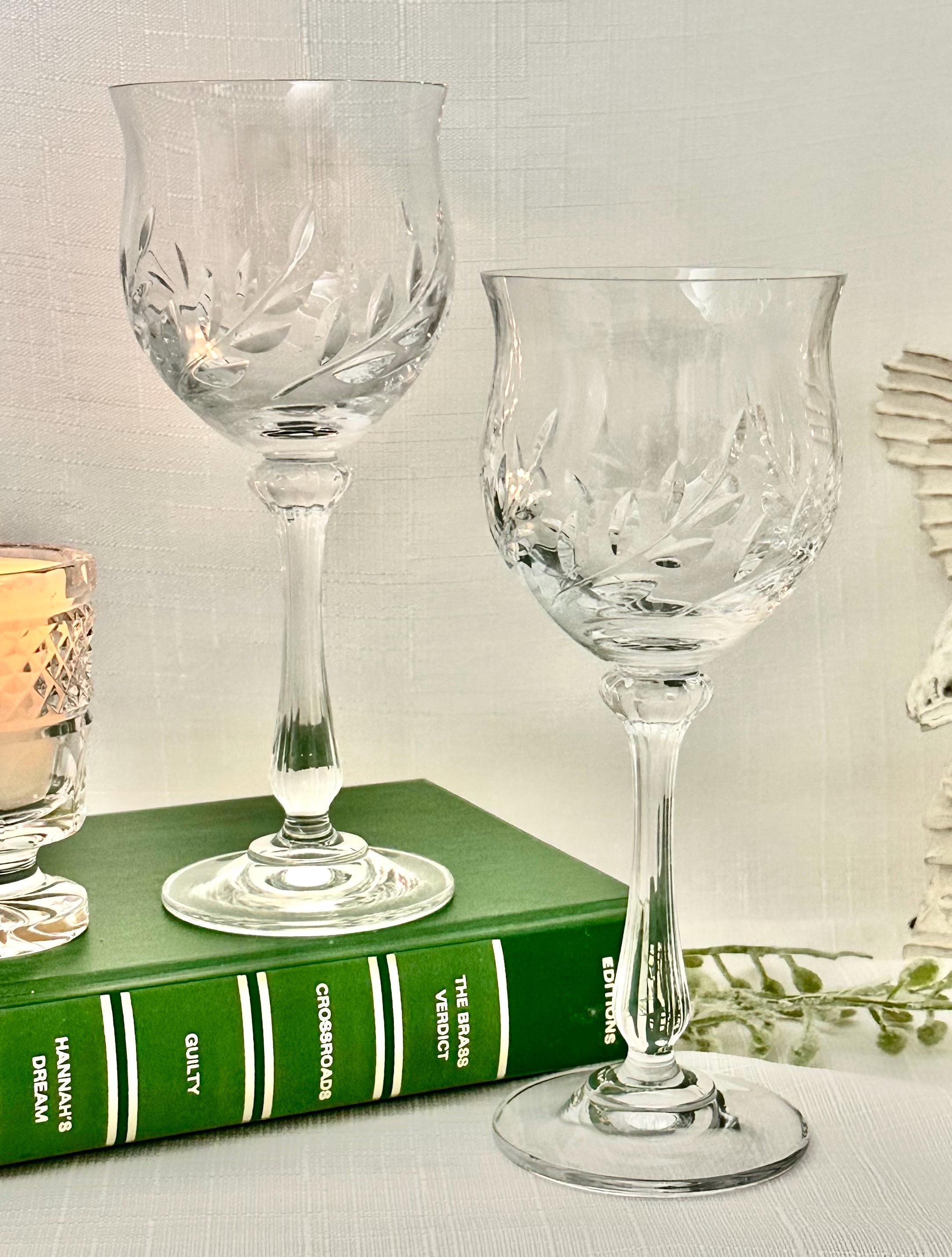 This is for 2 Mikasa Versailles Wine Glasses. The vintage replacement goblets are cut blown glass that are perfect for all occasions. Featuring a round shape and clear color, these stemmed wine glasses are made of glass with a traditional design of cut leaves and a decorative stem.