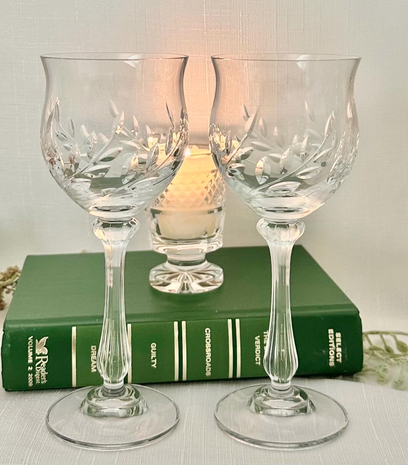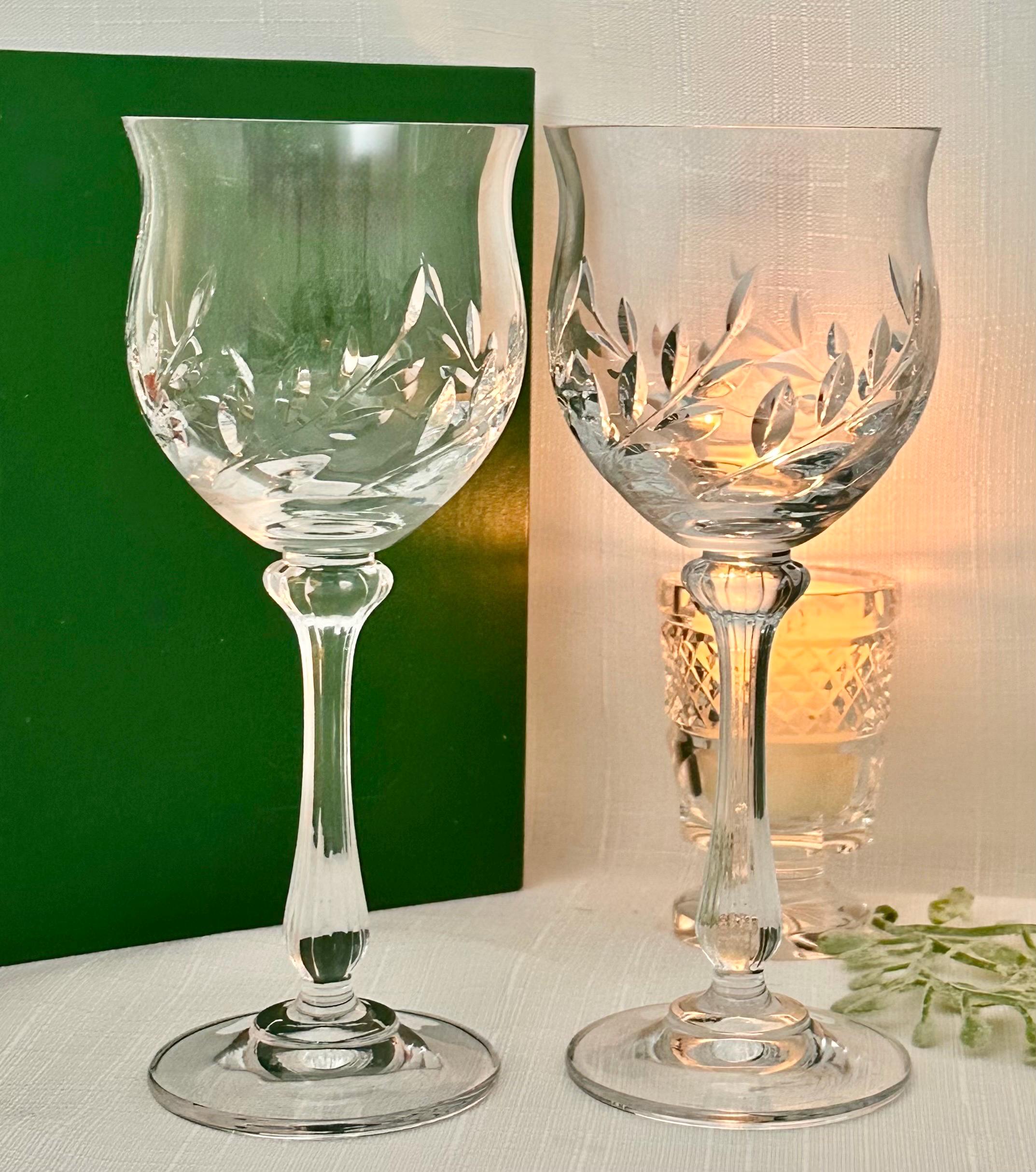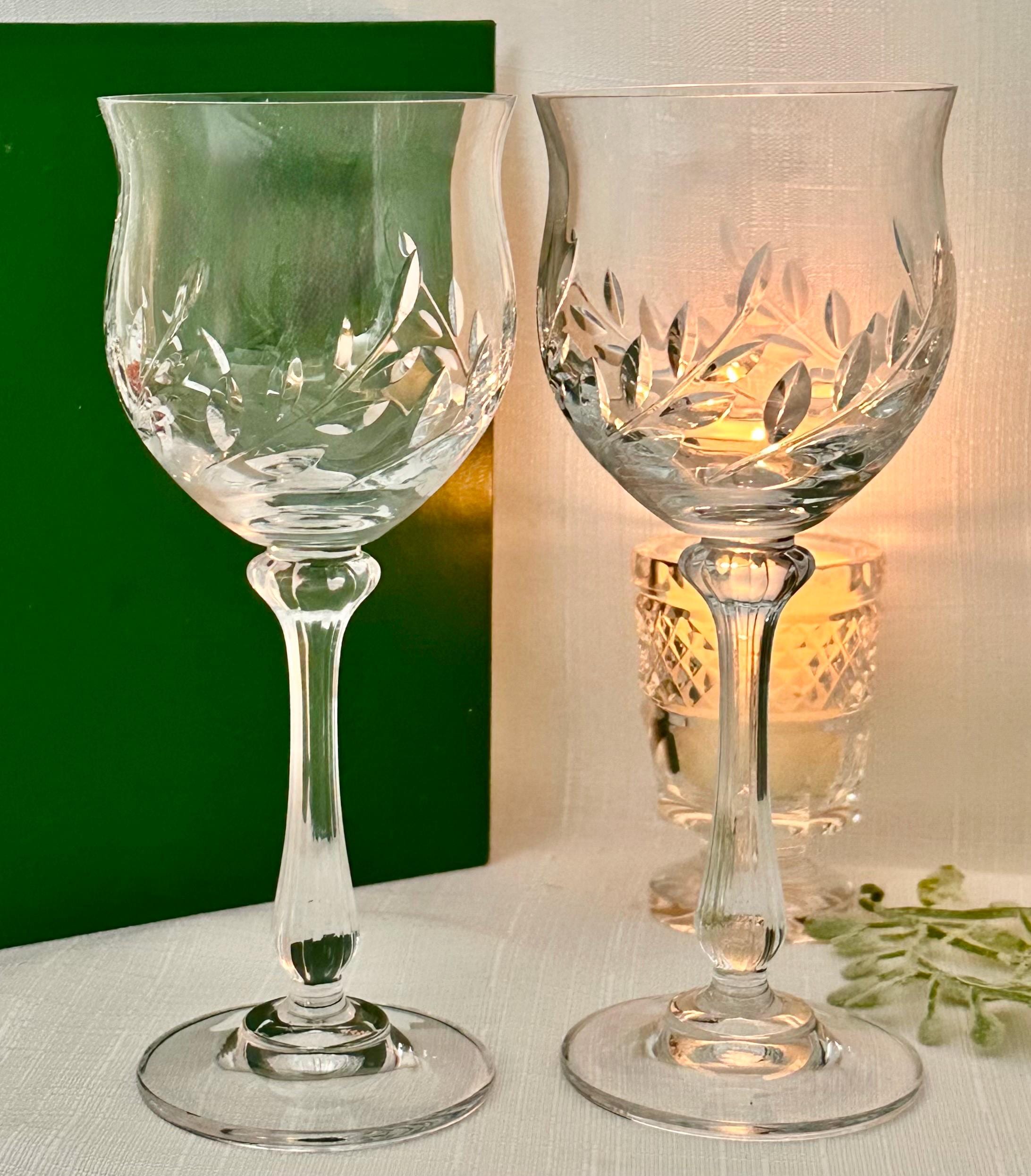 This is for 2 Mikasa Versailles Wine Glasses. The vintage replacement goblets are cut blown glass that are perfect for all occasions. Featuring a round shape and clear color, these stemmed wine glasses are made of glass with a traditional design of cut leaves and a decorative stem.