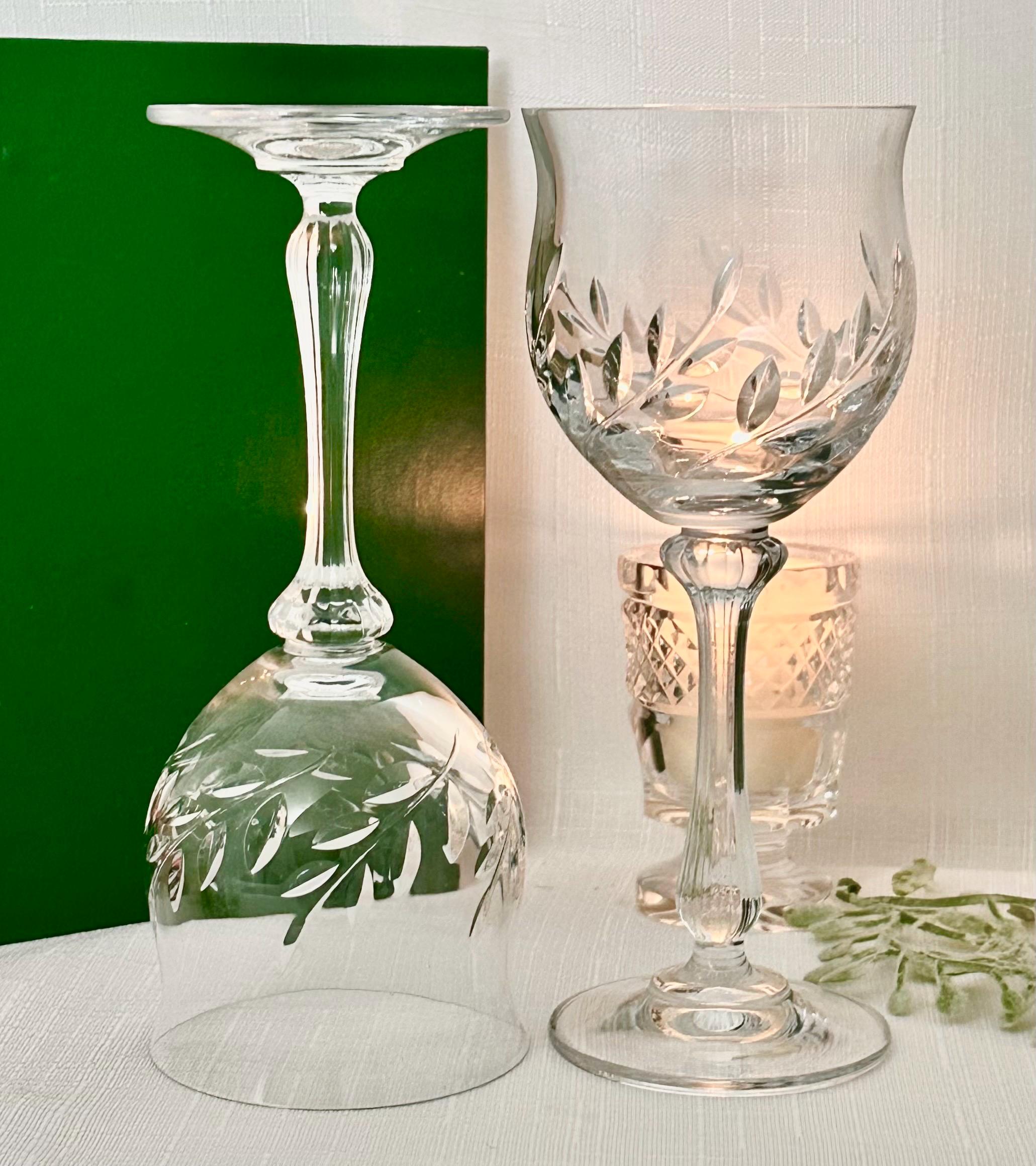 The glasses have a diameter of 2 7/8 inches and a height of 7 1/8 inches, making them ideal for serving cold beverages from wine to water. Care instructions are recommended hand washing only. The glasses have a cut bowl with a leave pattern, adding a touch of elegance to any table setting.
