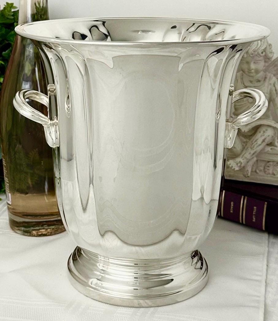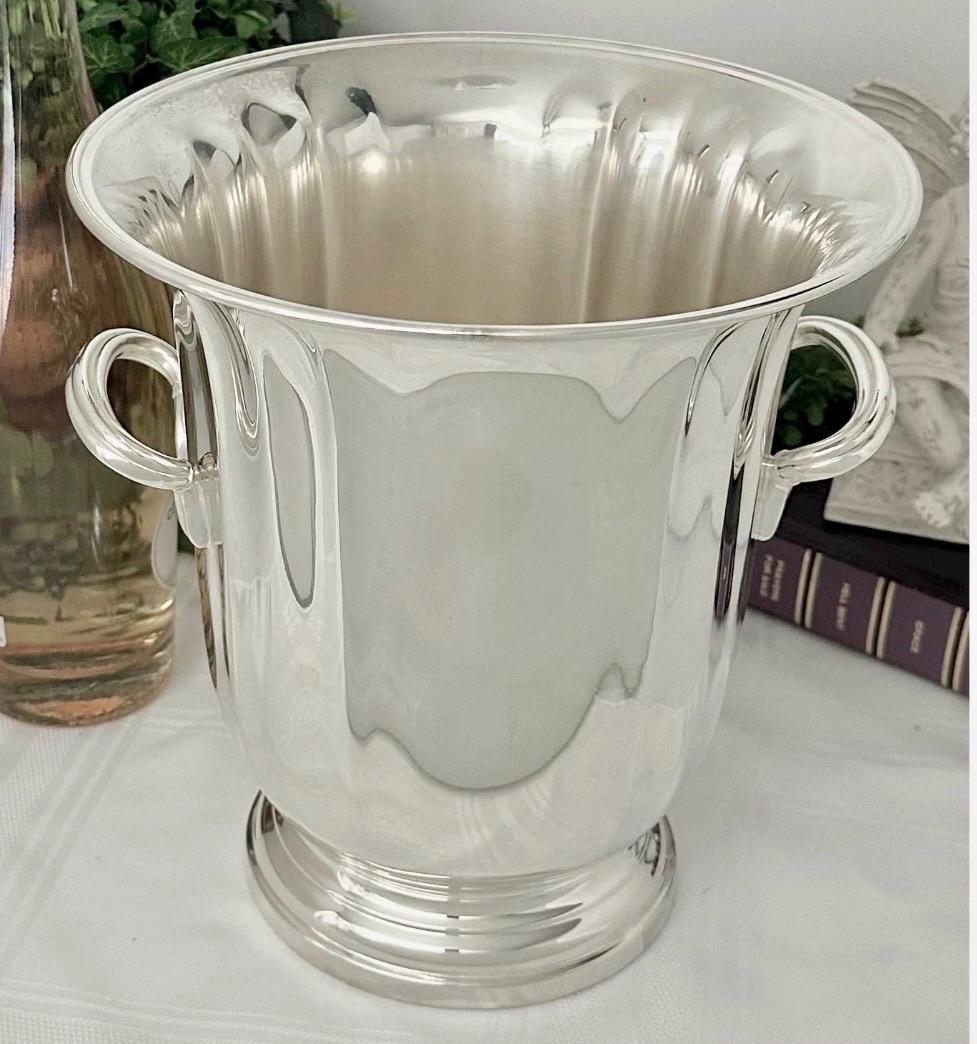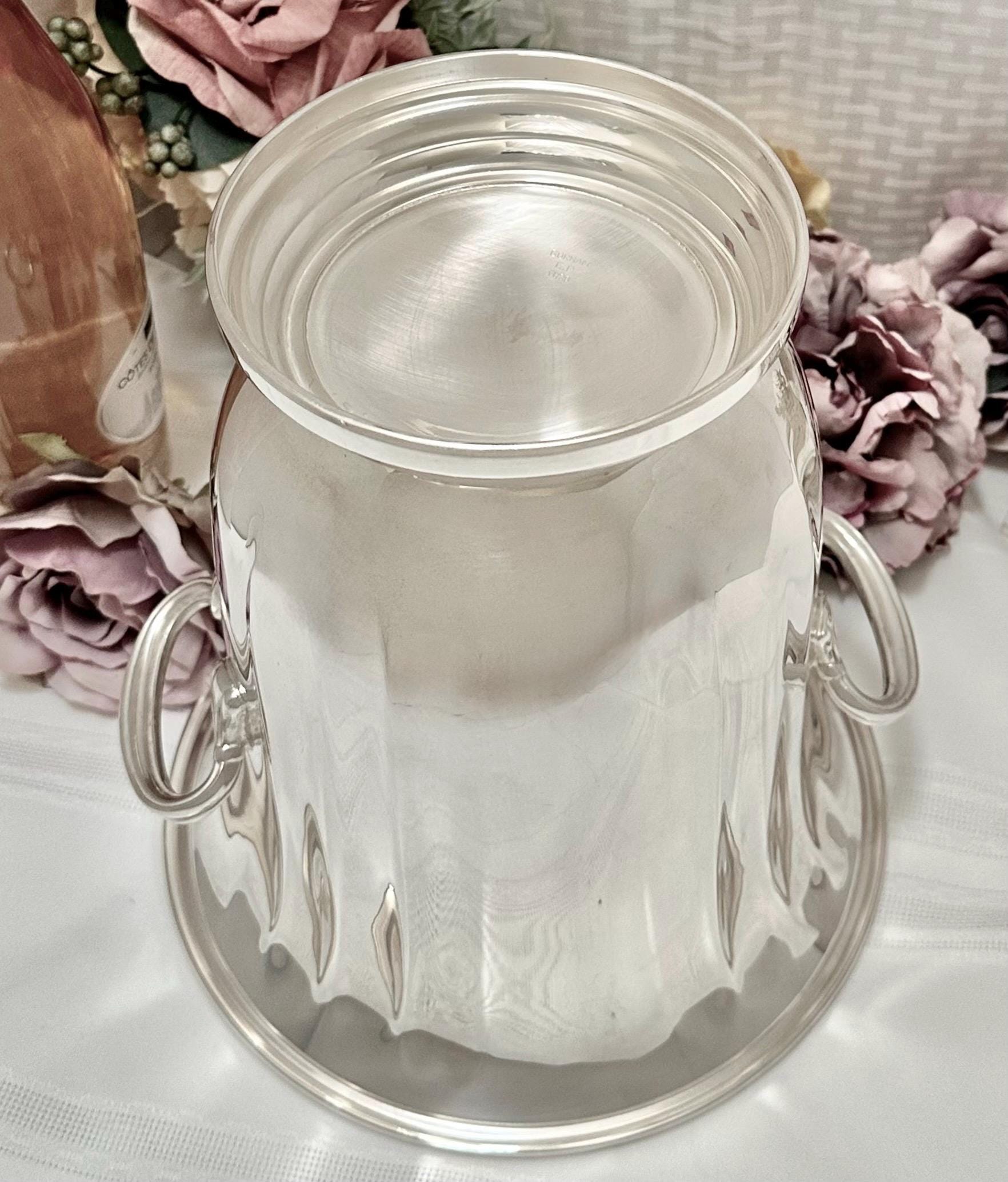 The vintage champagne bucket has handles on the sides a fluted style rim, the makers marks on the base while measuring approx 9.5 inches tall x 9.5 inches wide x 9 inches in diameter.