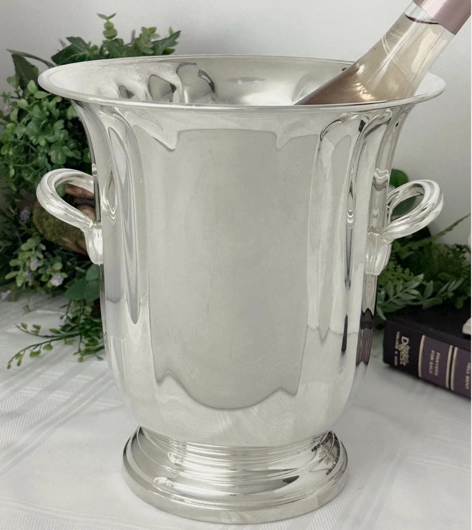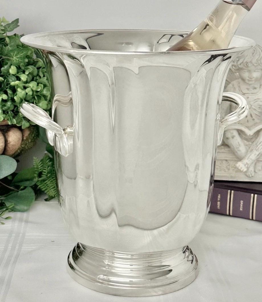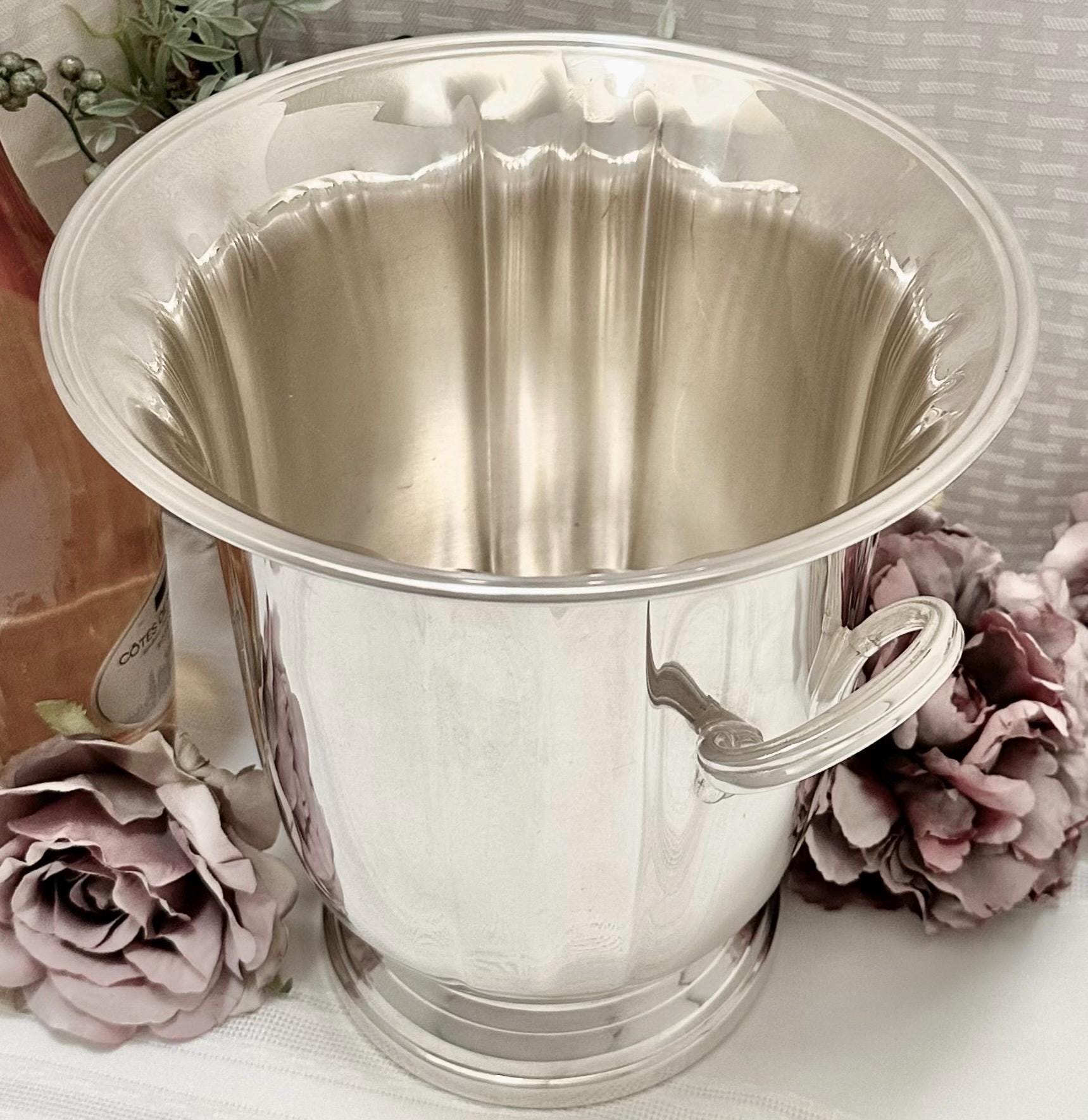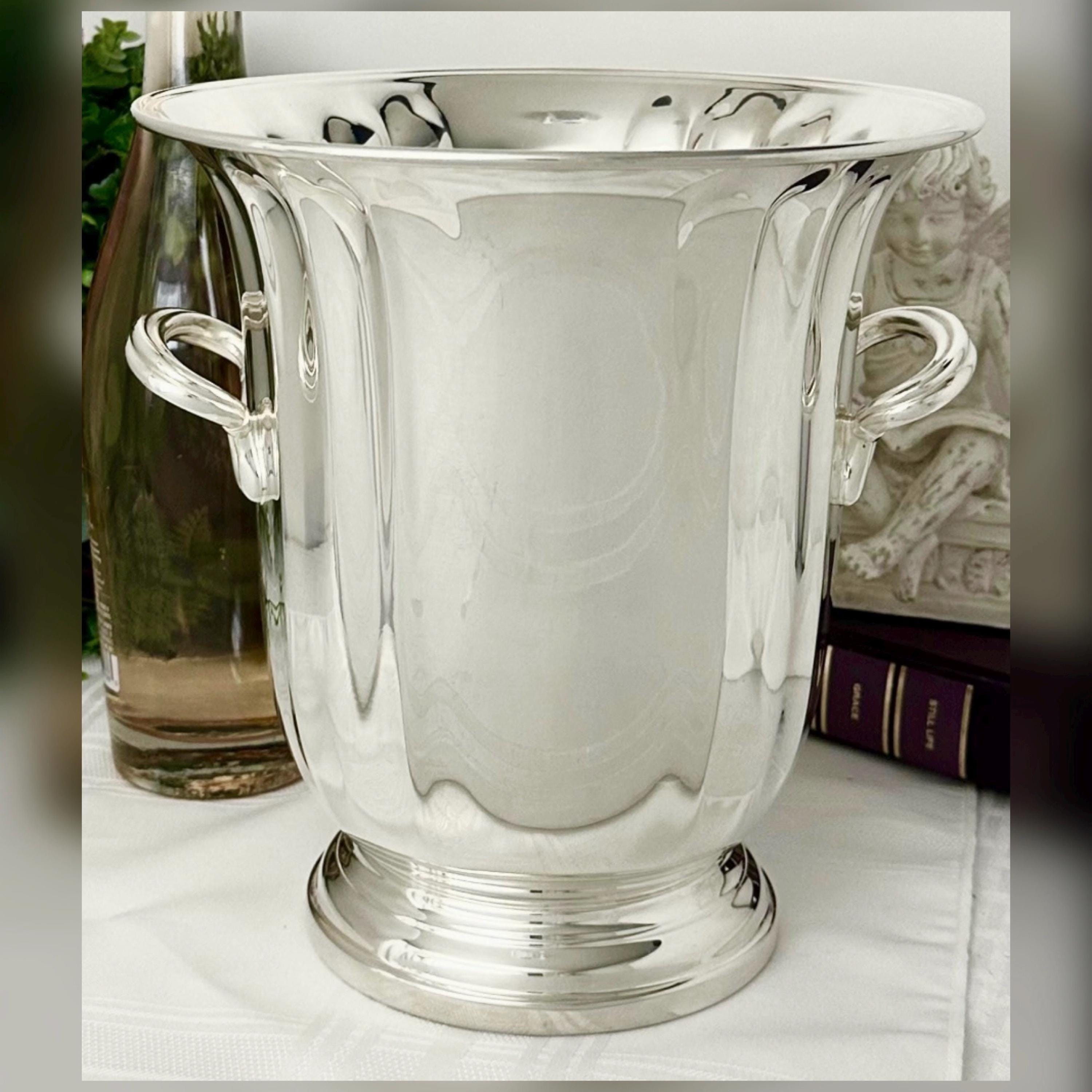 The vintage champagne bucket has handles on the sides a fluted style rim, the makers marks on the base while measuring approx 9.5 inches tall x 9.5 inches wide x 9 inches in diameter.
